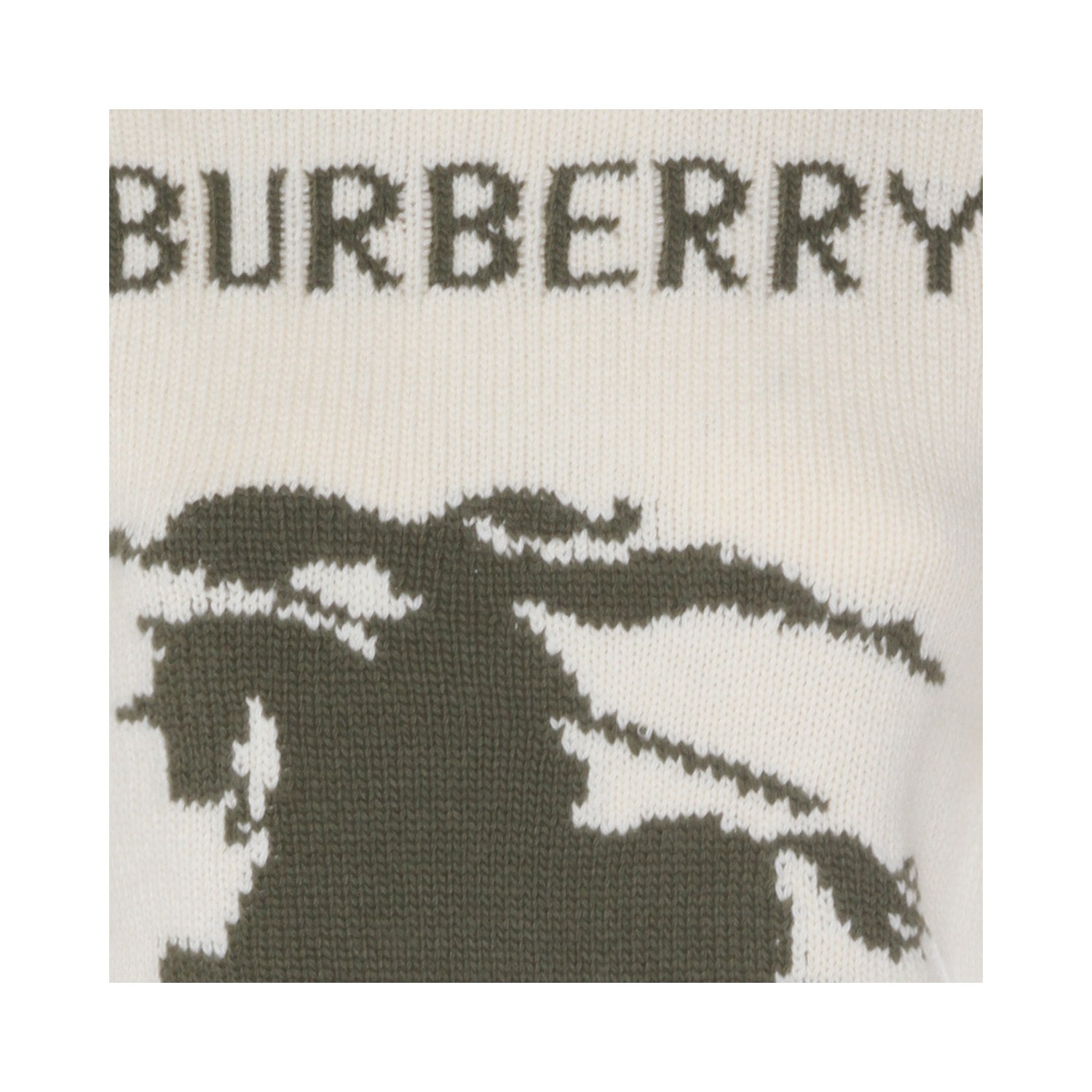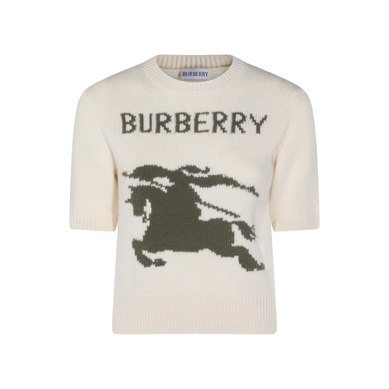 White wool and cashmere blend knitwear from Burberry featuring elbow sleeves, round neck and logo details at front.