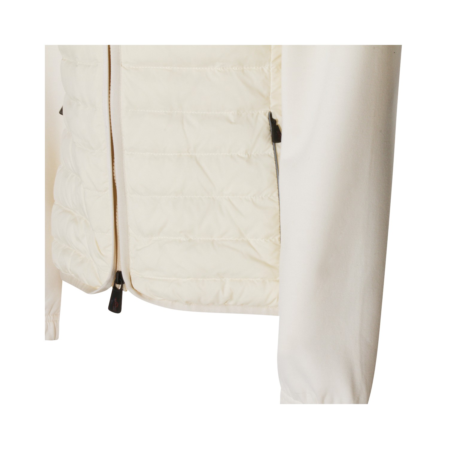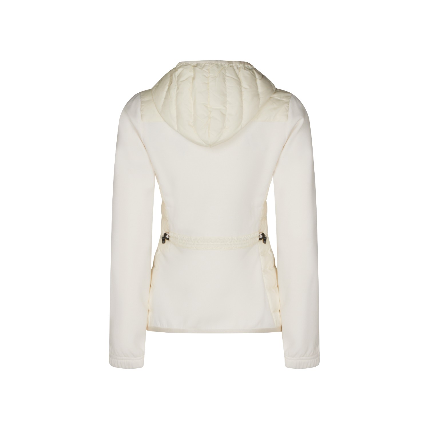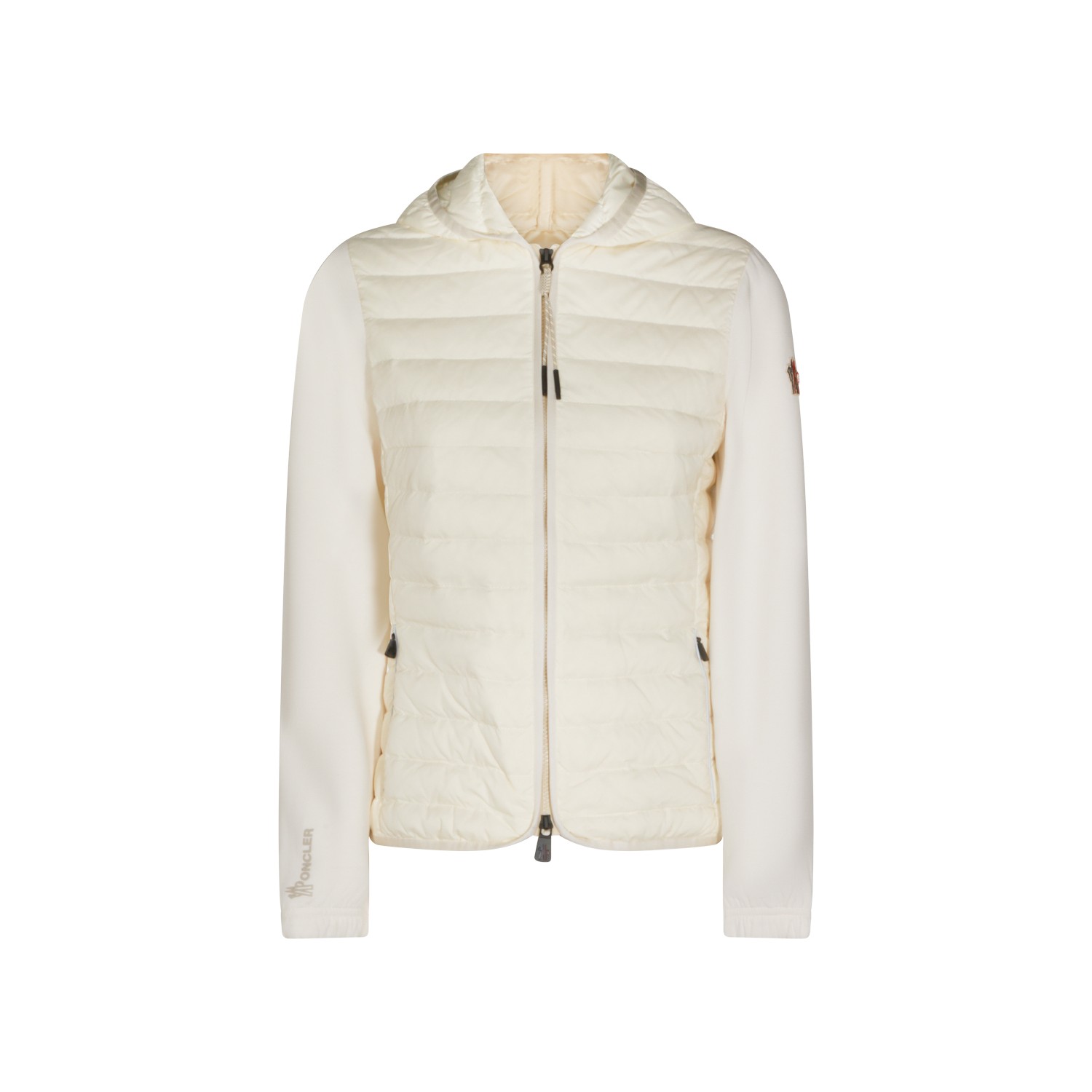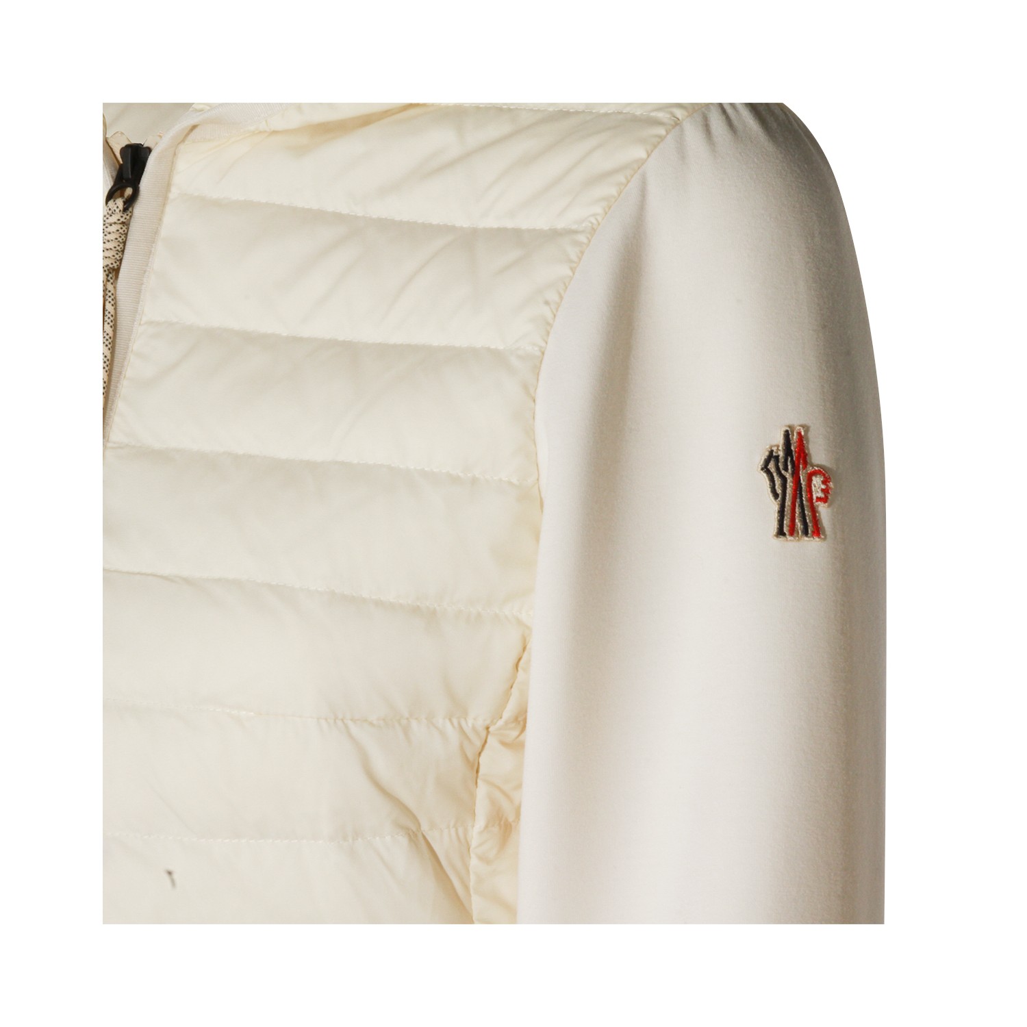 Ivory knitwear from Moncler Grenoble featuring hood, long sleeves, quilted, zip fastening, pockets, logo patch, curved hem and regular vestibility.