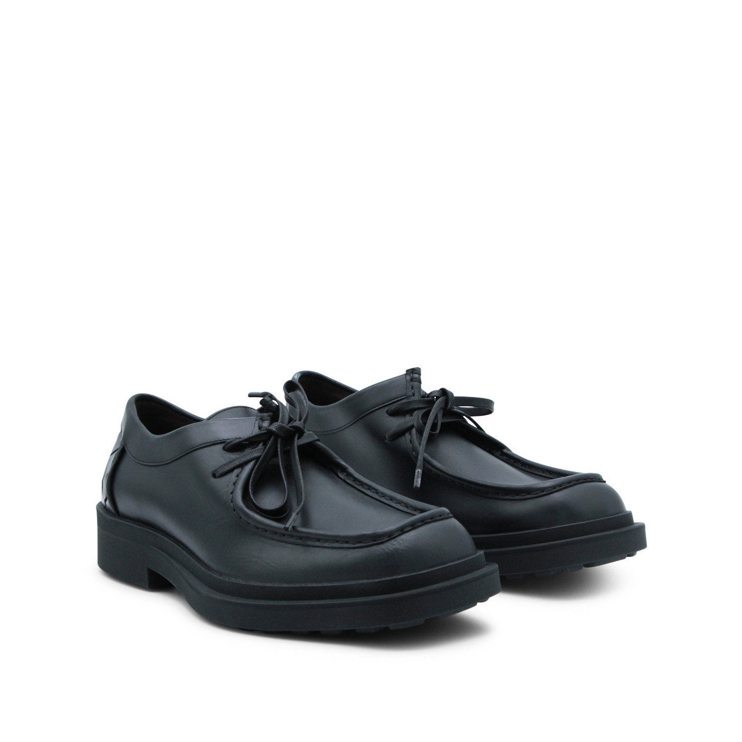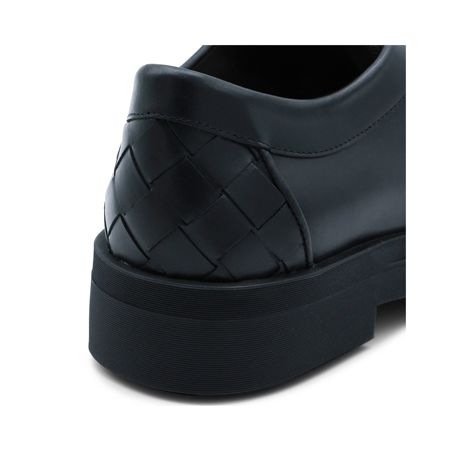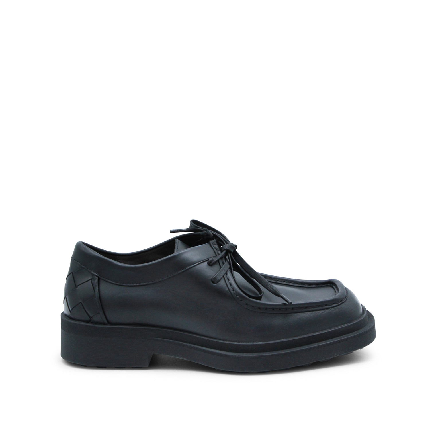Black leather lace up shoes from Bottega Veneta featuring square toe, lace up fastening, Intreccio pattern details and ridged rubber sole.