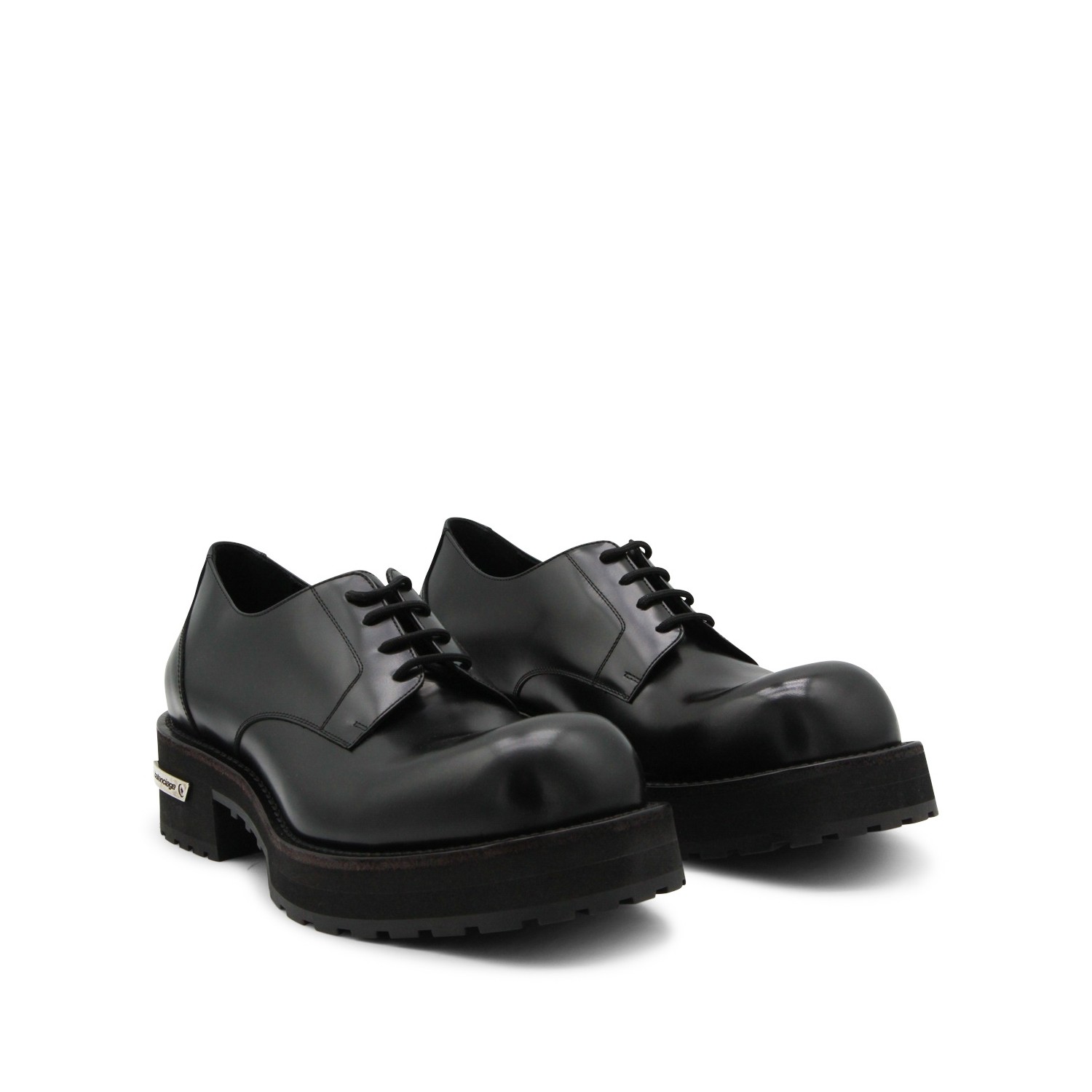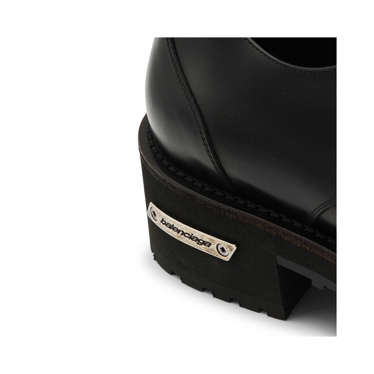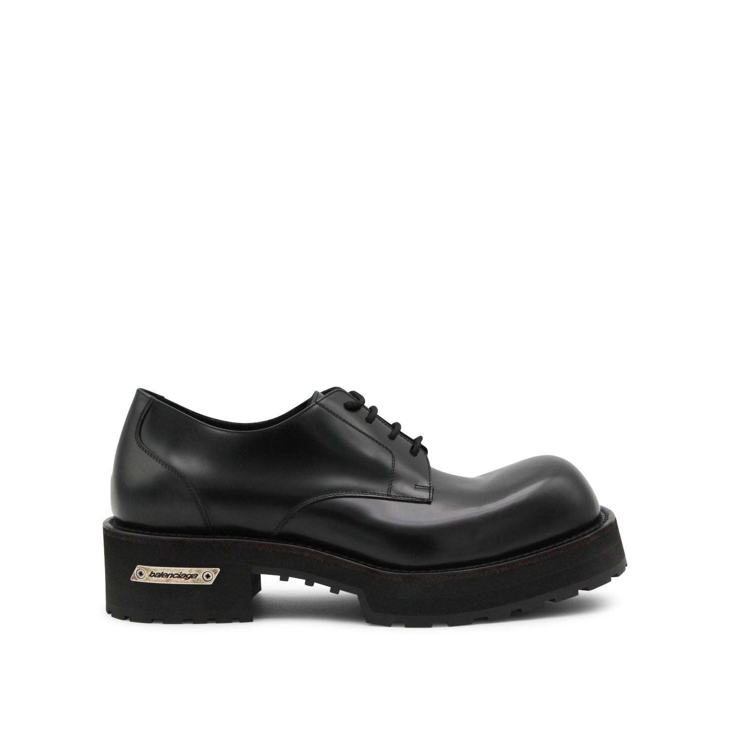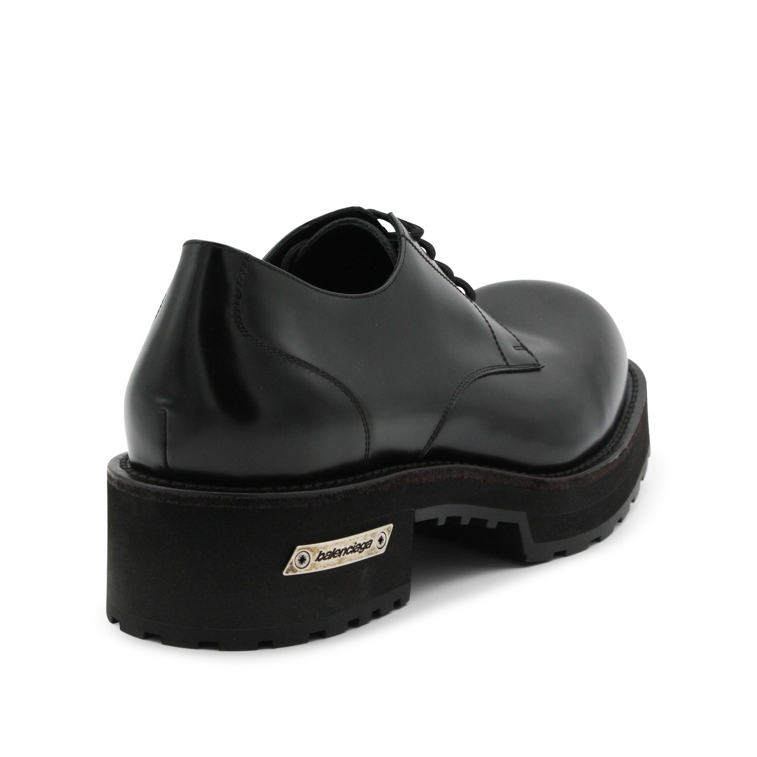 Black leather Derby Lace Up shoes from Balenciaga featuring ultra round toe, laces fastening, high leather sole and worn effect tag with logo engraved on the outer side of the sole.