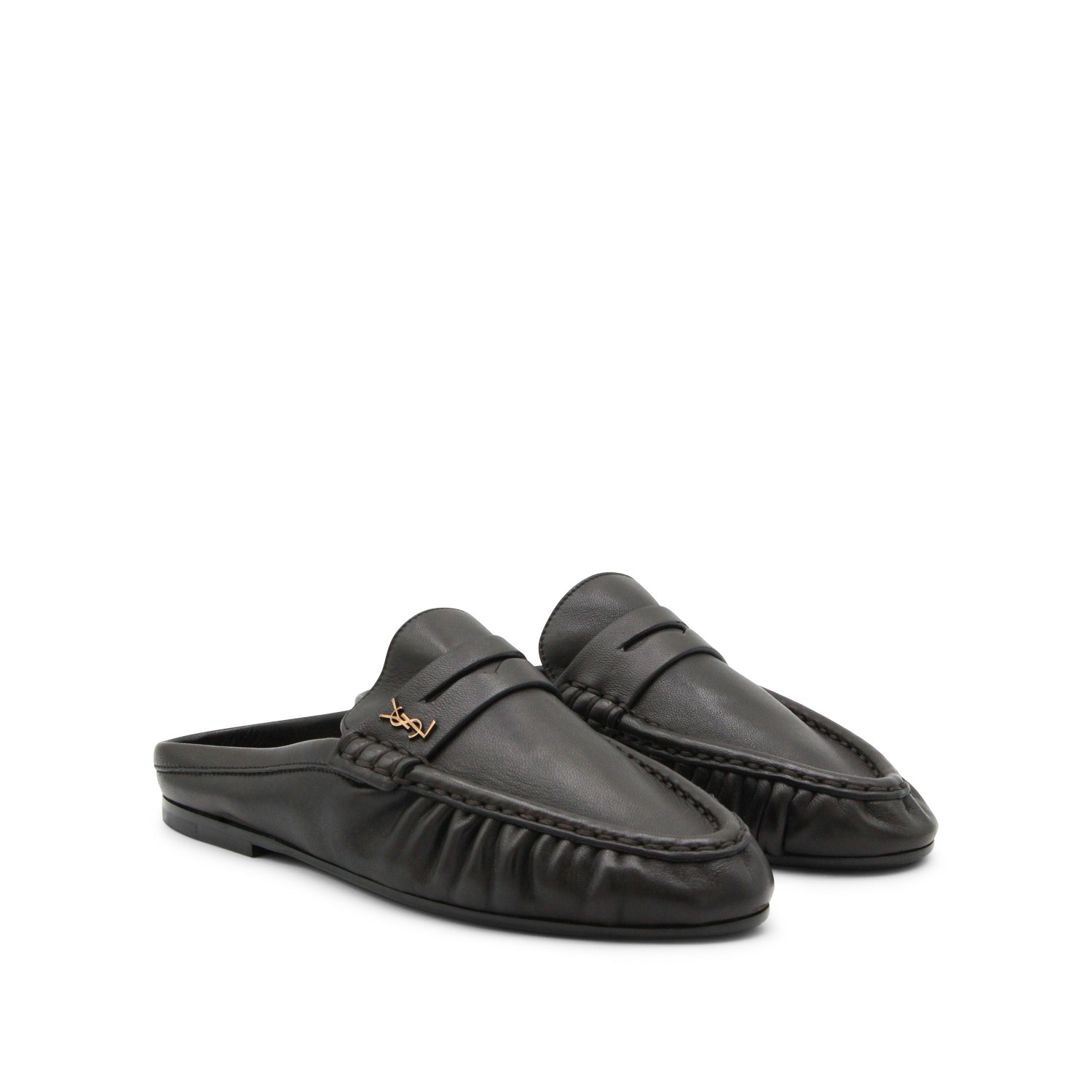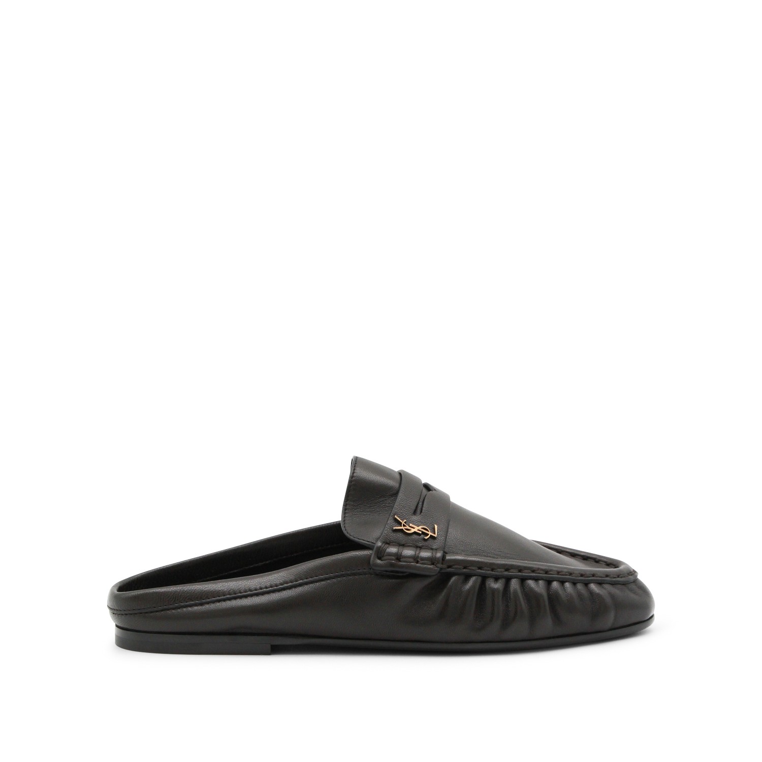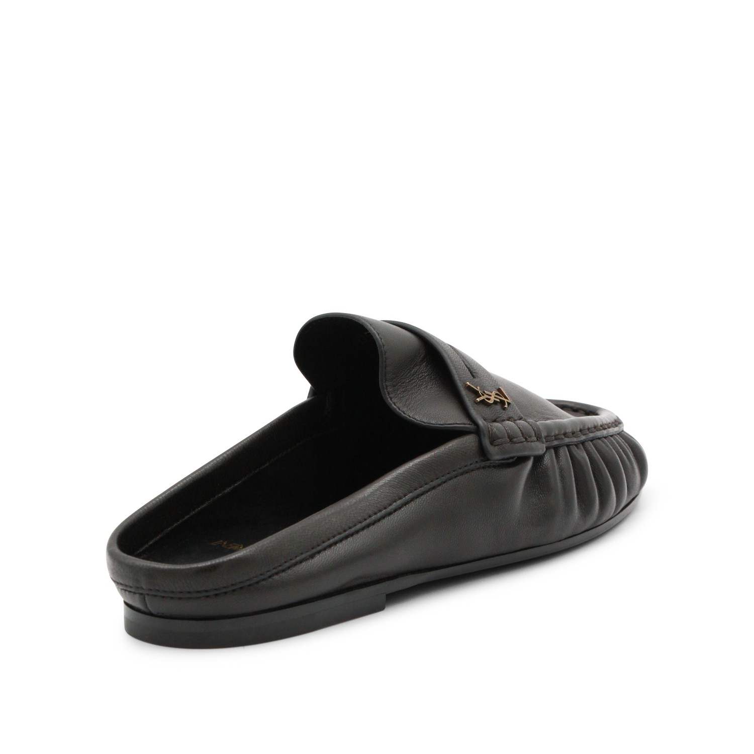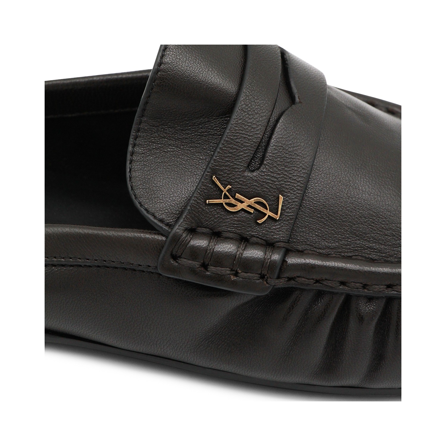 Eagle brown leather loafers from Saint Laurent featuring round toe, open back, slip-on style and gold tone logo.