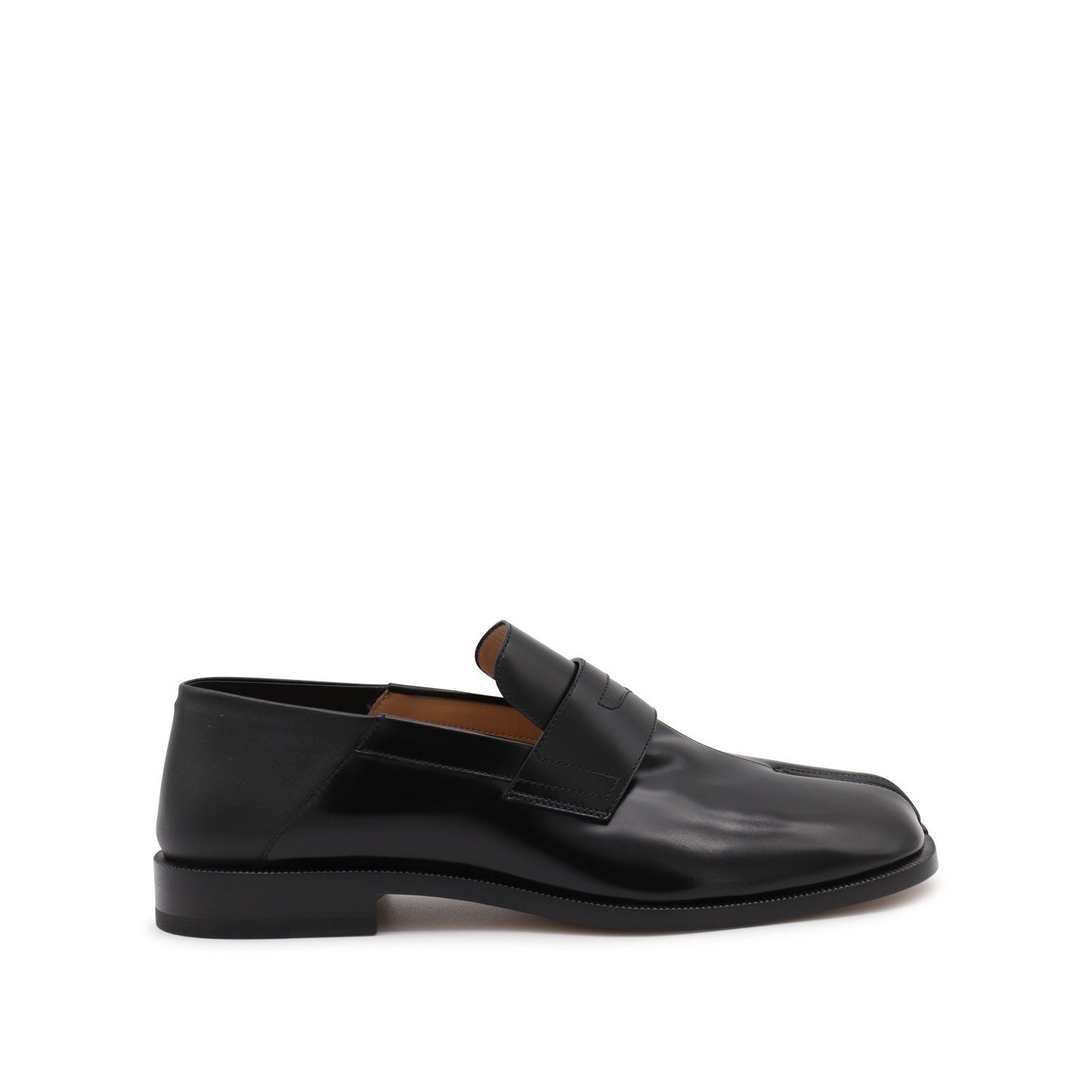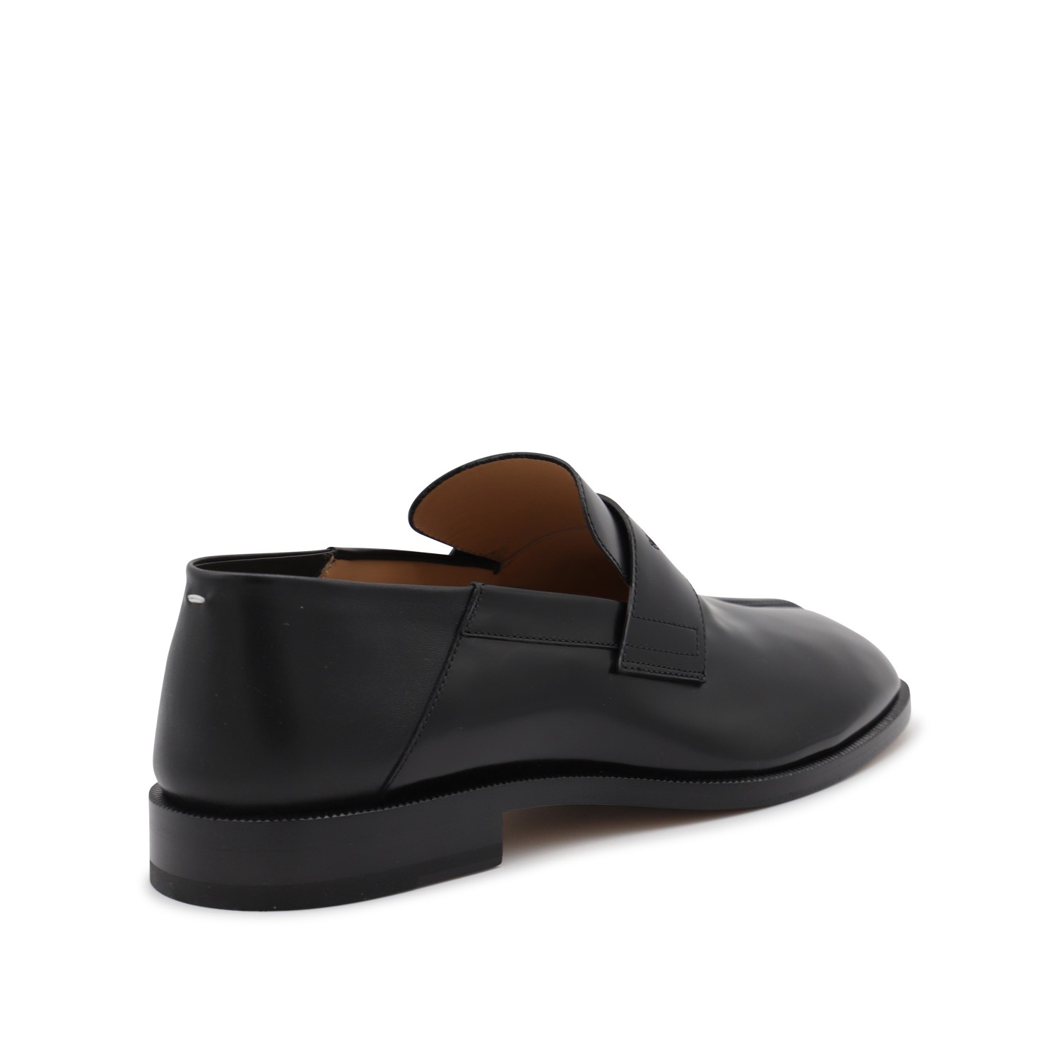 Black leather Tabi Babouche loafers from Maison Margiela featuring Tabi toe, square heel, slip-on style and leather sole.