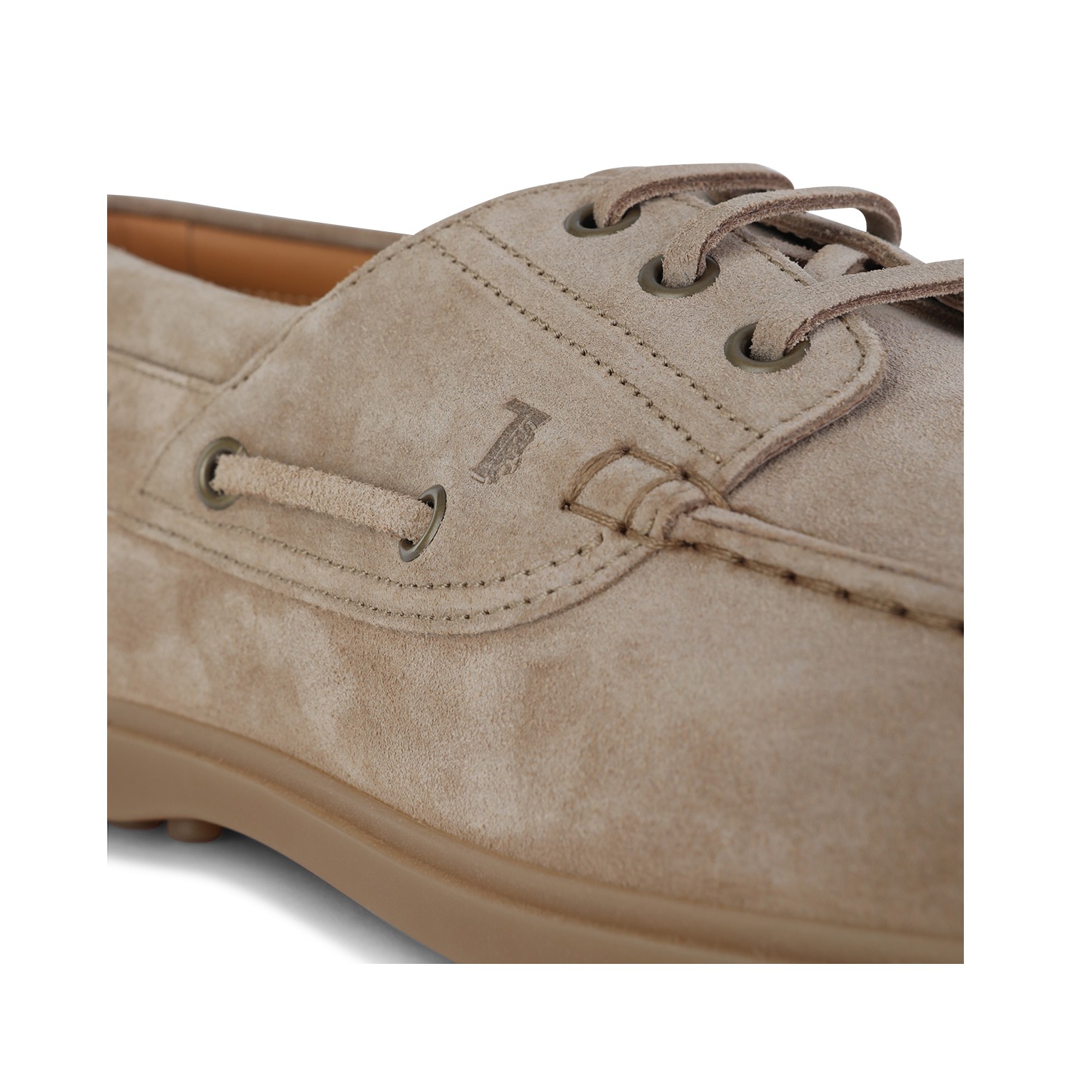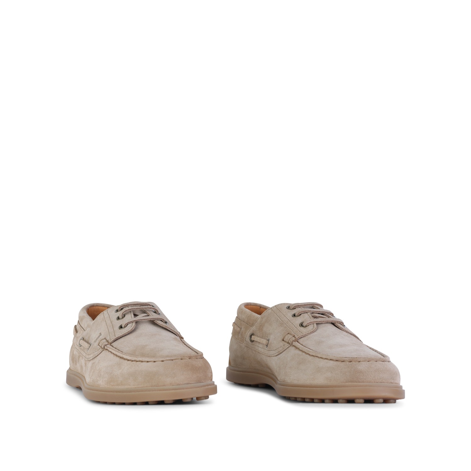 Beige leather loafers from Tod's featuring round toe, lace up detail, slip-on style, stitching details and rubber sole.