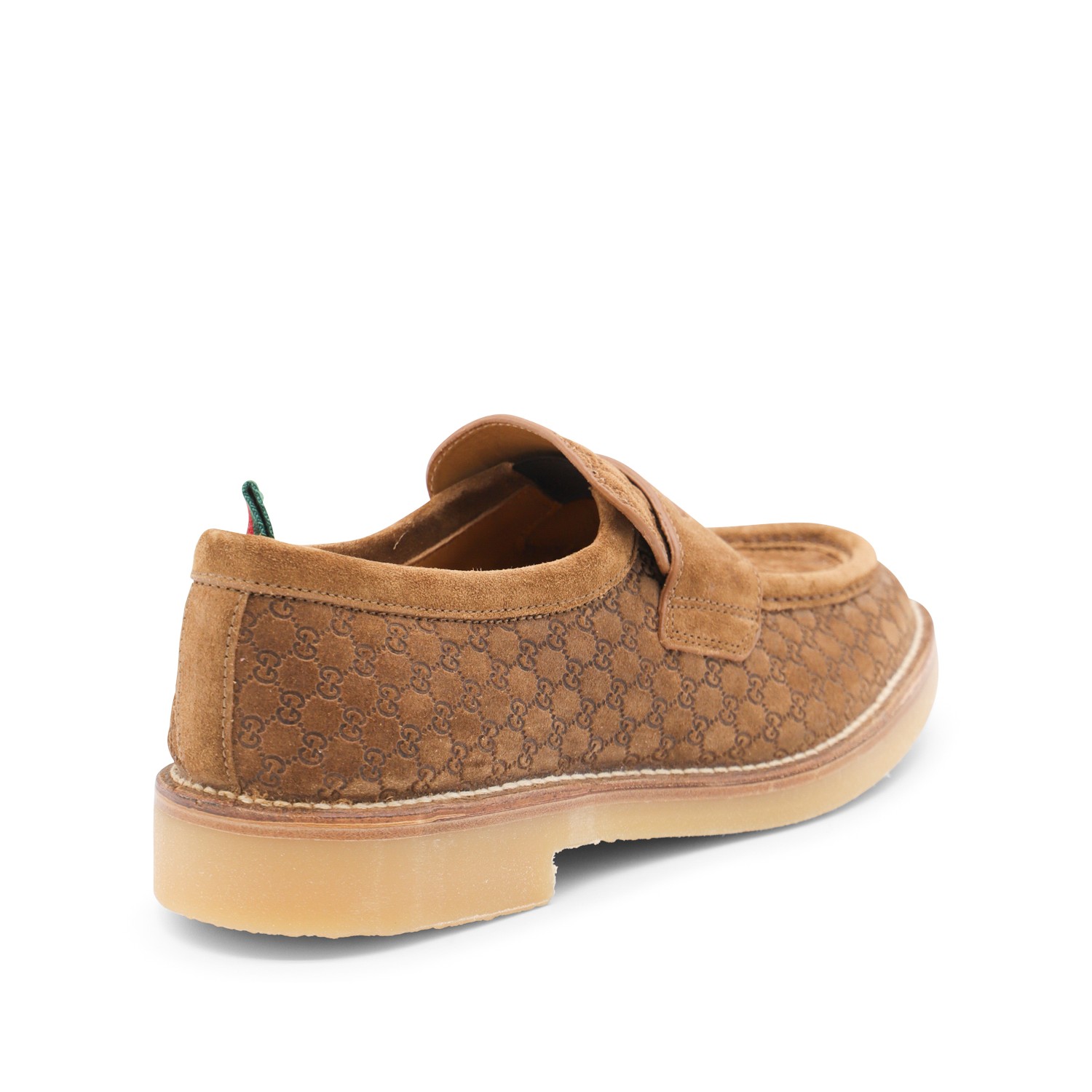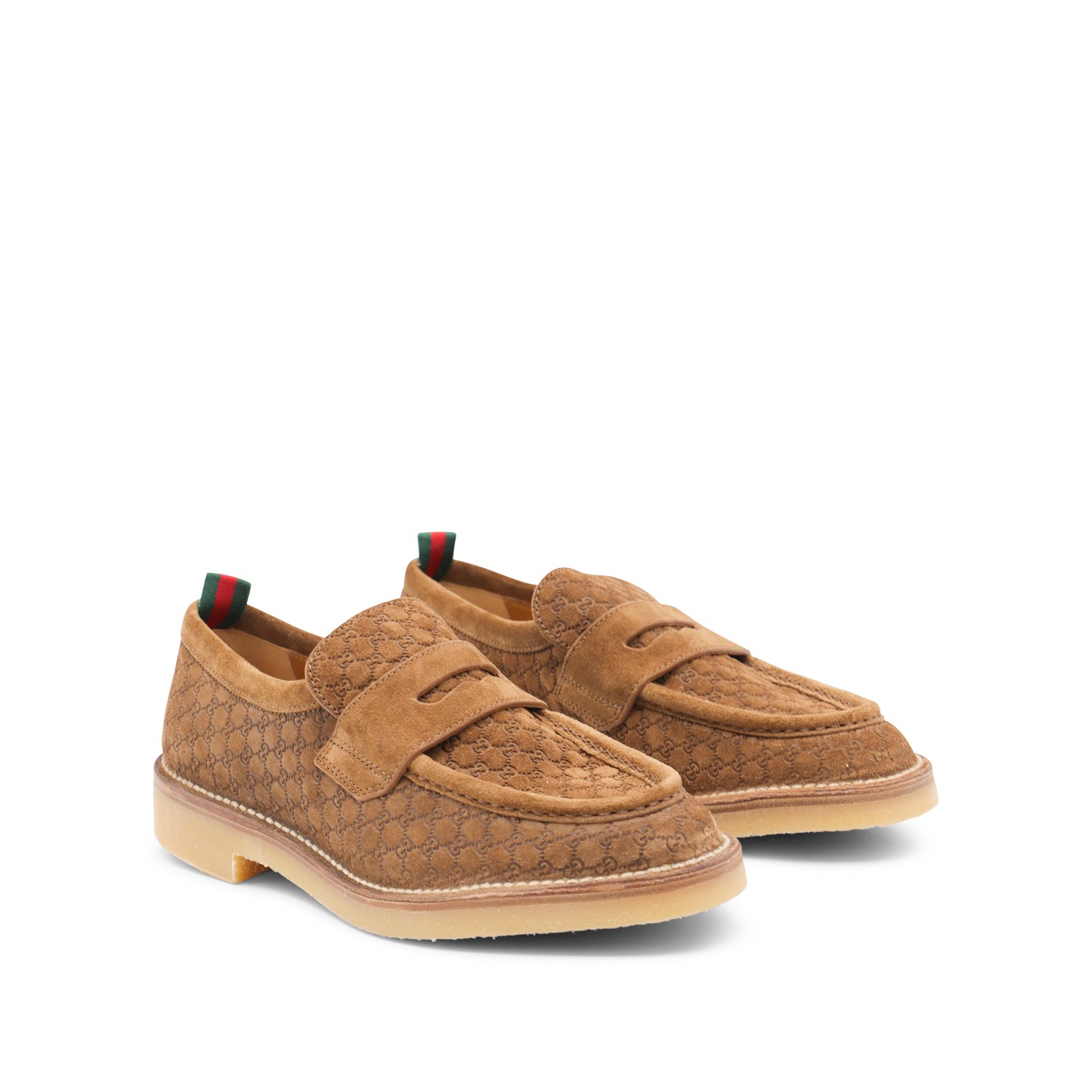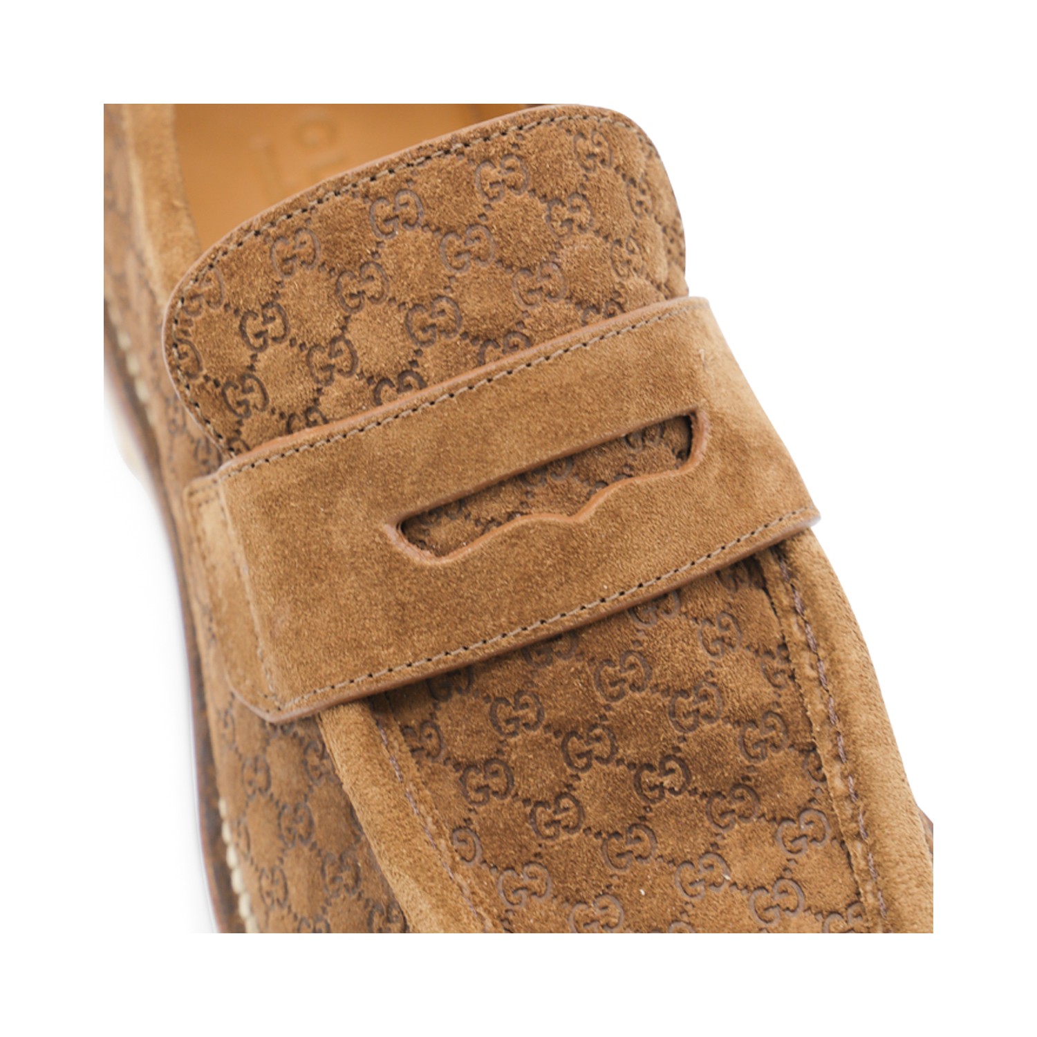 Beige leather loafers from Gucci featuring round toe, slip-on style, all-over GG motif, suede, branded insole and rubber sole.