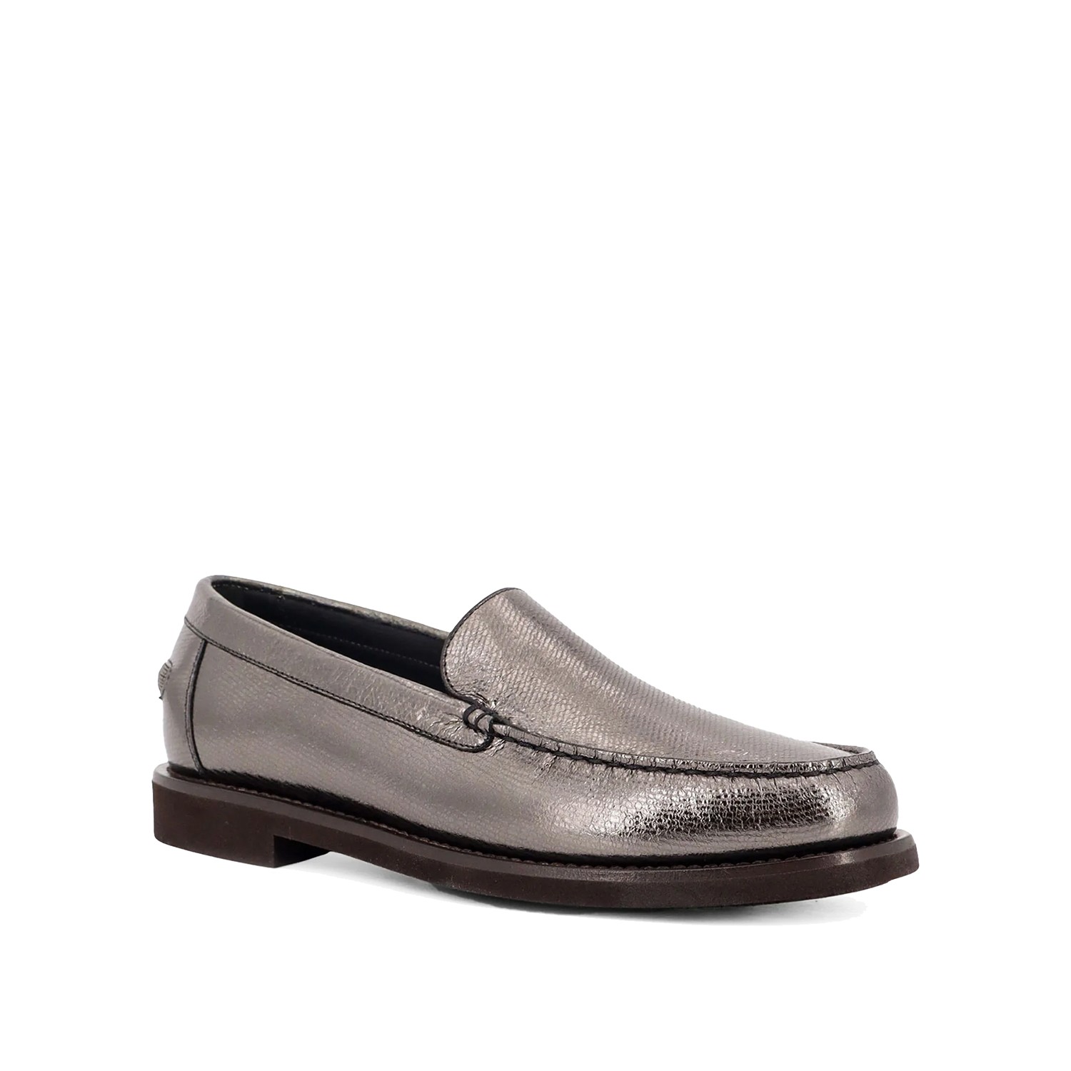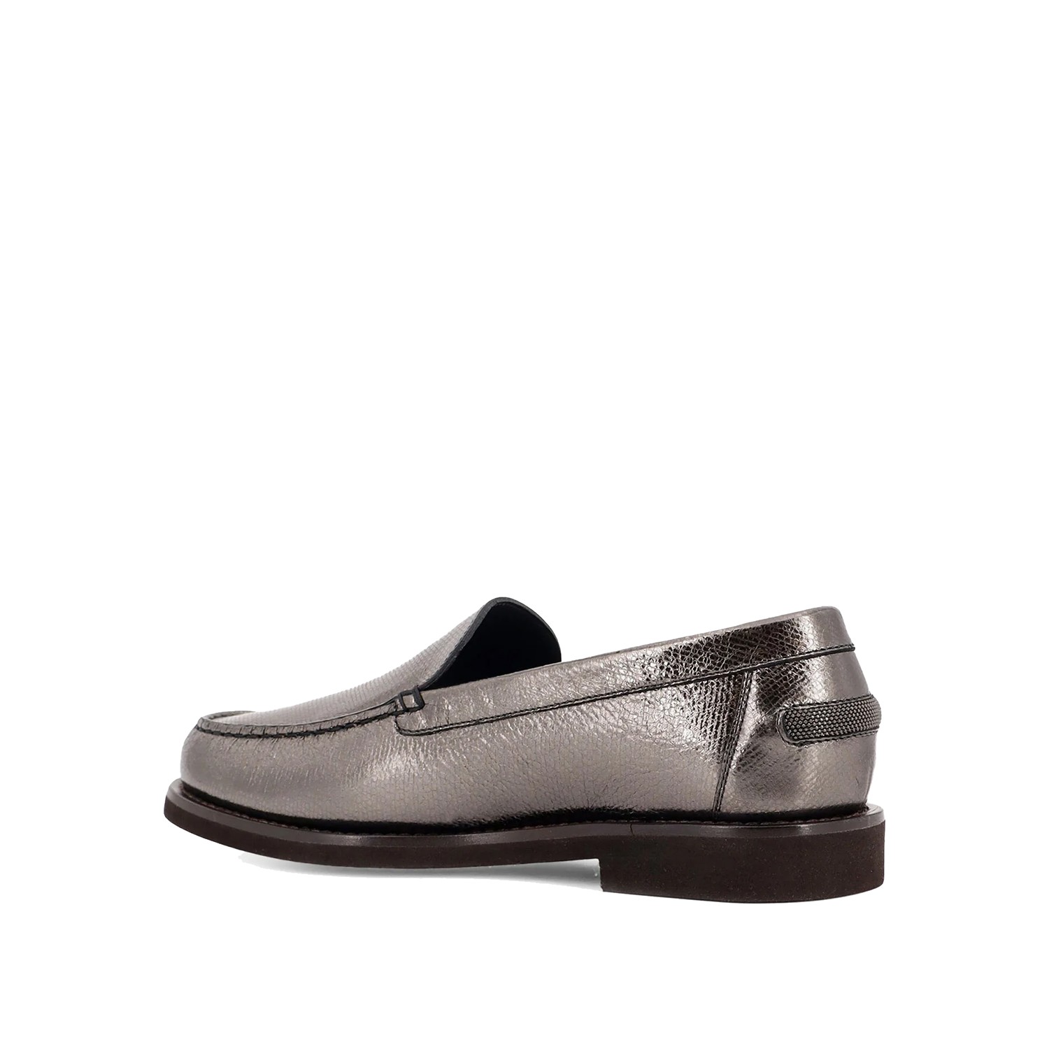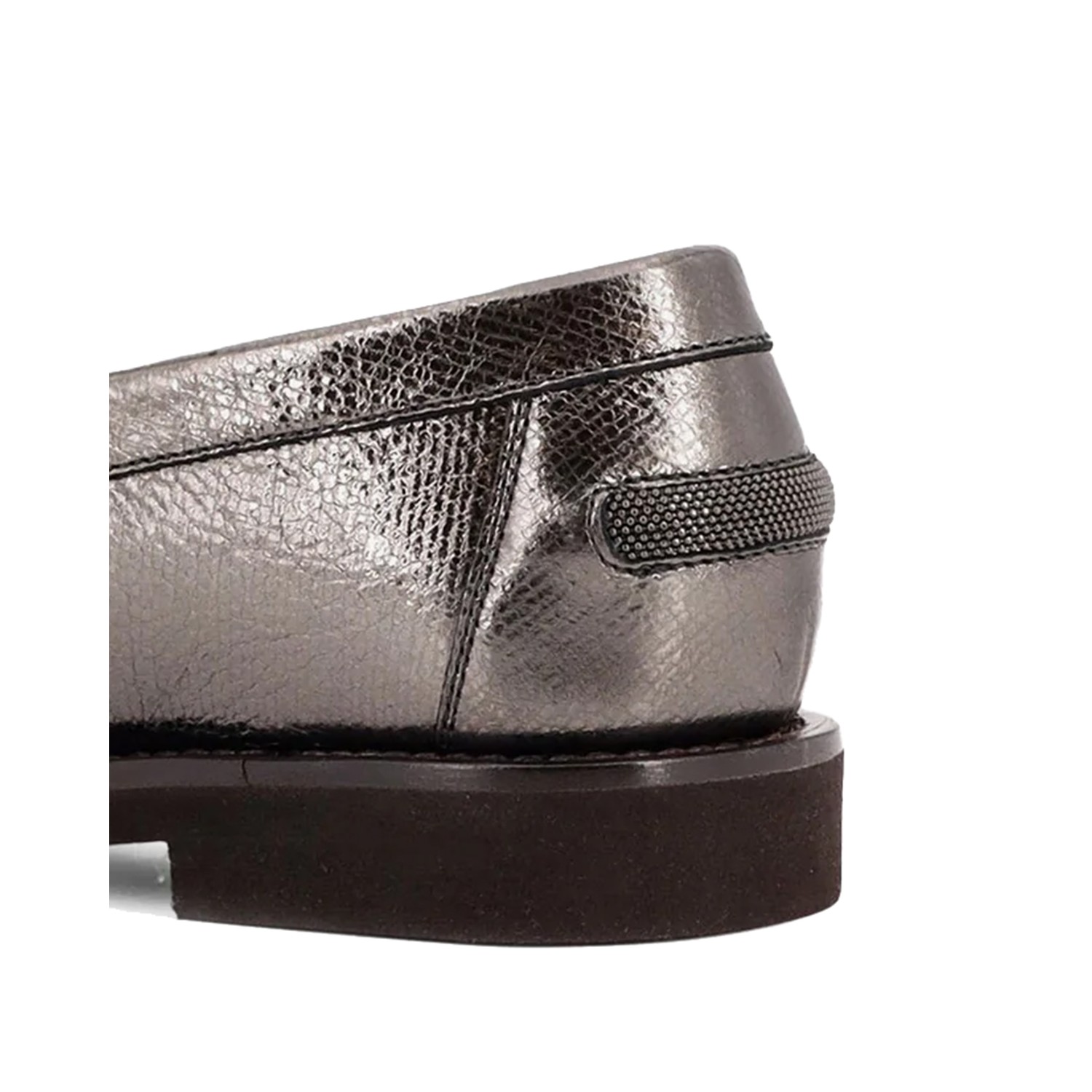 Silver leather Penny loafers from Brunello Cucinelli featuring round toe, slip-on style, stitching details and rubber sole.