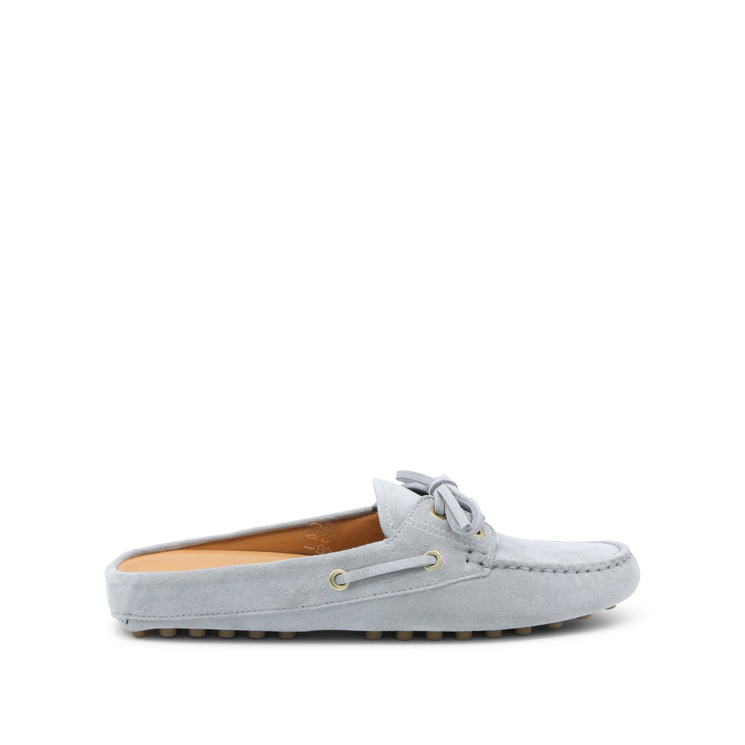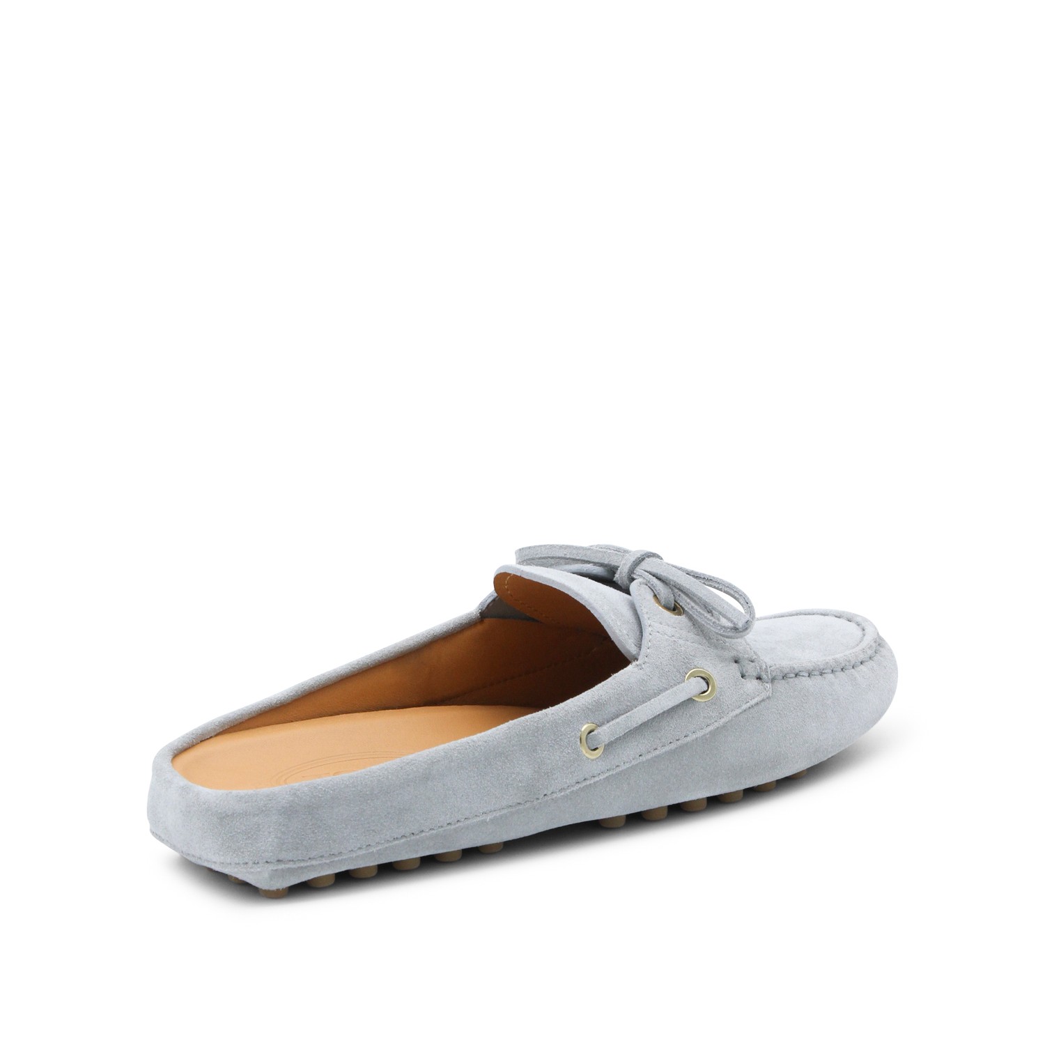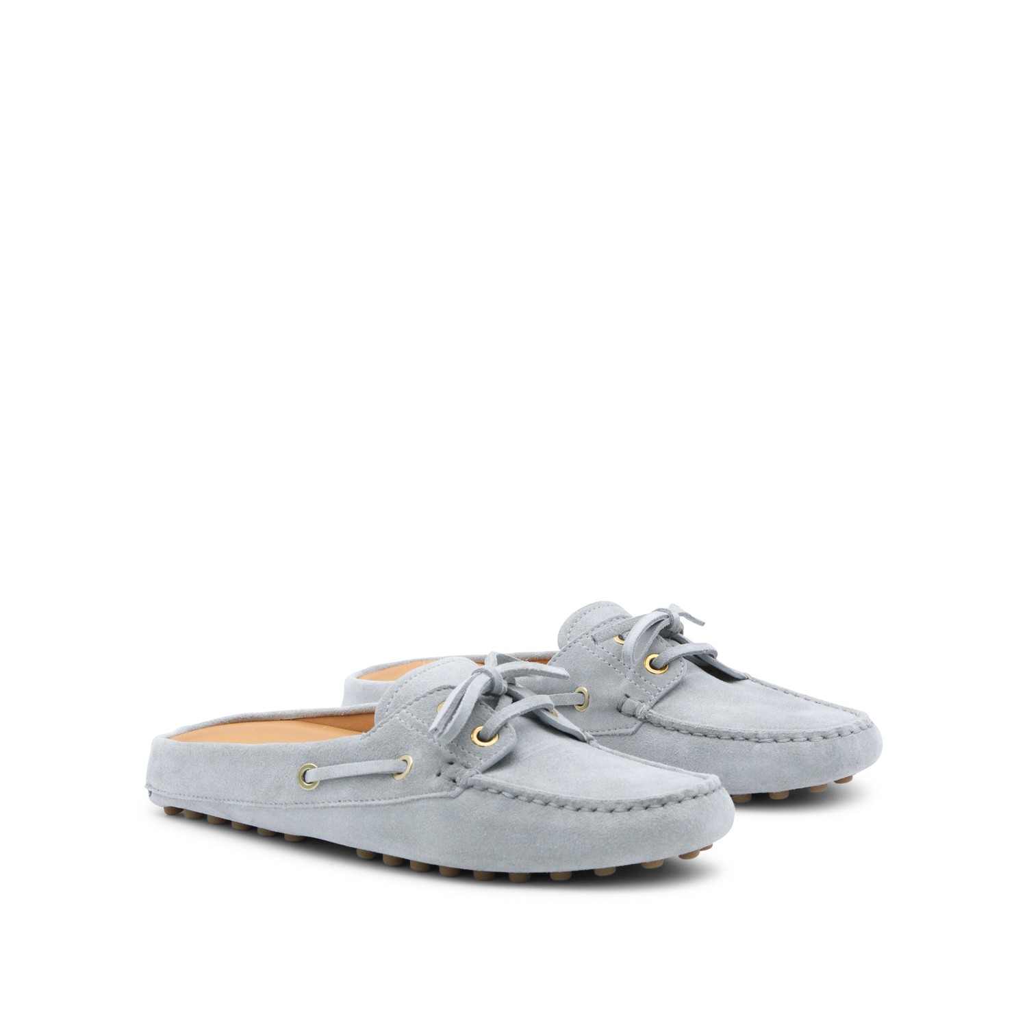 Grey leather loafers from Tod's featuring round toe, slip-on style, open back, lace detail, stitchings and rubber sole.