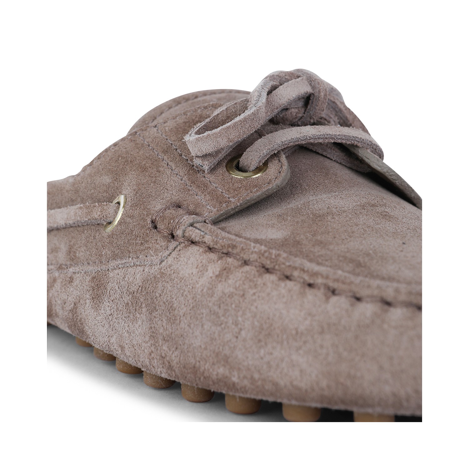 Beige leather loafers from Tod's featuring round toe, slip-on style, open back, lace detail, stitchings and rubber sole.