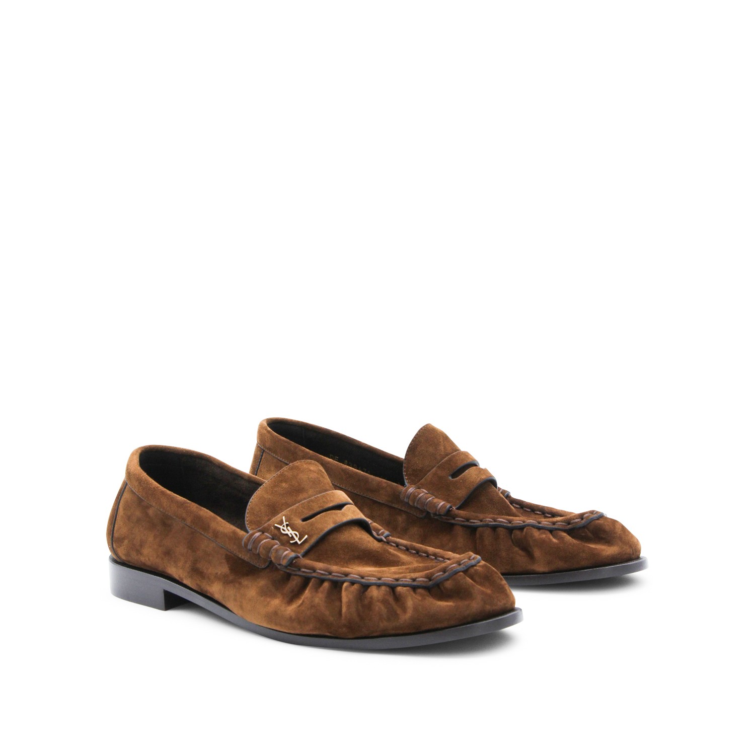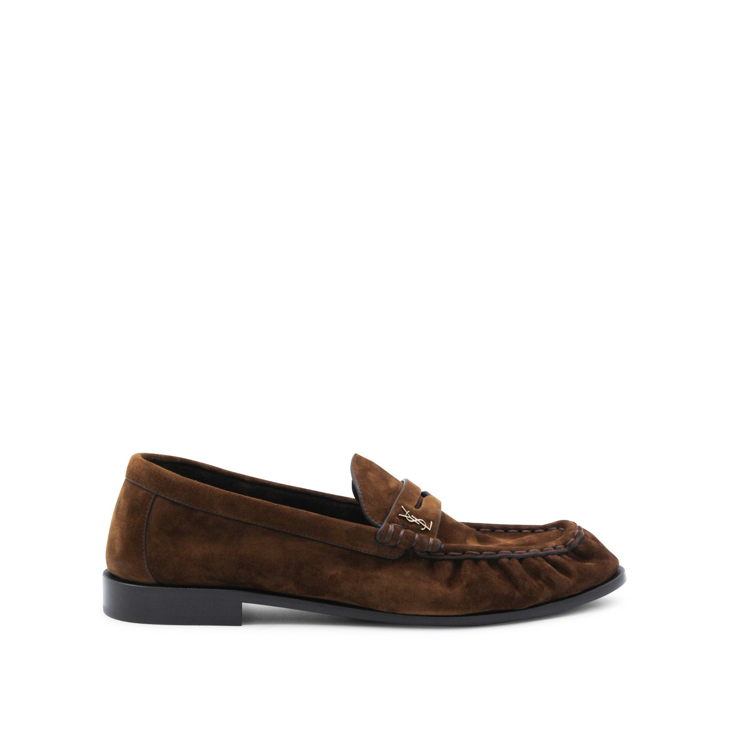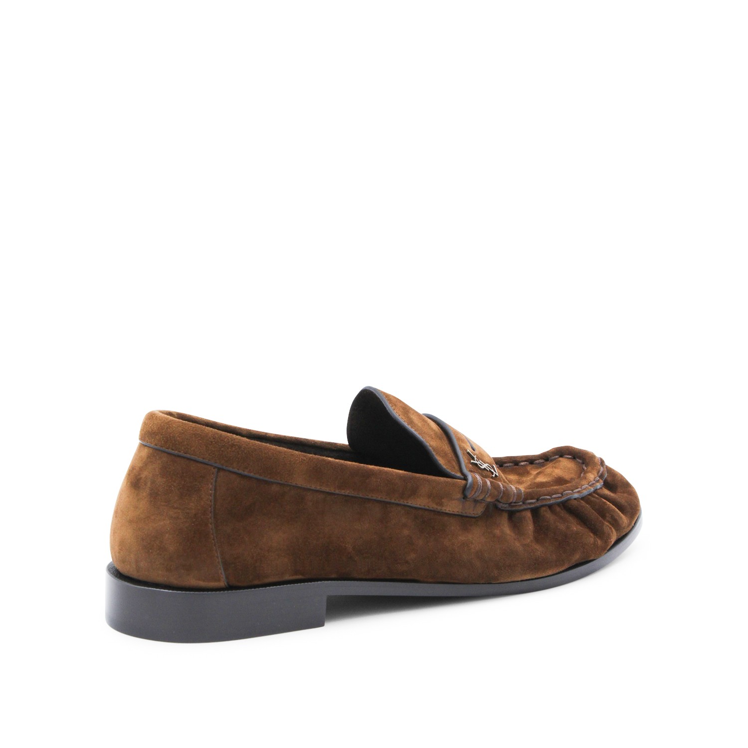 Brown suede loafers from Saint Laurent featuring round toe, slip-on style, hand-stitched moc toe, gold tone logo and leather sole.