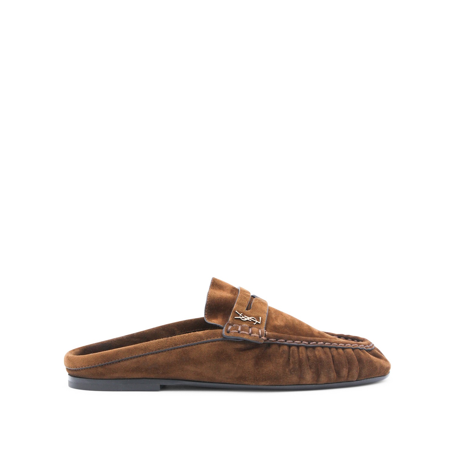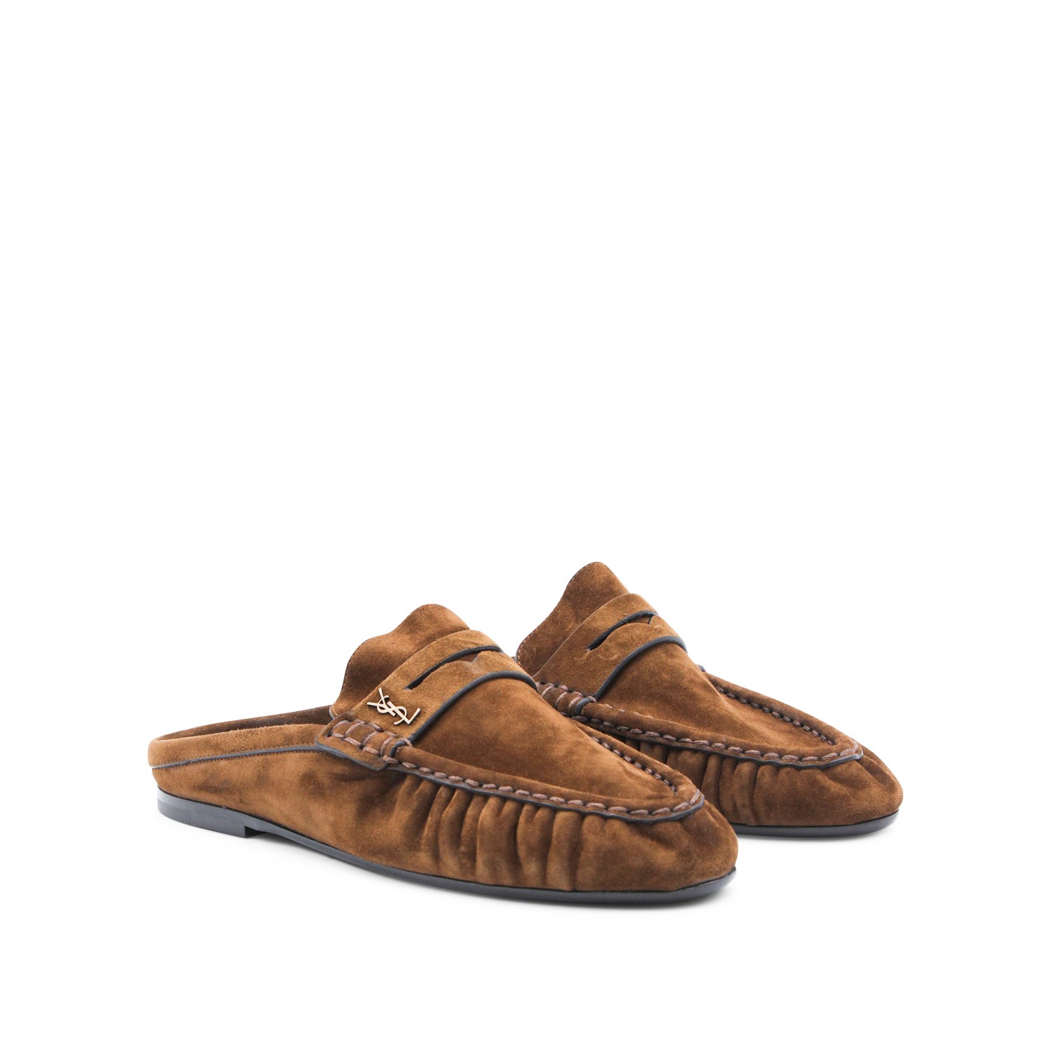 Brown leather loafers from Saint Laurent featuring square toe, open back, leather sole and logo patch.