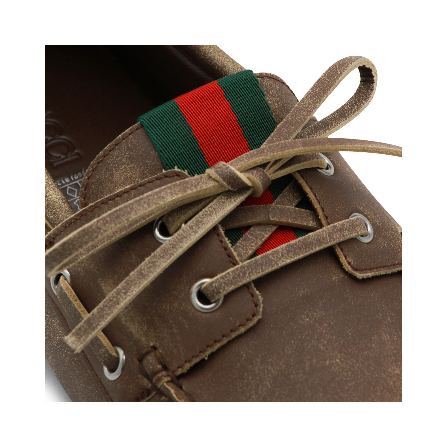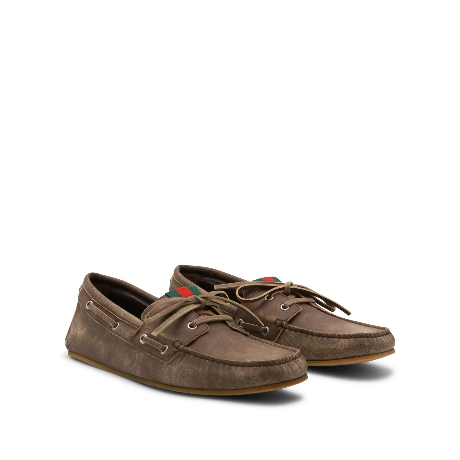 Brown leather loafers from Gucci featuring round toe, boat design, suede, slip-on style, Web detail, branded insole and rubber sole.