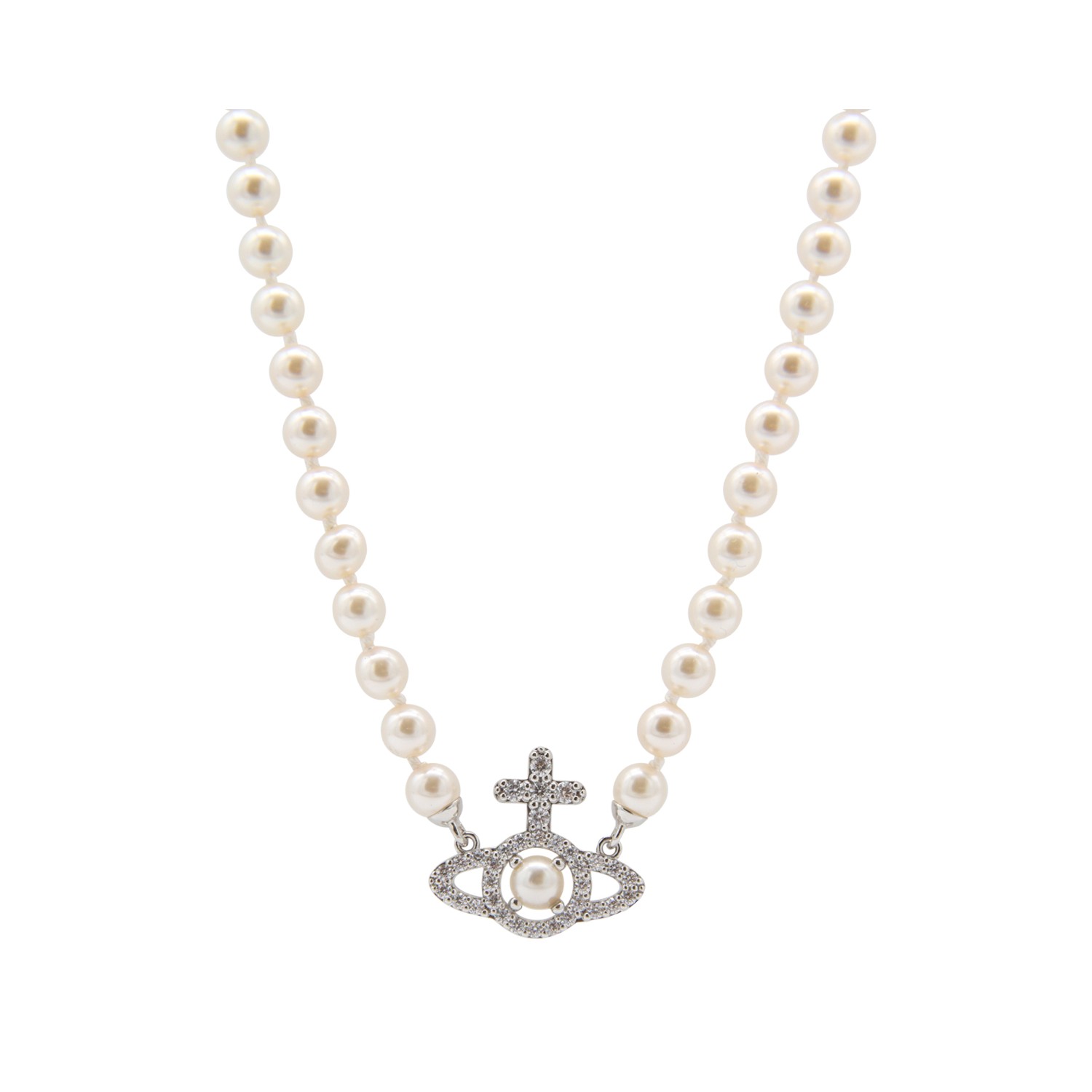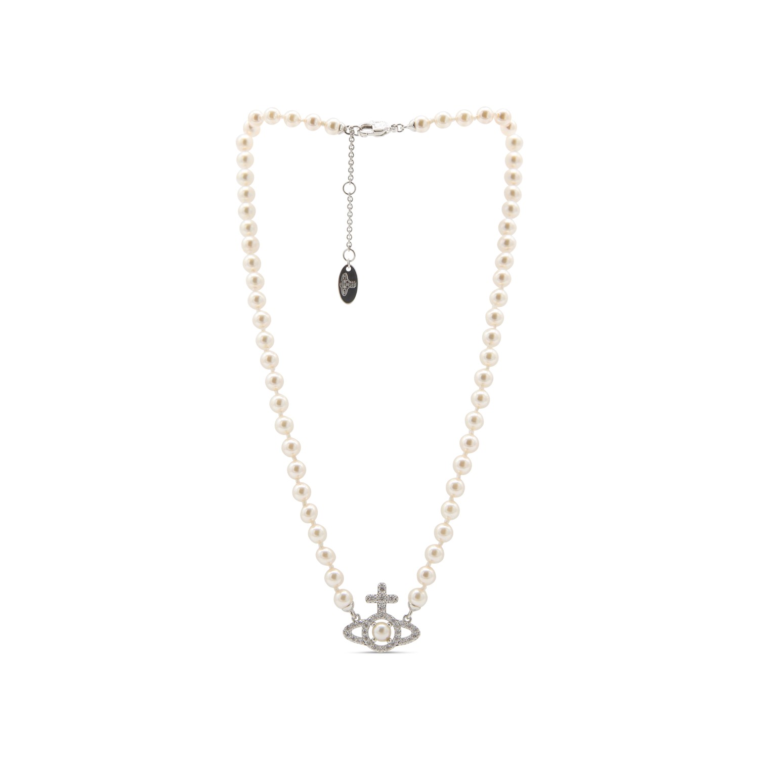 Platinum brass necklaces from Vivienne Westwood featuring silver tone hardware, logo and pearls.
