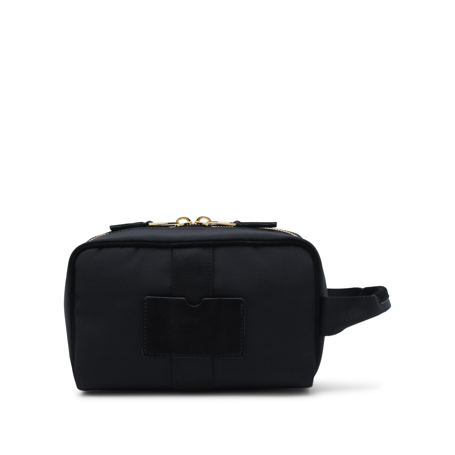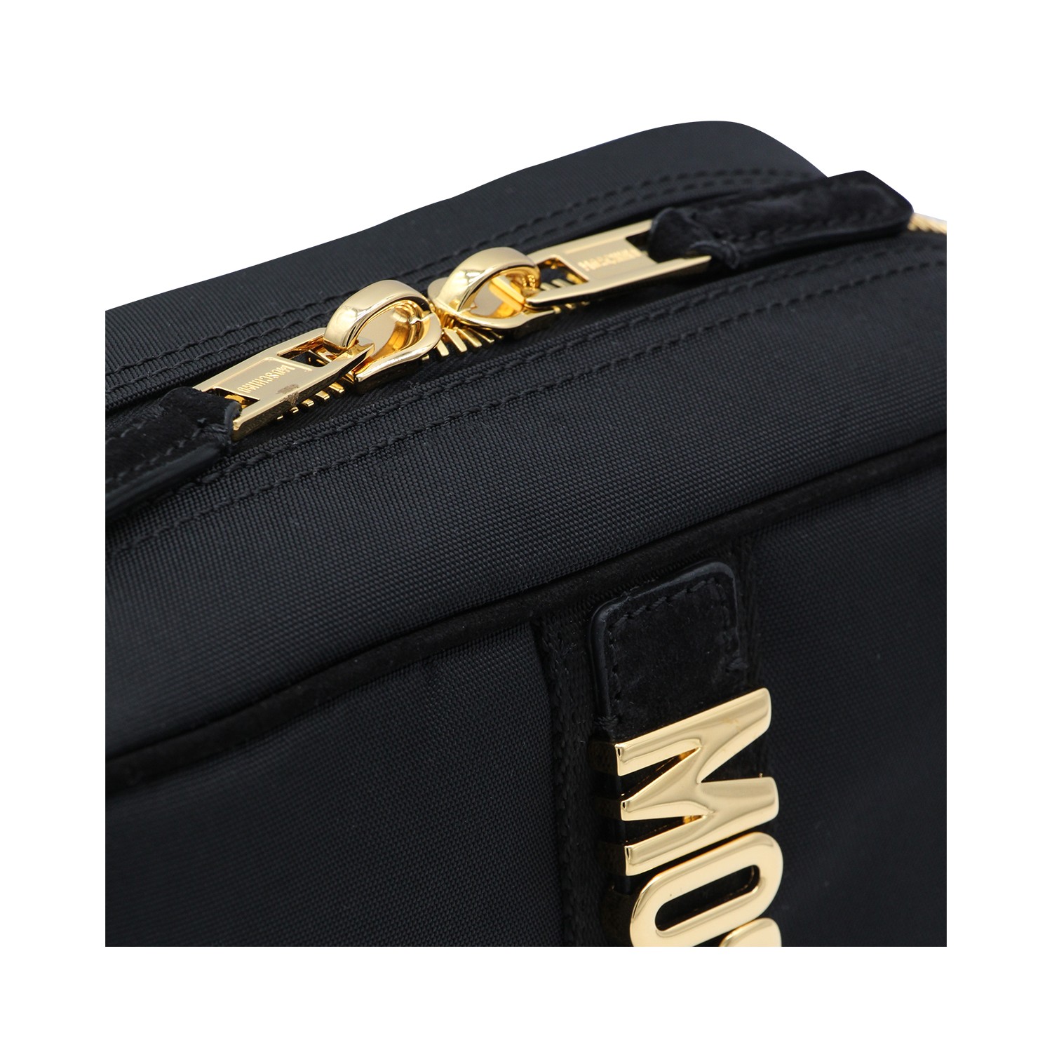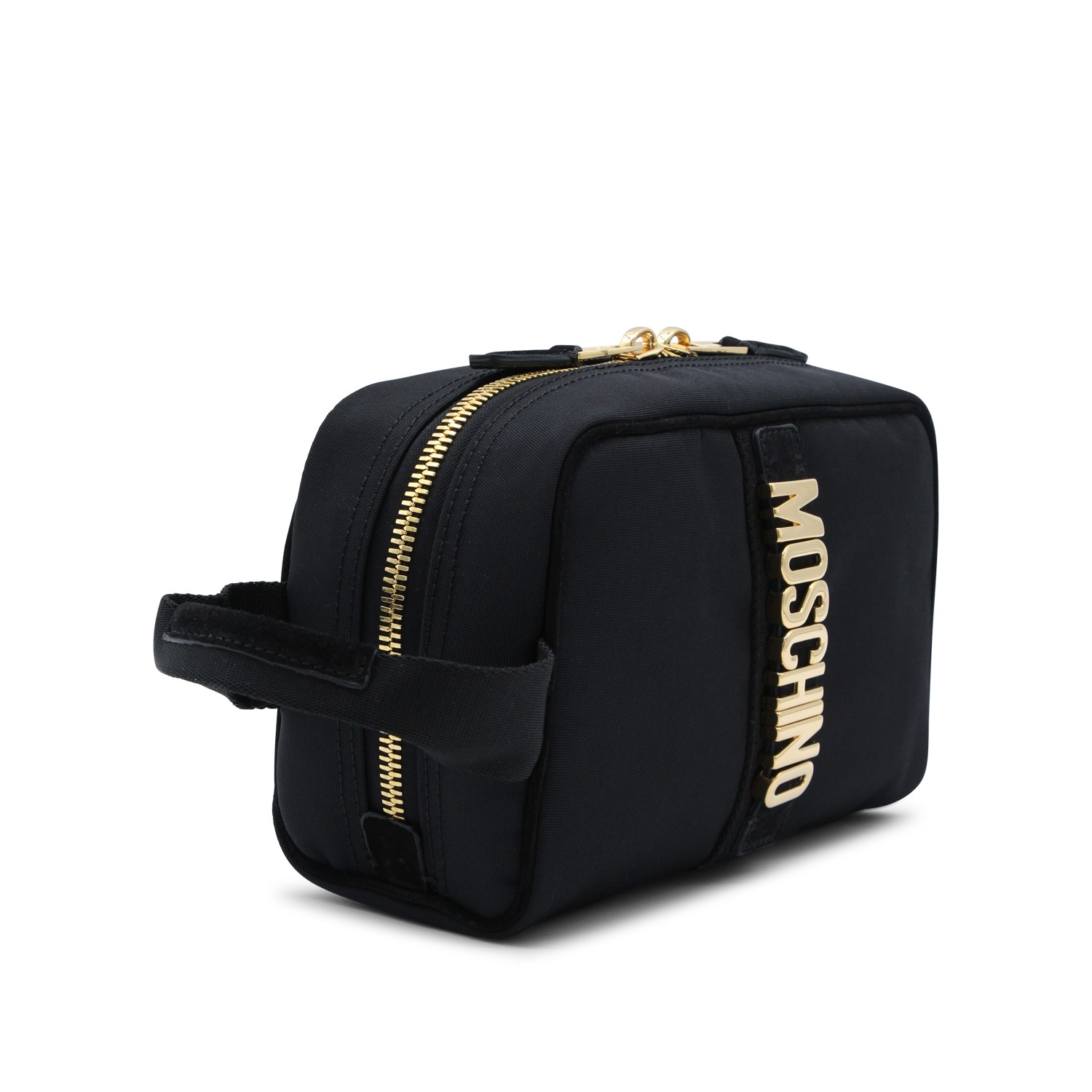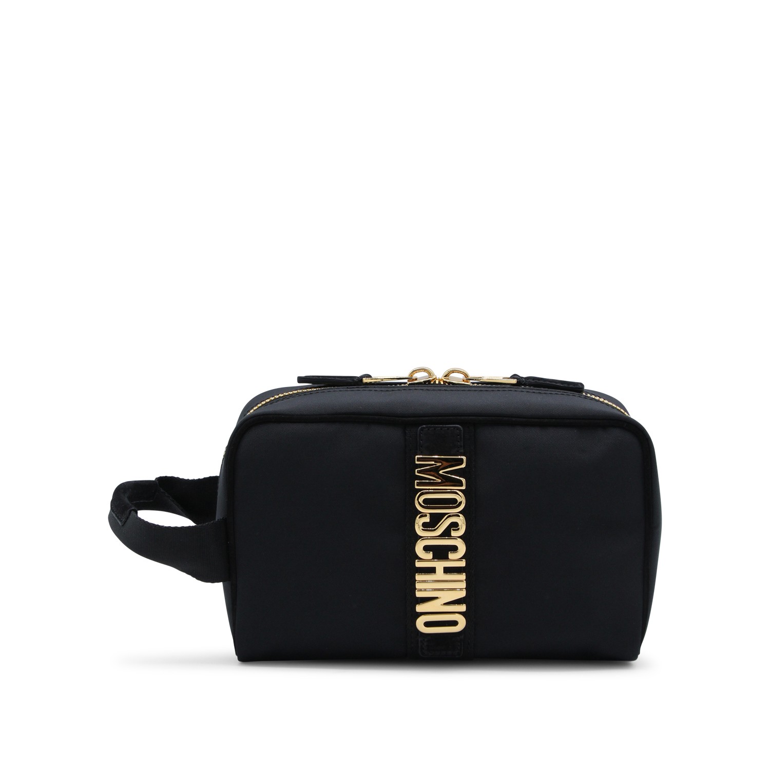Black leather pouch from Moschino featuring rectangular shape, gold tone hardware, metal lettering logo, double zip closure and main compartment.