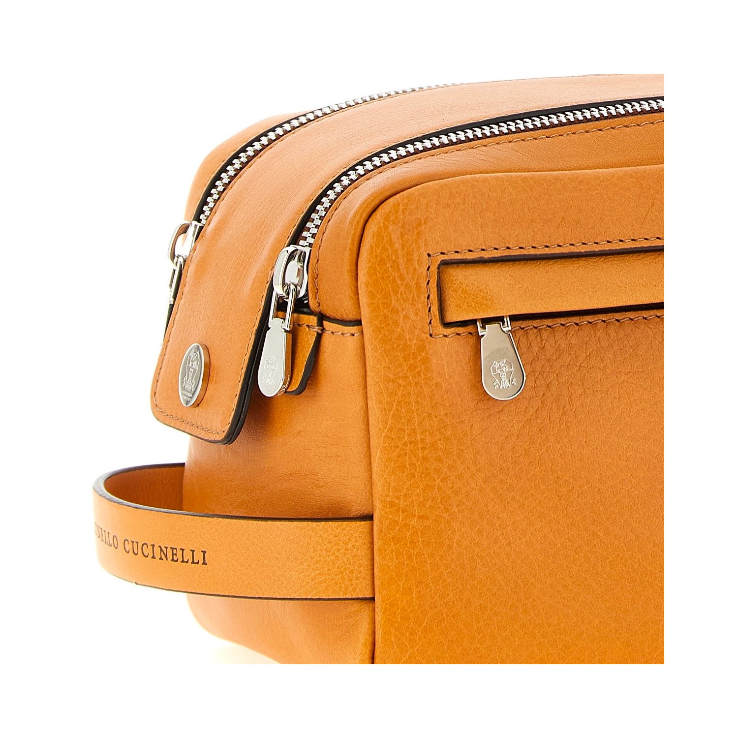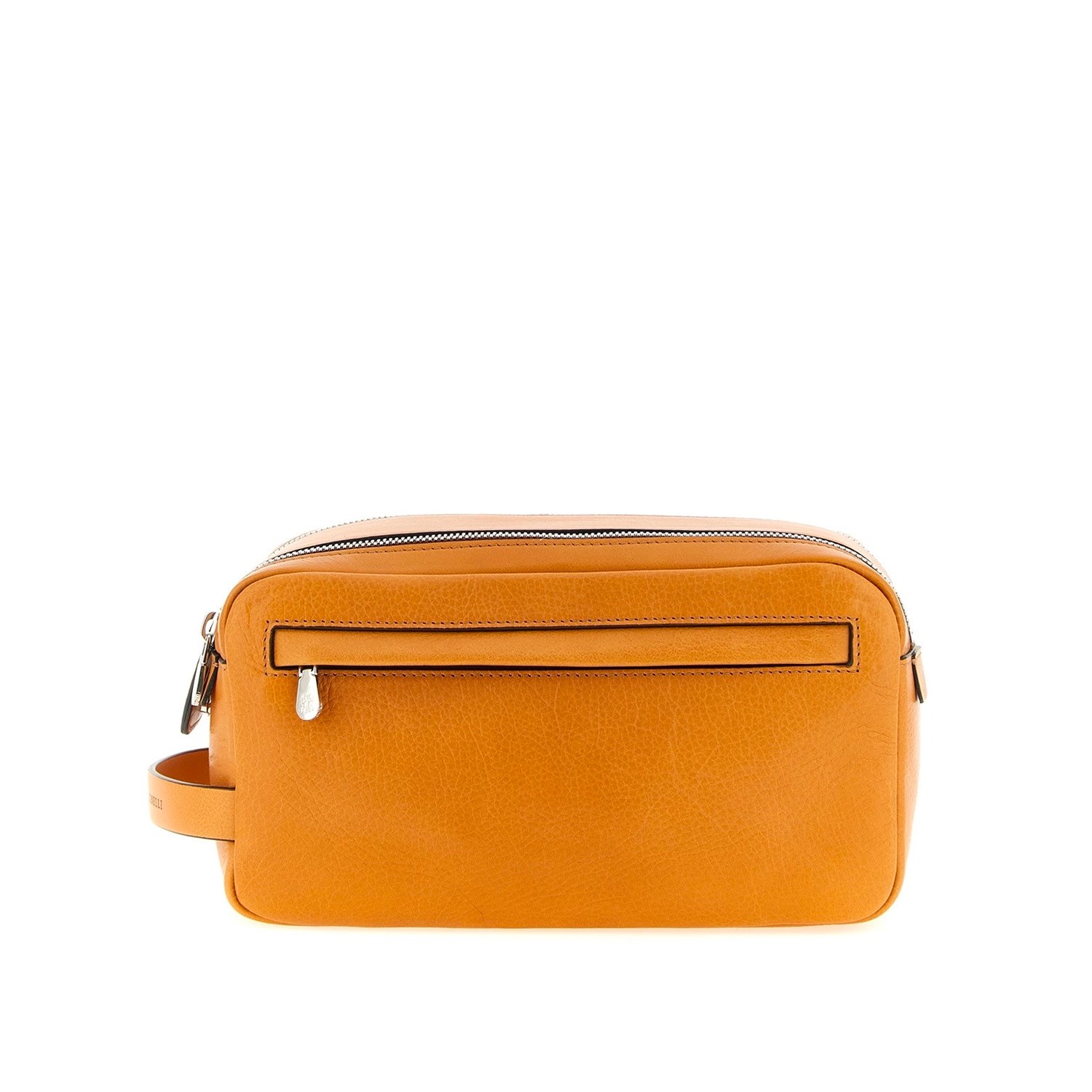 Orange leather pouch from Brunello Cucinelli featuring side handle, top double zipper, frontal zipped pocekts, two compartments and engraved logo.