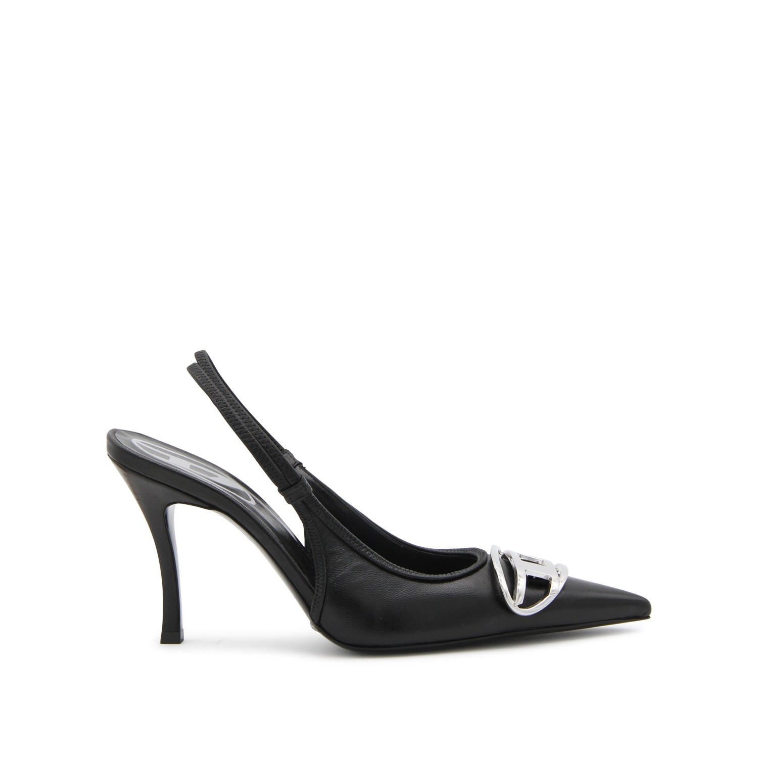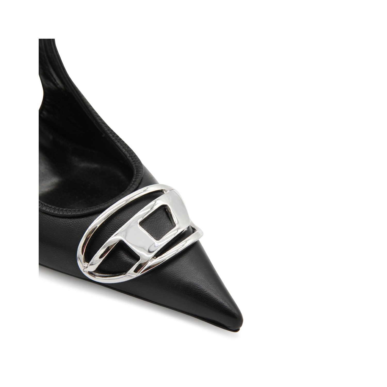 Black leather pumps from Diesel featuring pointed toe, elasticated slingback strap, mid stiletto heel, logo embellishment, branded insole and silver-tone hardware.