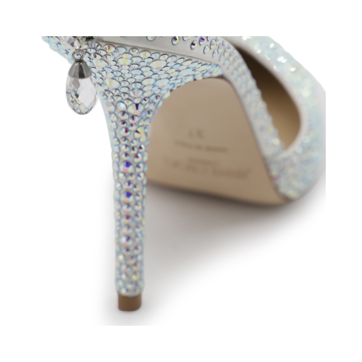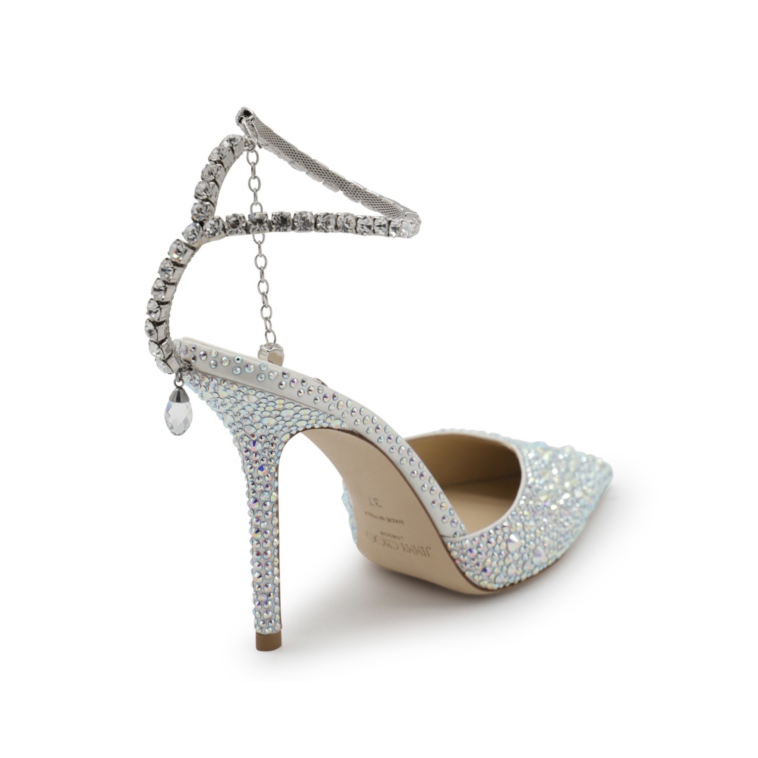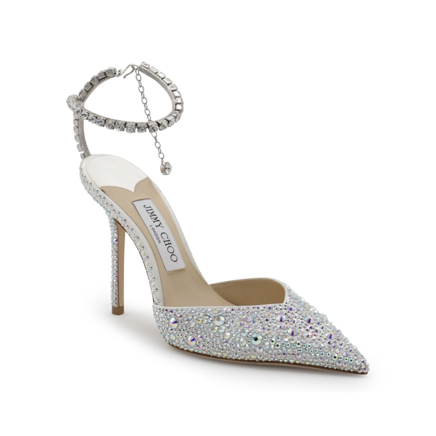 Crystal pumps from Jimmy Choo featuring pointed toe, crystal embellishments, ankle closure and stiletto heel.