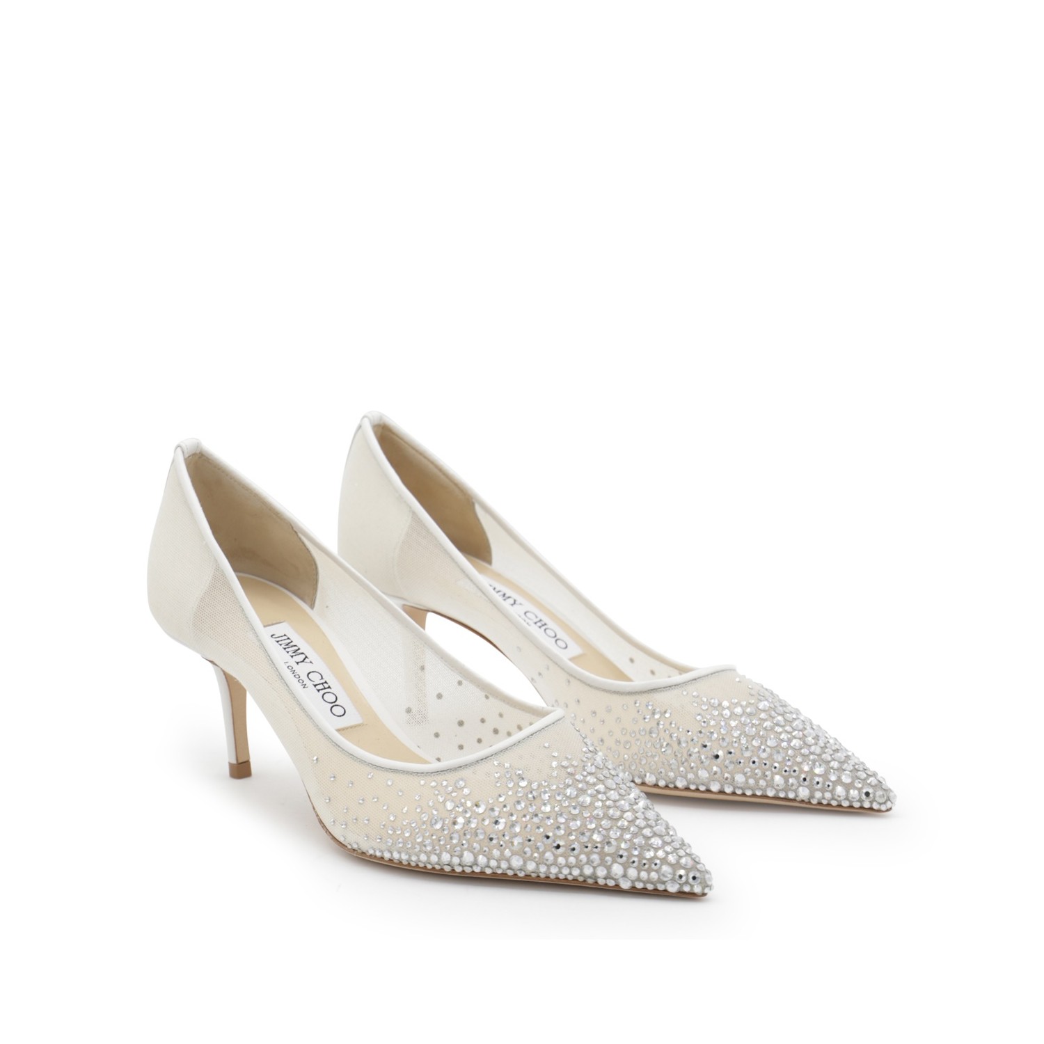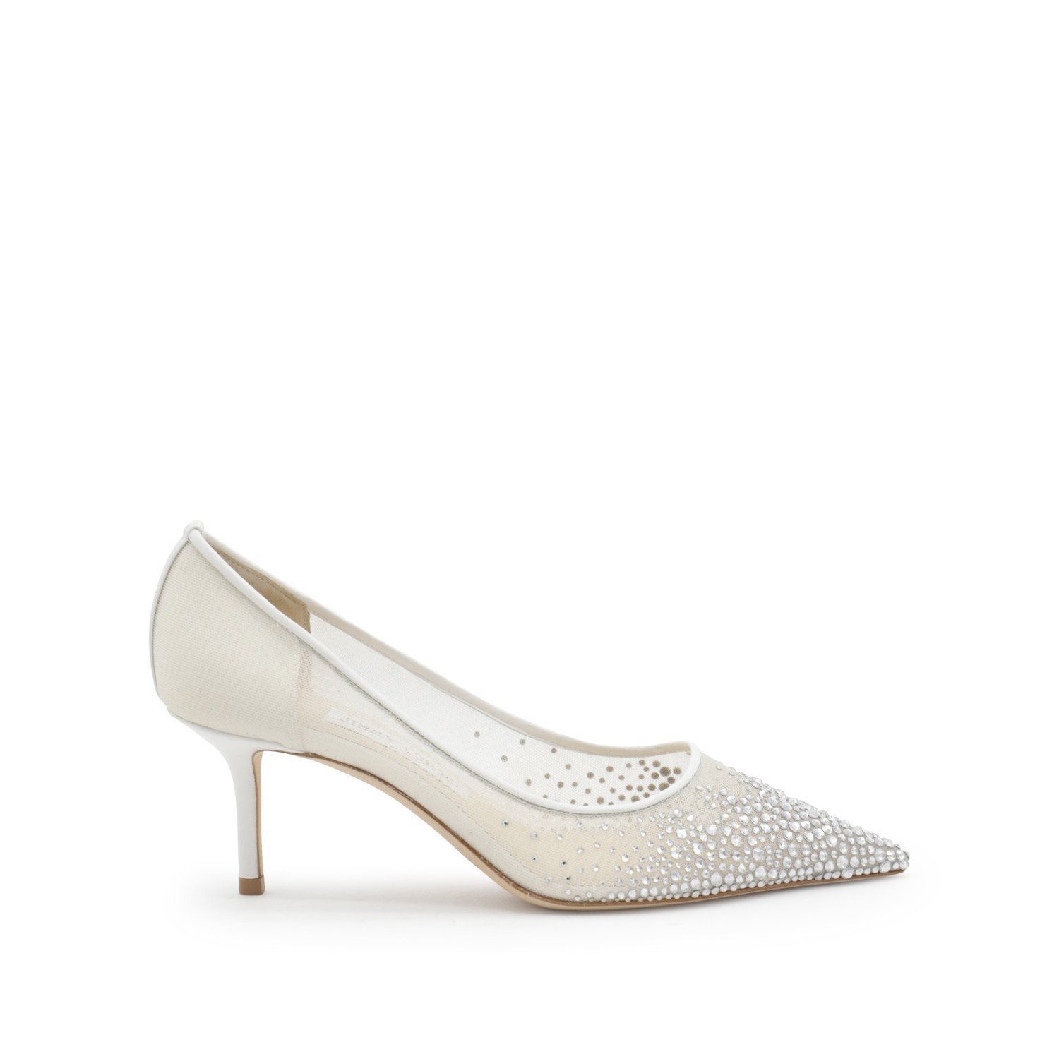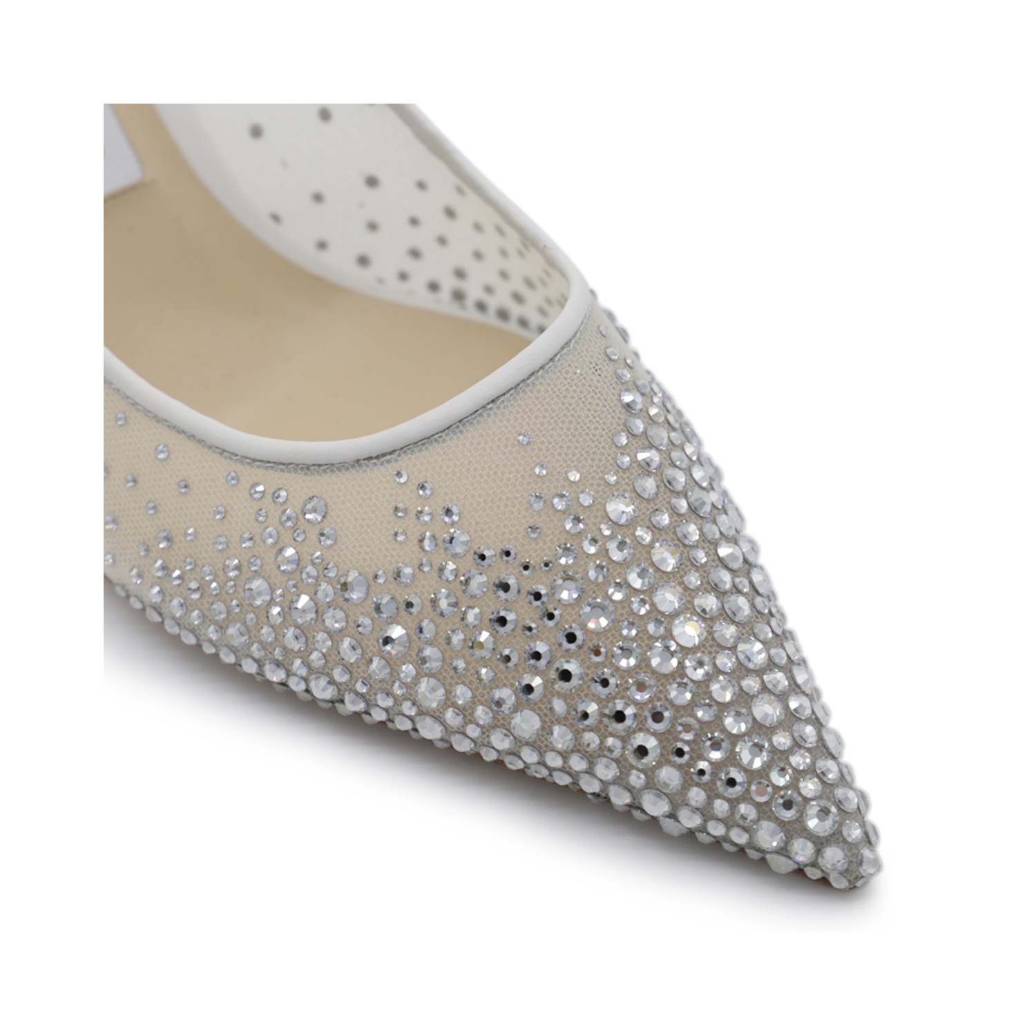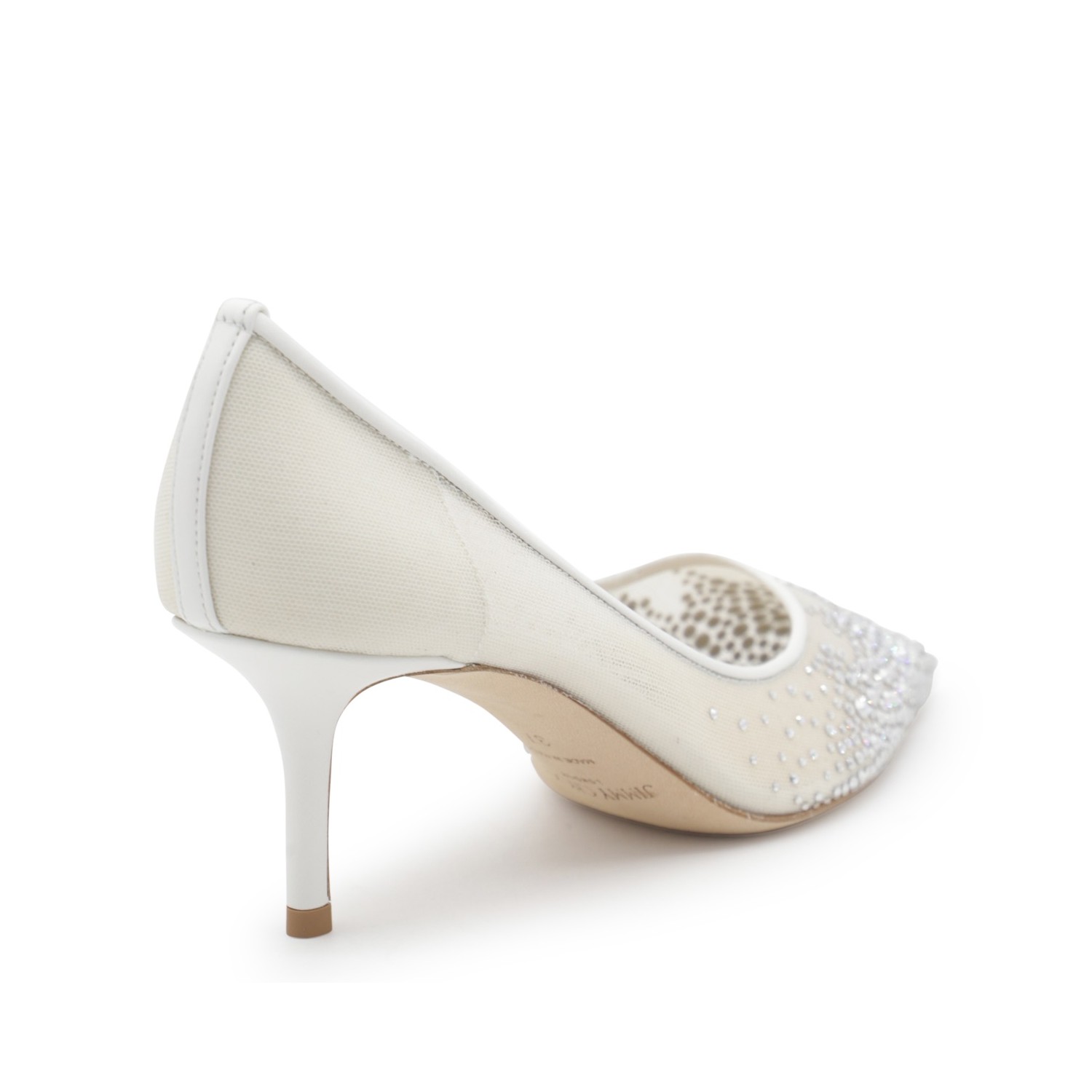 White leather pumps from Jimmy Choo featuring pointed toe, slip-on style, transparencies and crystals.