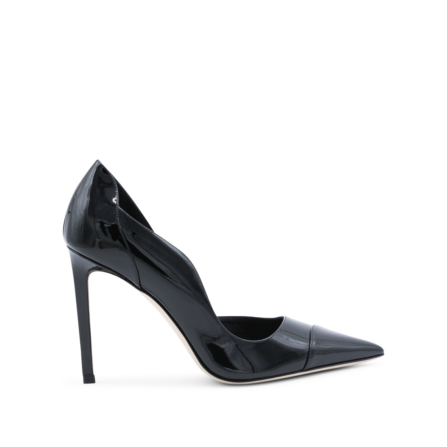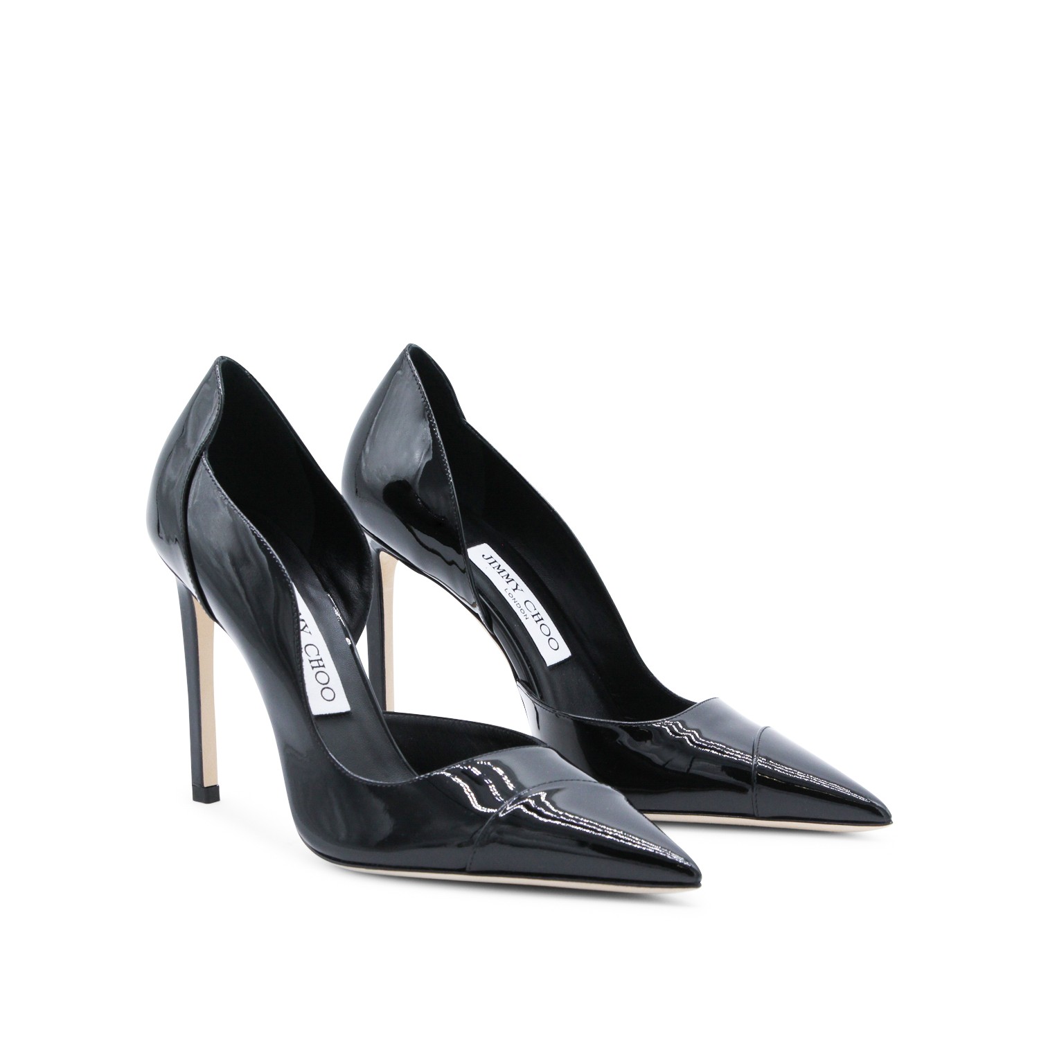 Black leather pumps from Jimmy Choo featuring pointed toe, slip-on style, stiletto heel and branded sole.