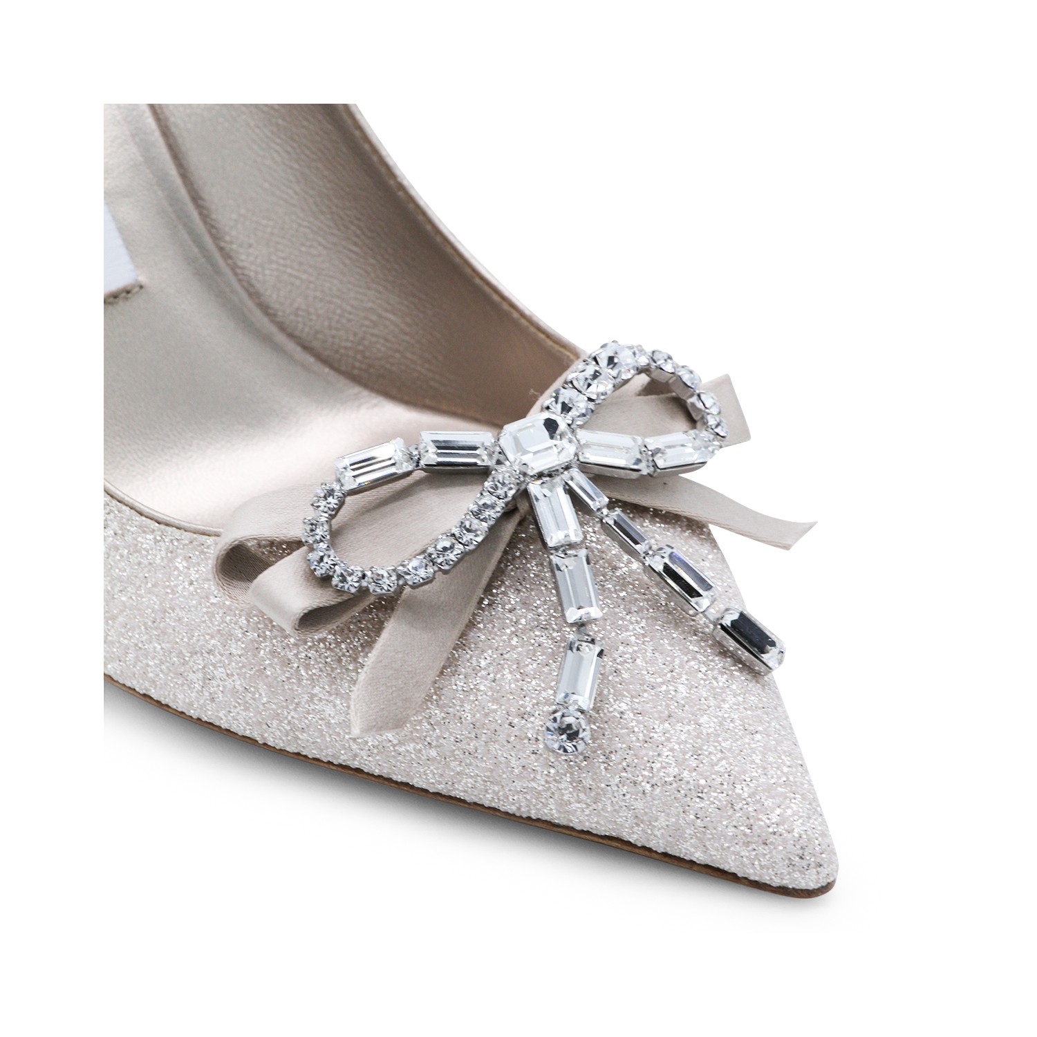 Silver leather Auria 70 pumps from Jimmy Choo featuring pointed toe, slip-on style, satin ribbon, crystal-embellished bow, curved heel and microglitter fabric.