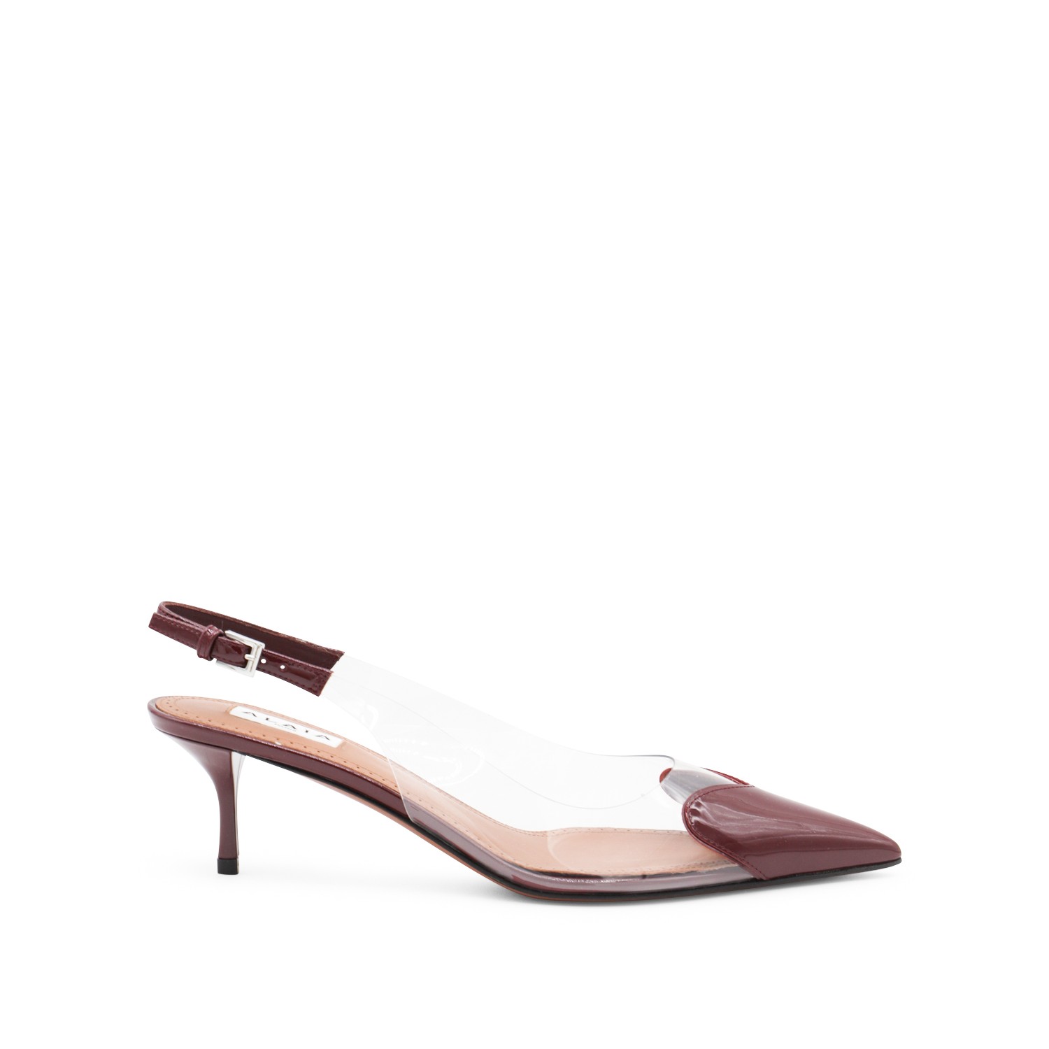 Dark red and trasparent pumps from Alaia featuring pointed toe, stiletto heel, buckle fastening and leather sole.