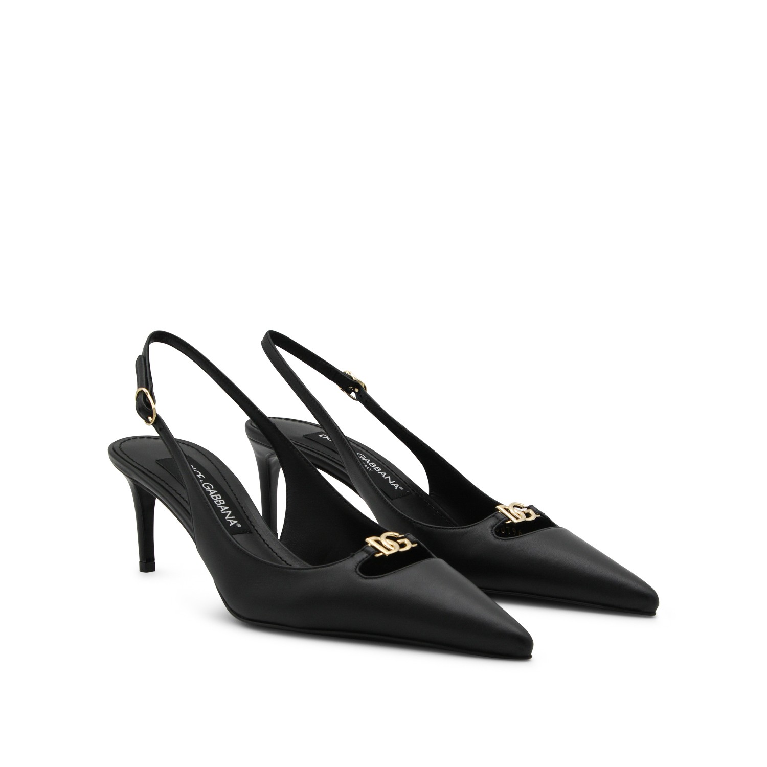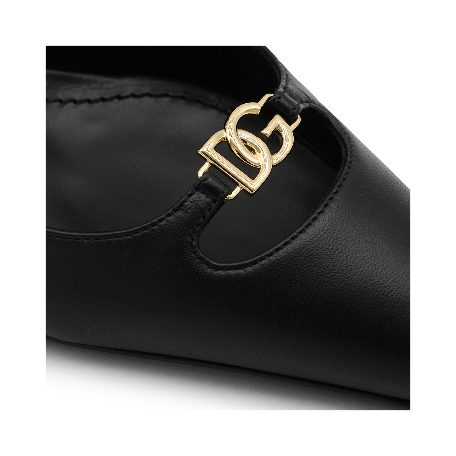 Black leather pumps from Dolce & Gabbana featuring pointed toe, slip-on style, open back, frontal logo and gold tone hardware.
