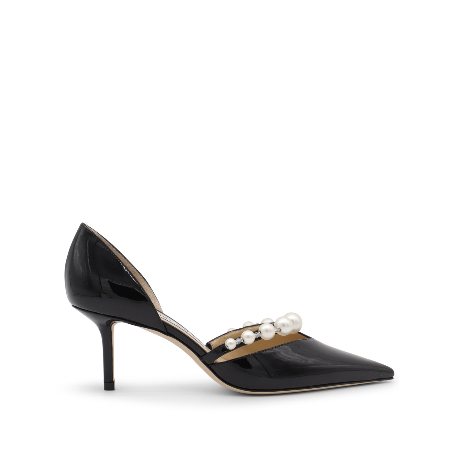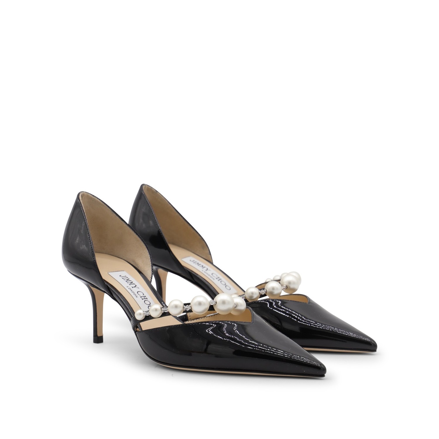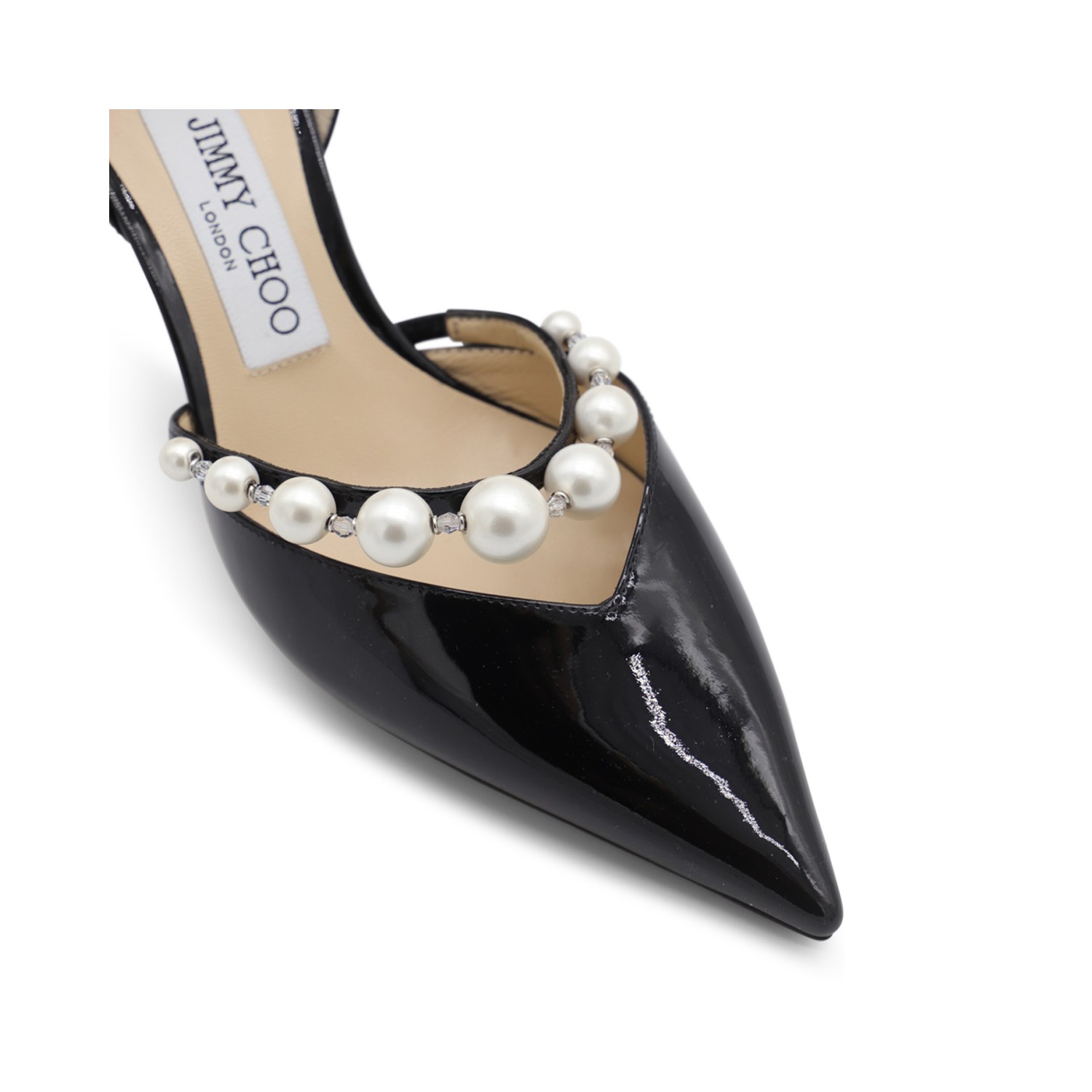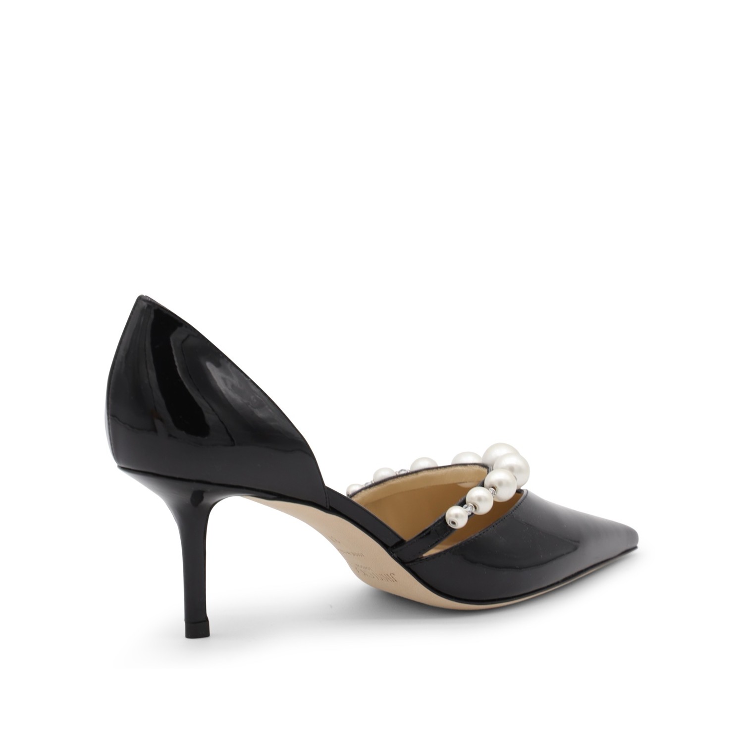 Black leather Aurelie pumps from Jimmy Choo featuring pointed toe, open sides, strap, pearls decoration and stiletto heel.