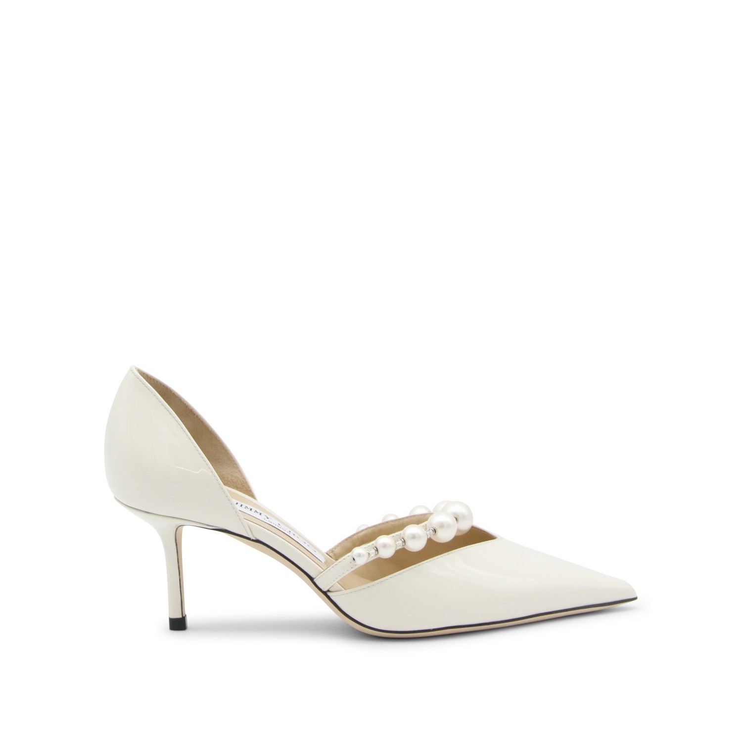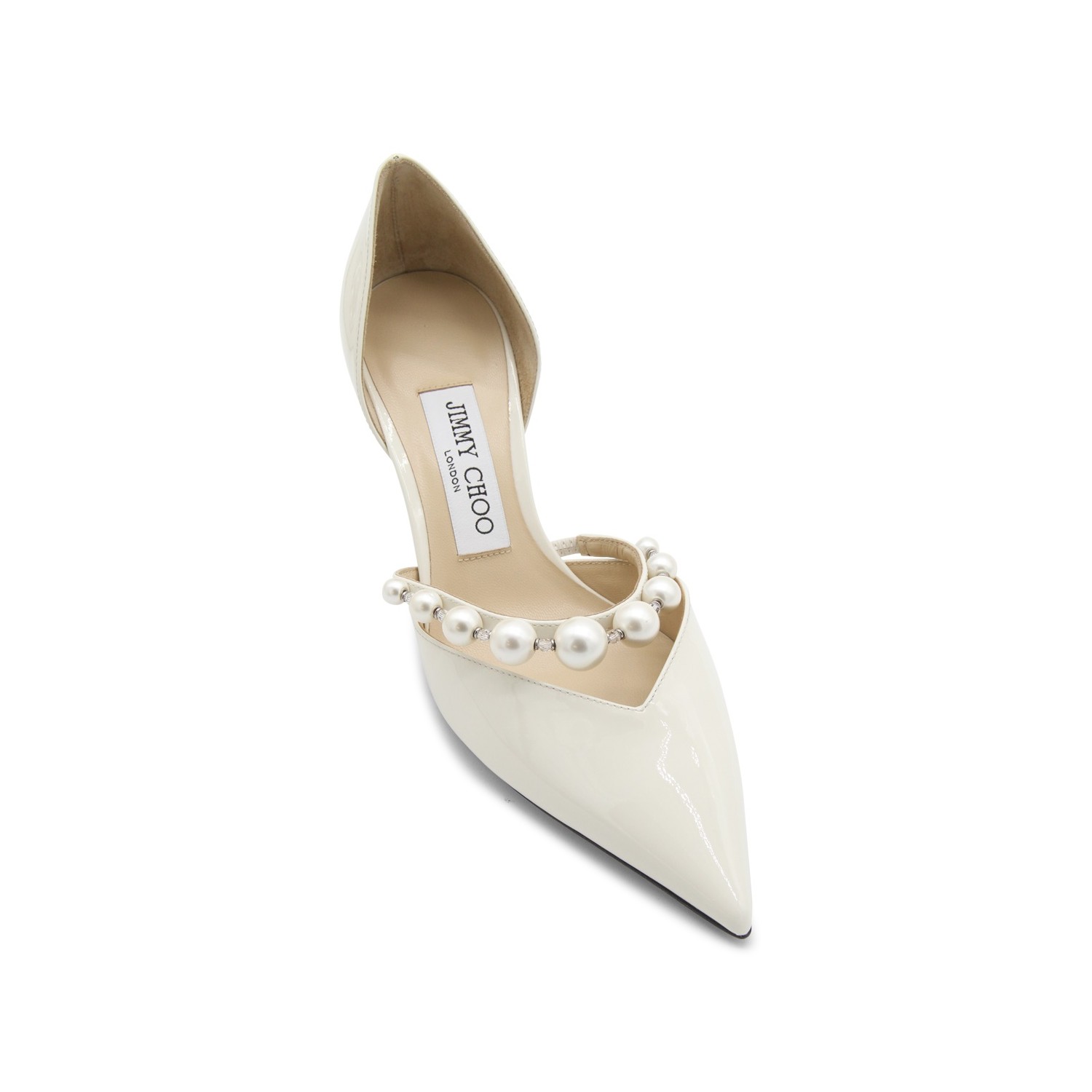 White latte leather Aurelie pumps from Jimmy Choo featuring mid covered heel, pointed toe, branded sole, pearl details and leather insole.