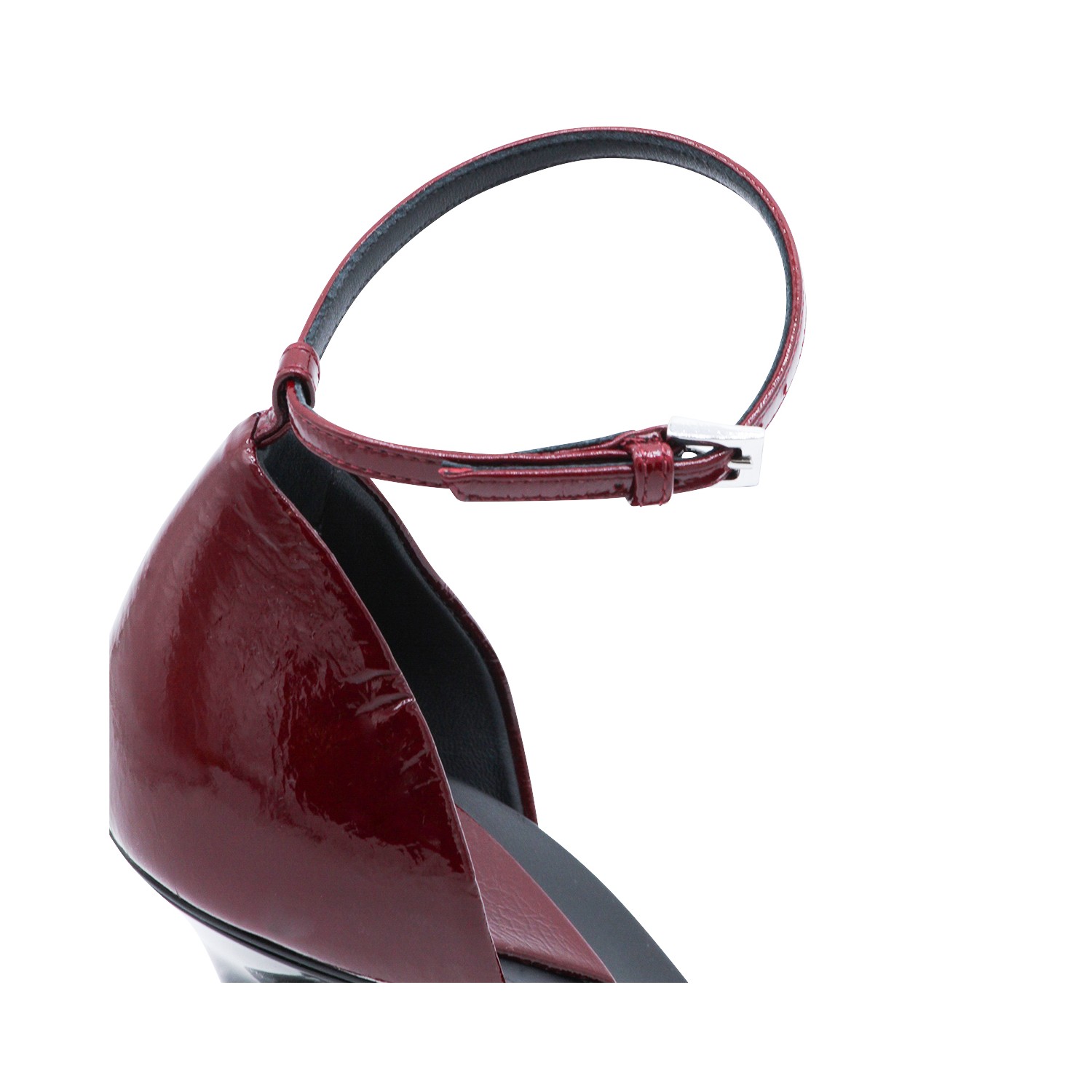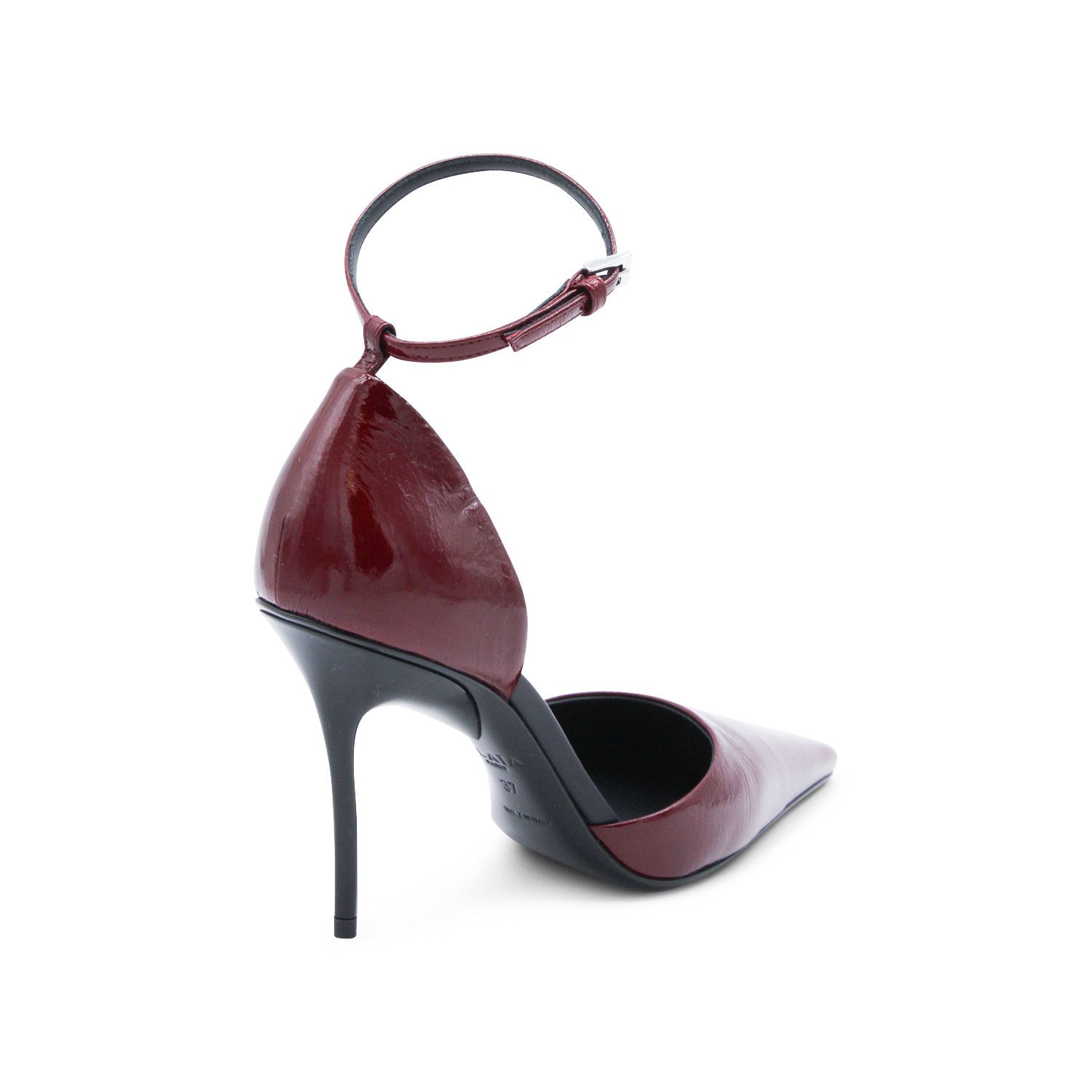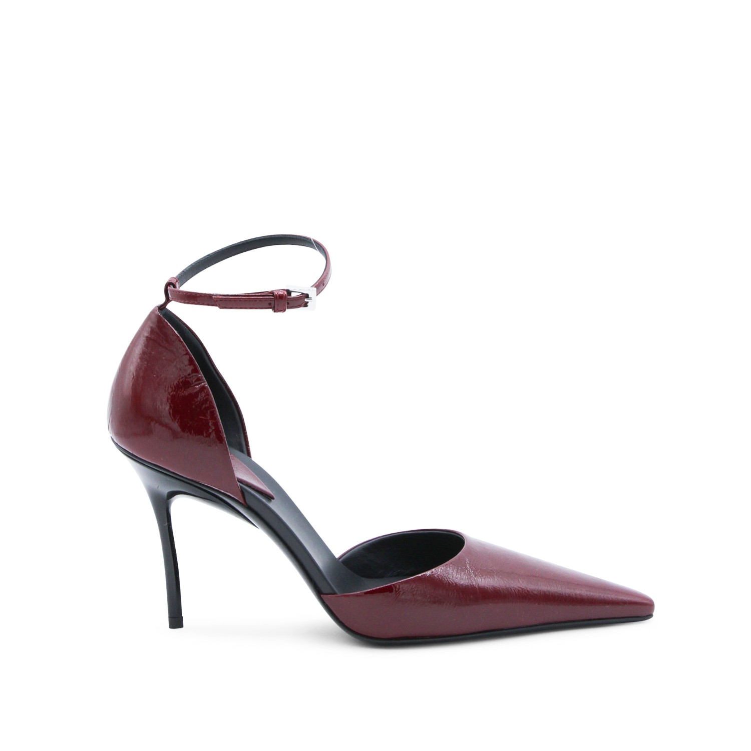 Bordeaux leather D'Orsay 90 pumps from Alaia featuring pointed toe, thin ankle strap, drop shaped heel base, sghtly crinkled shiny leather and laquered stiletto heel.