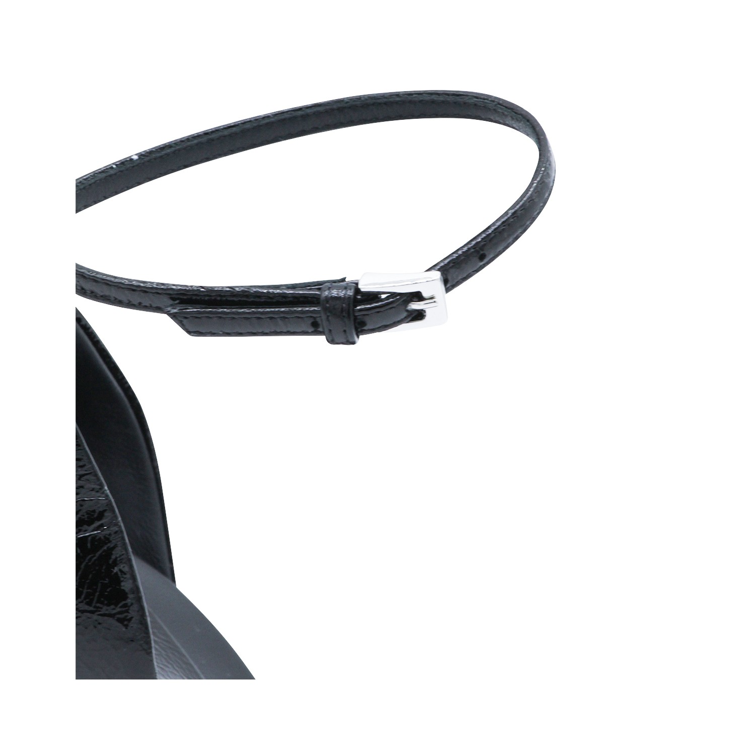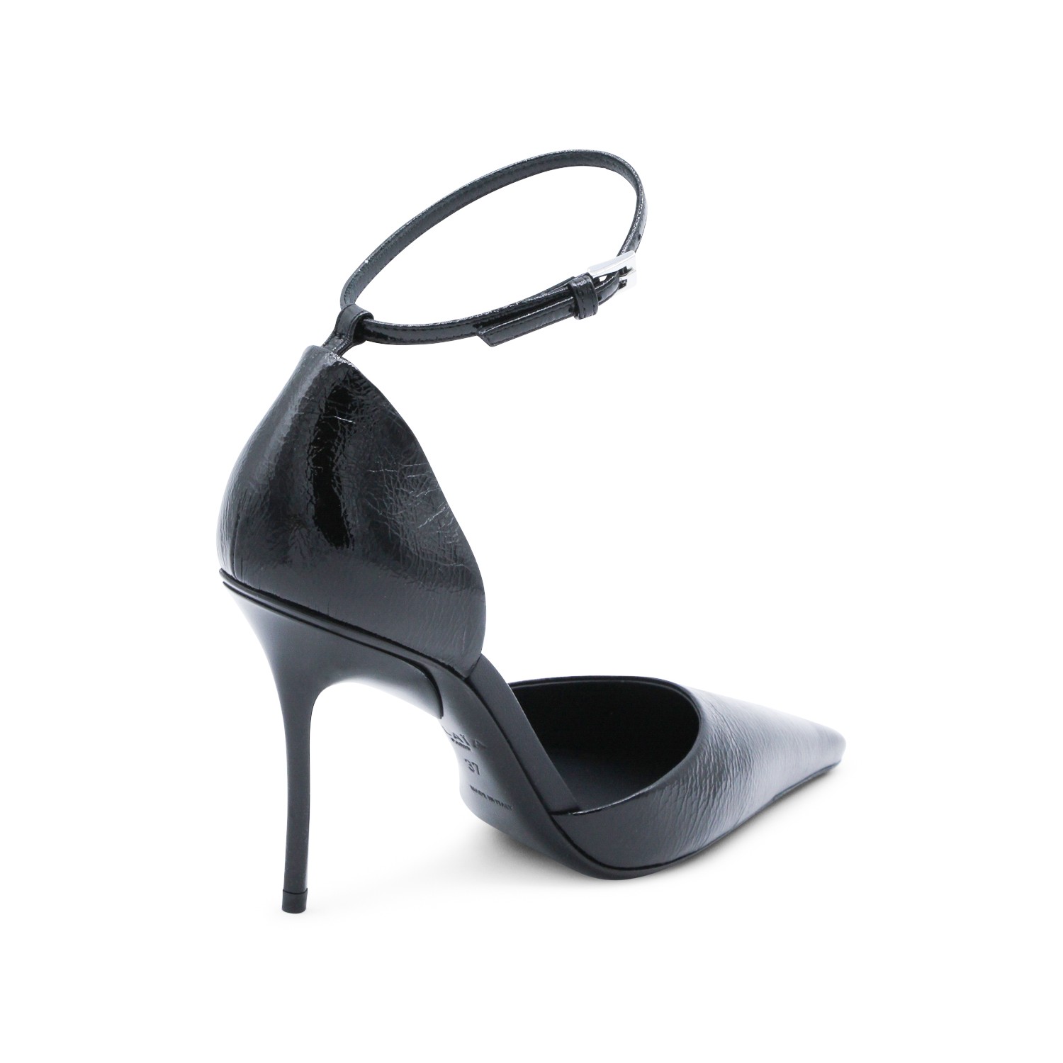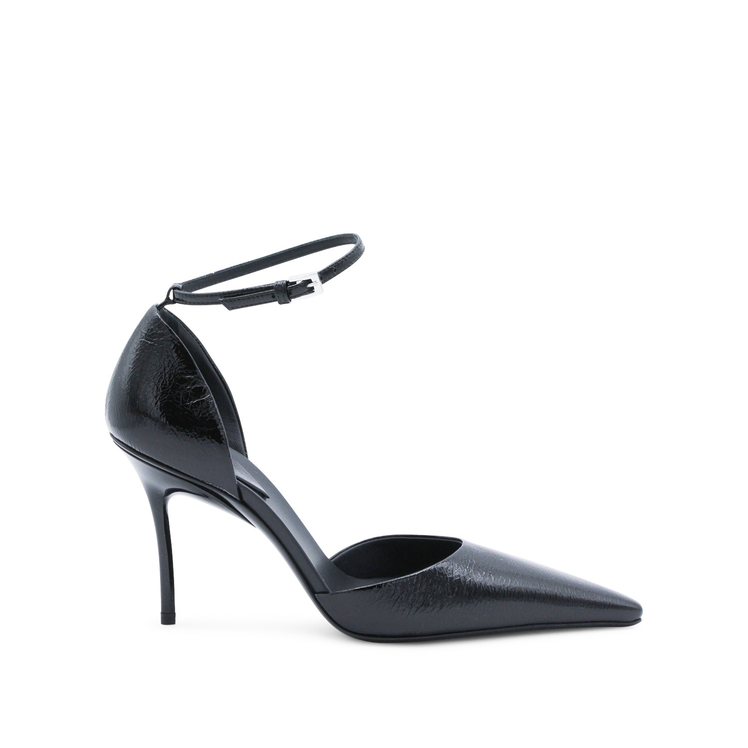 Black leather D'Orsay 90 pumps from Alaia featuring pointed toe, thin ankle strap, drop shaped heel base, sghtly crinkled shiny leather and laquered stiletto heel.