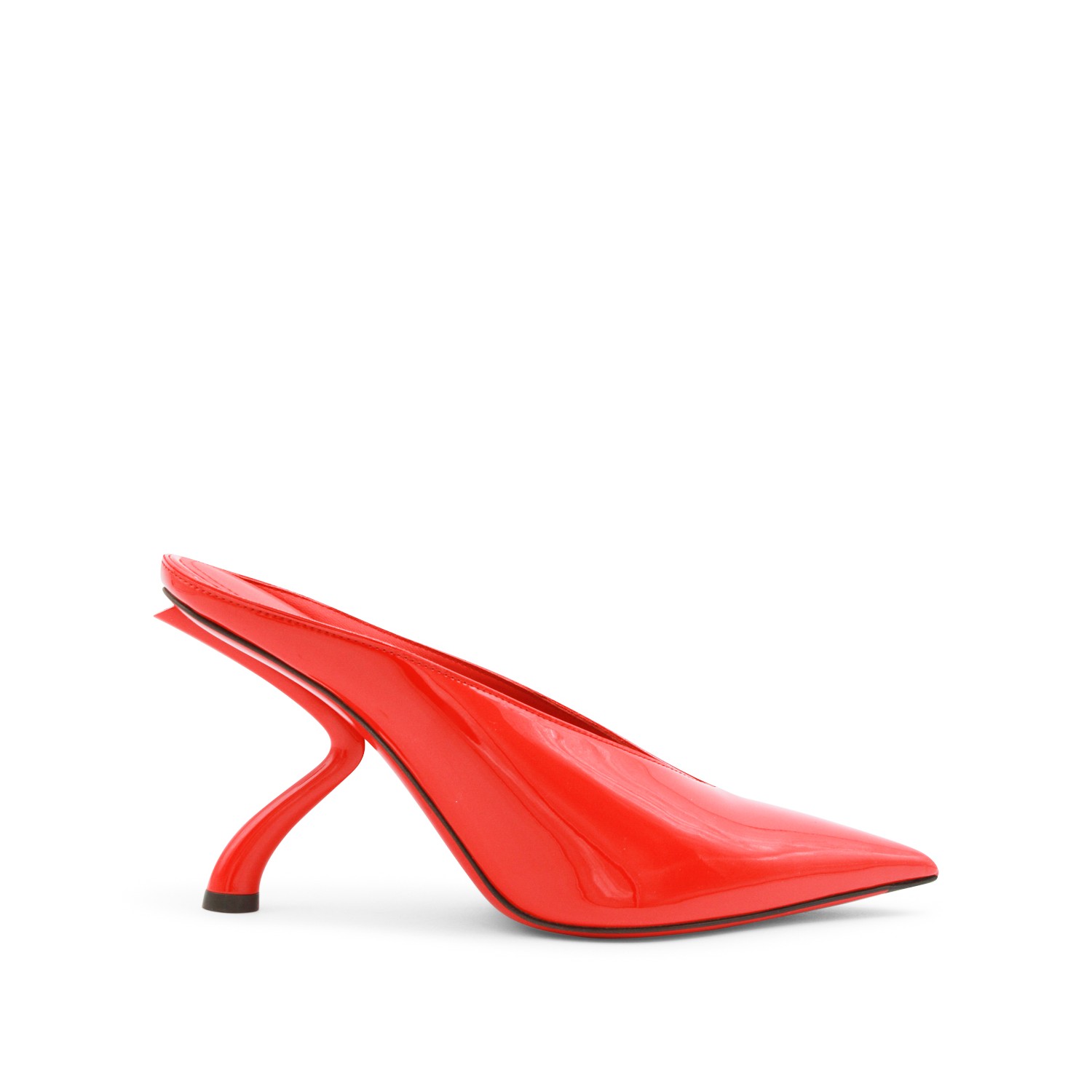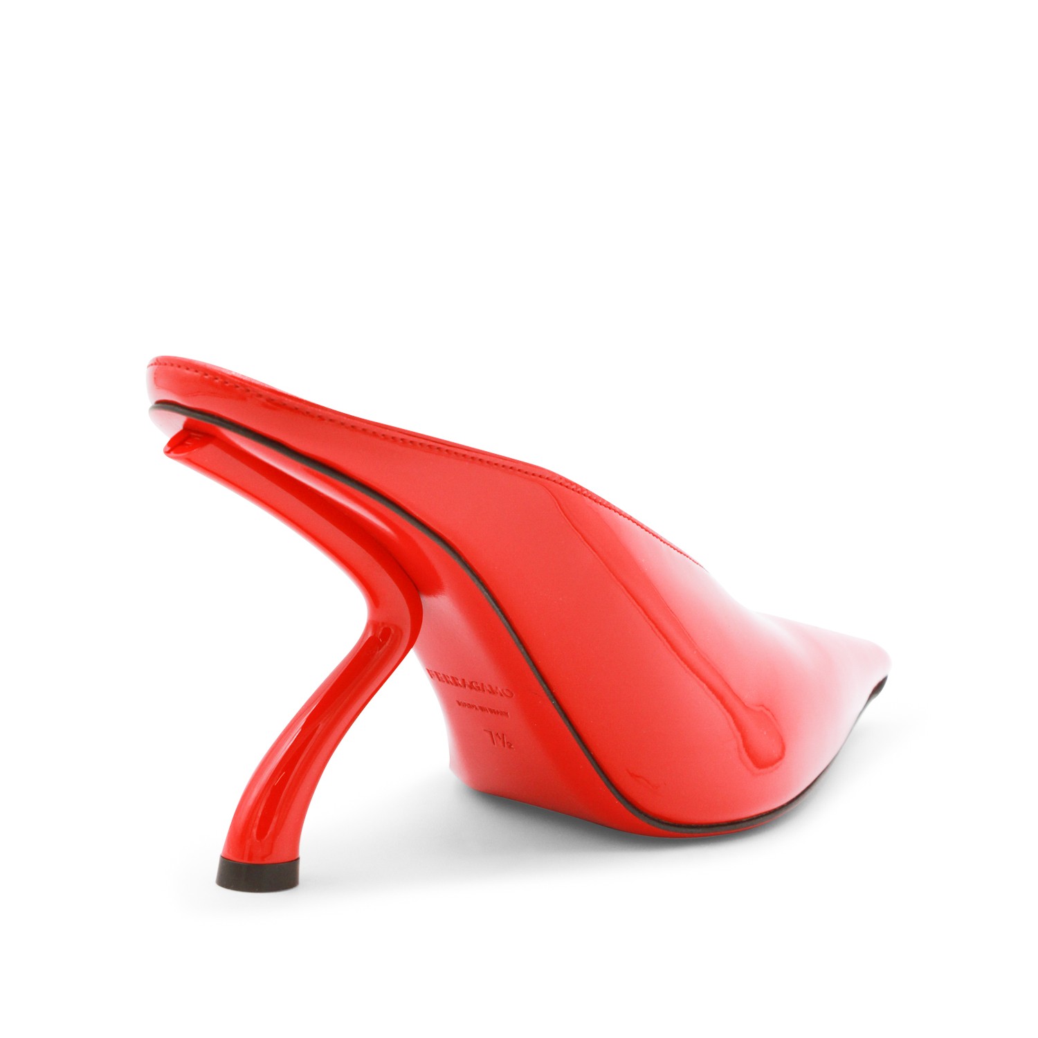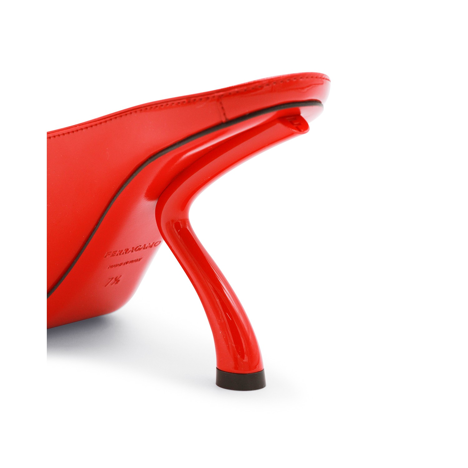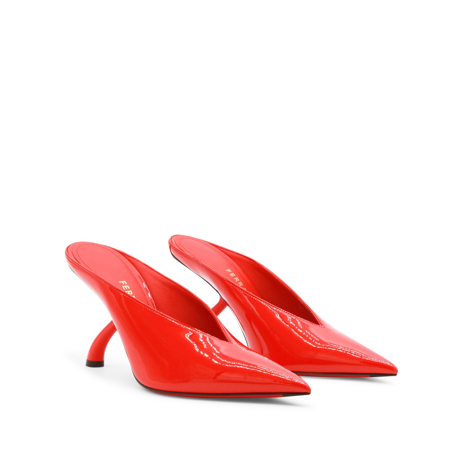 Red leather pumps from Ferragamo featuring pointed toe, open back, leather sole and geometric heel.