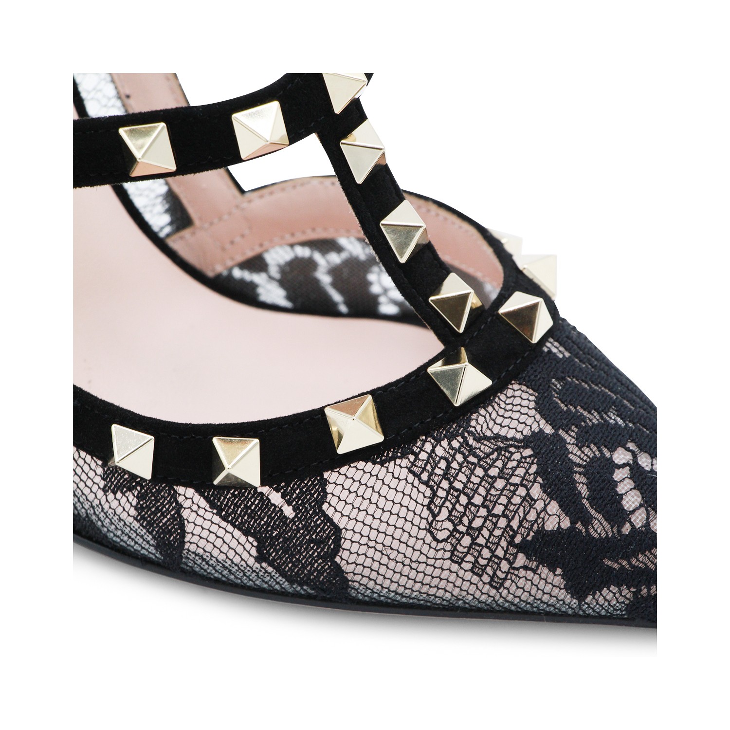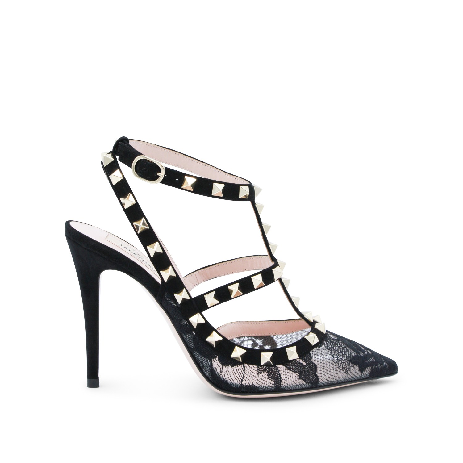 Black leather Rockstud pumps from Valentino Garavani featuring pointed toe, adjustable strap, lace details, studs and high stiletto heel.