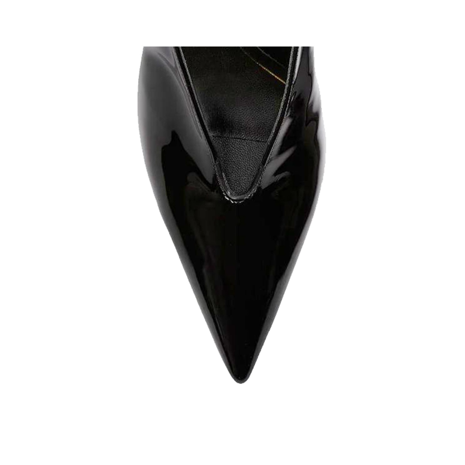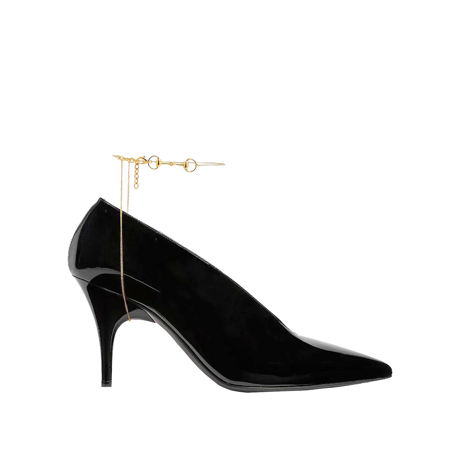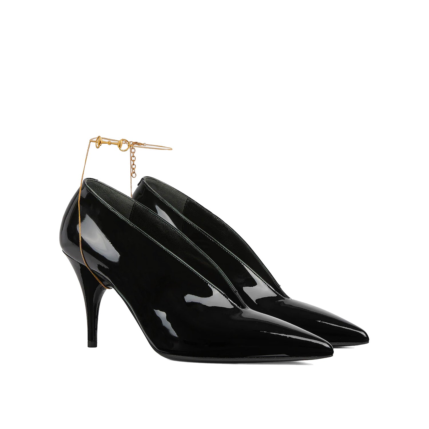 Black leather Gucci 97 pumps from Gucci featuring pointed toe, patent leather, gold tone chain ankle buckle and mid heel.