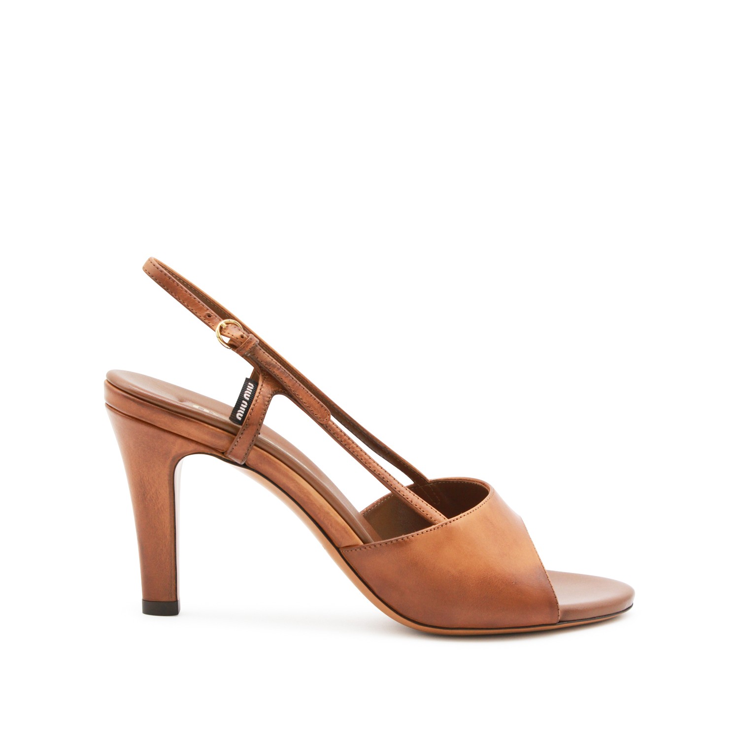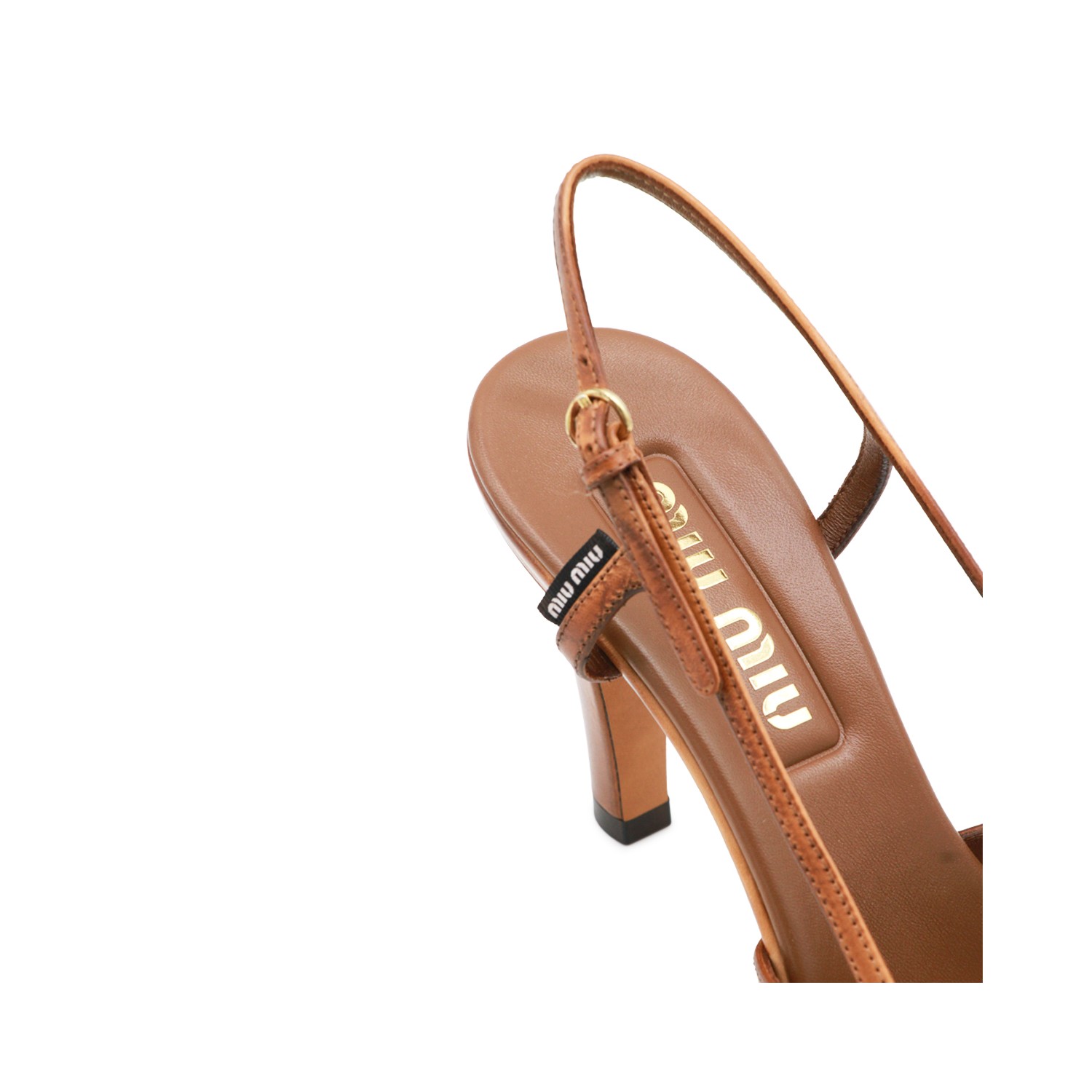 Brown leather sandals from Miu Miu featuring round open toe, adjustable ankle strap fastening, branded insole and stiletto heel.