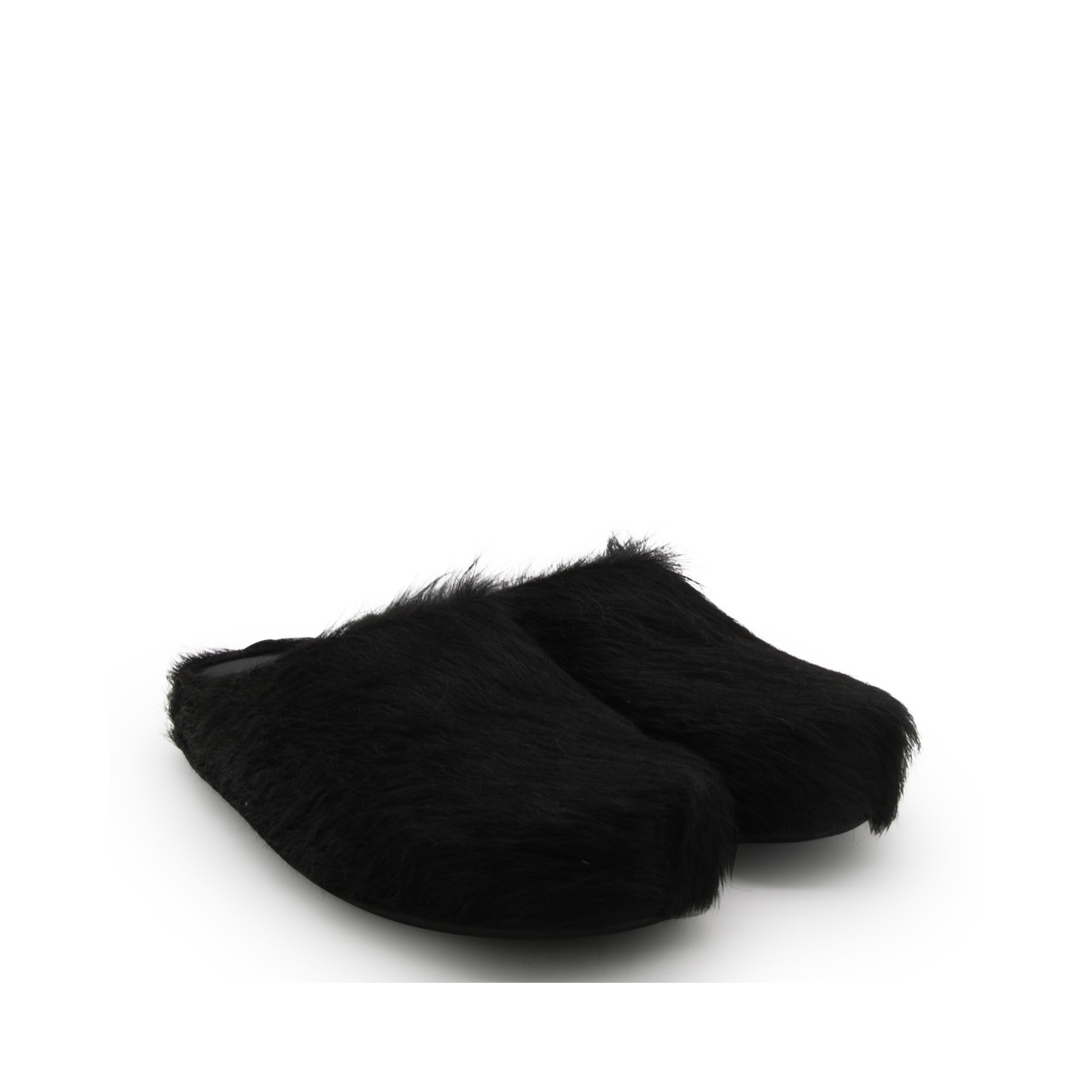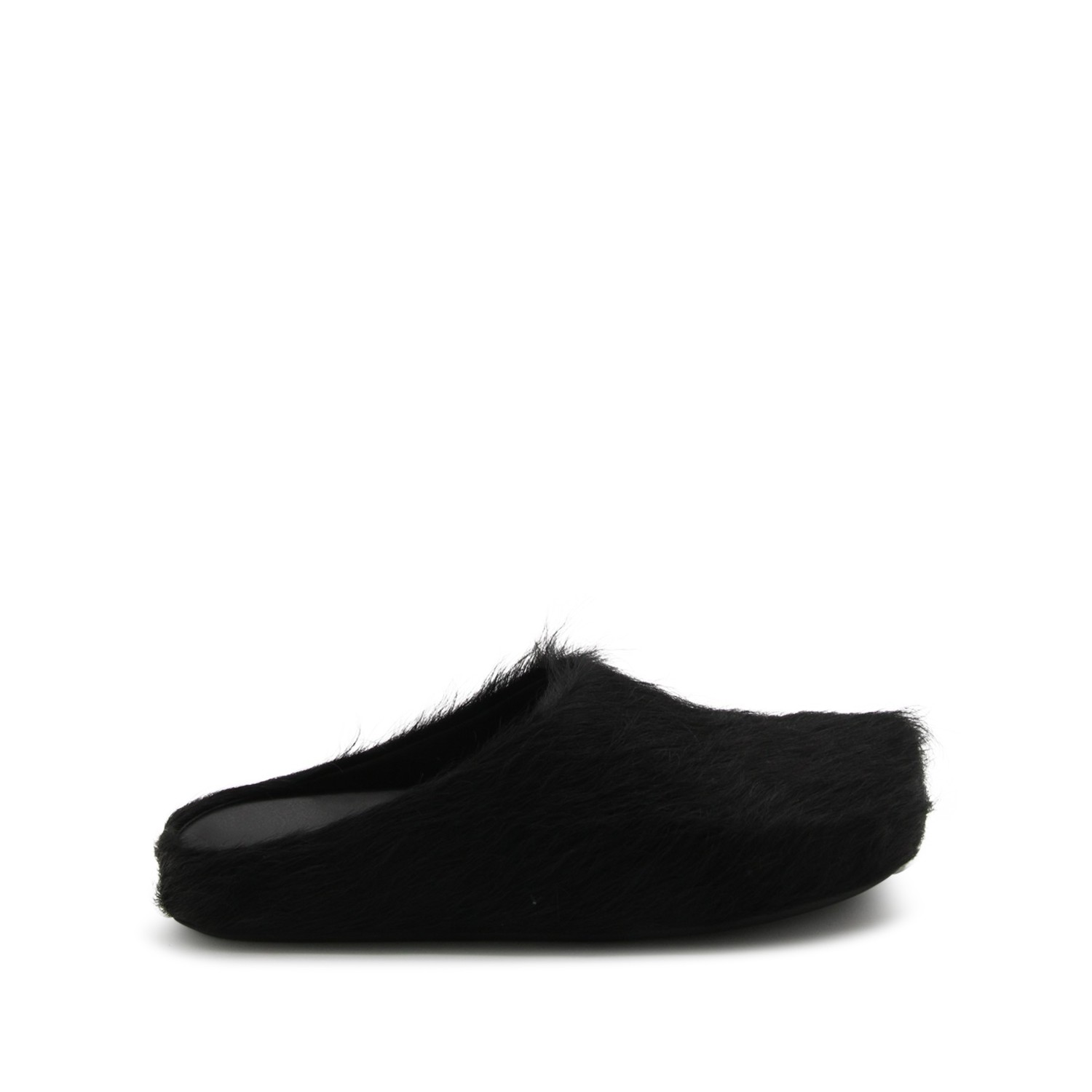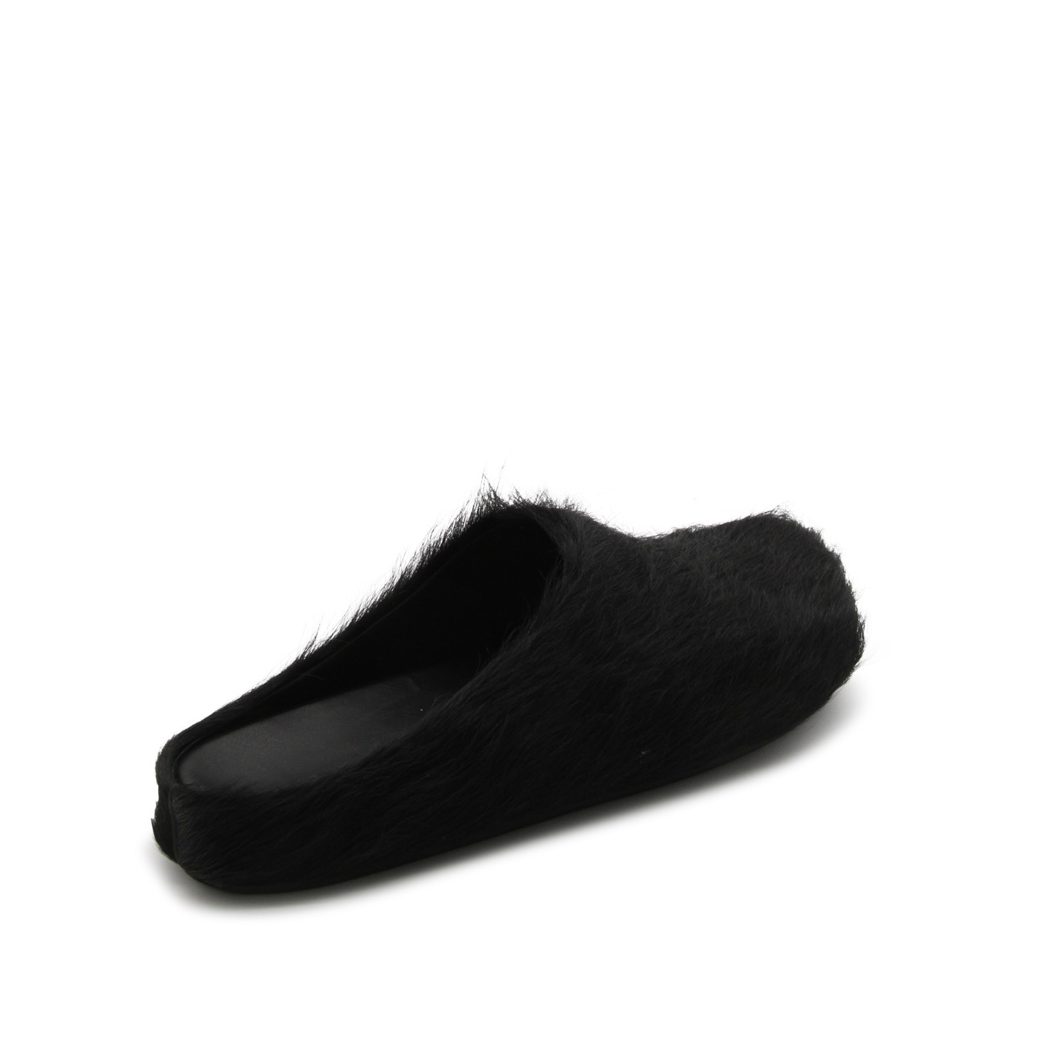 Black leather flats from Marni featuring round toe, slip-on style, calf hair upper and rubber sole.