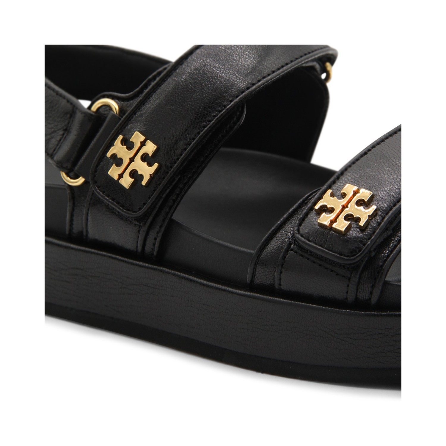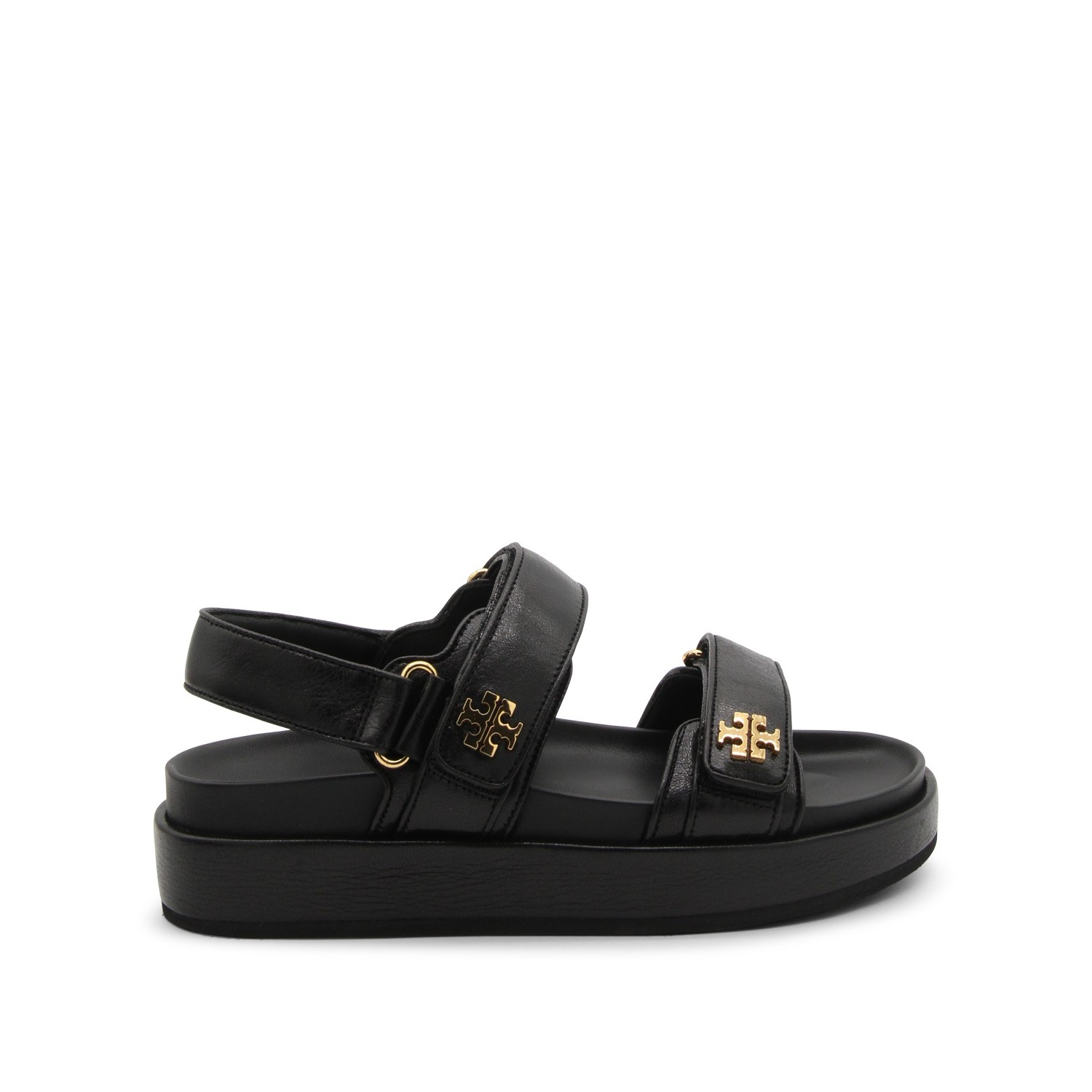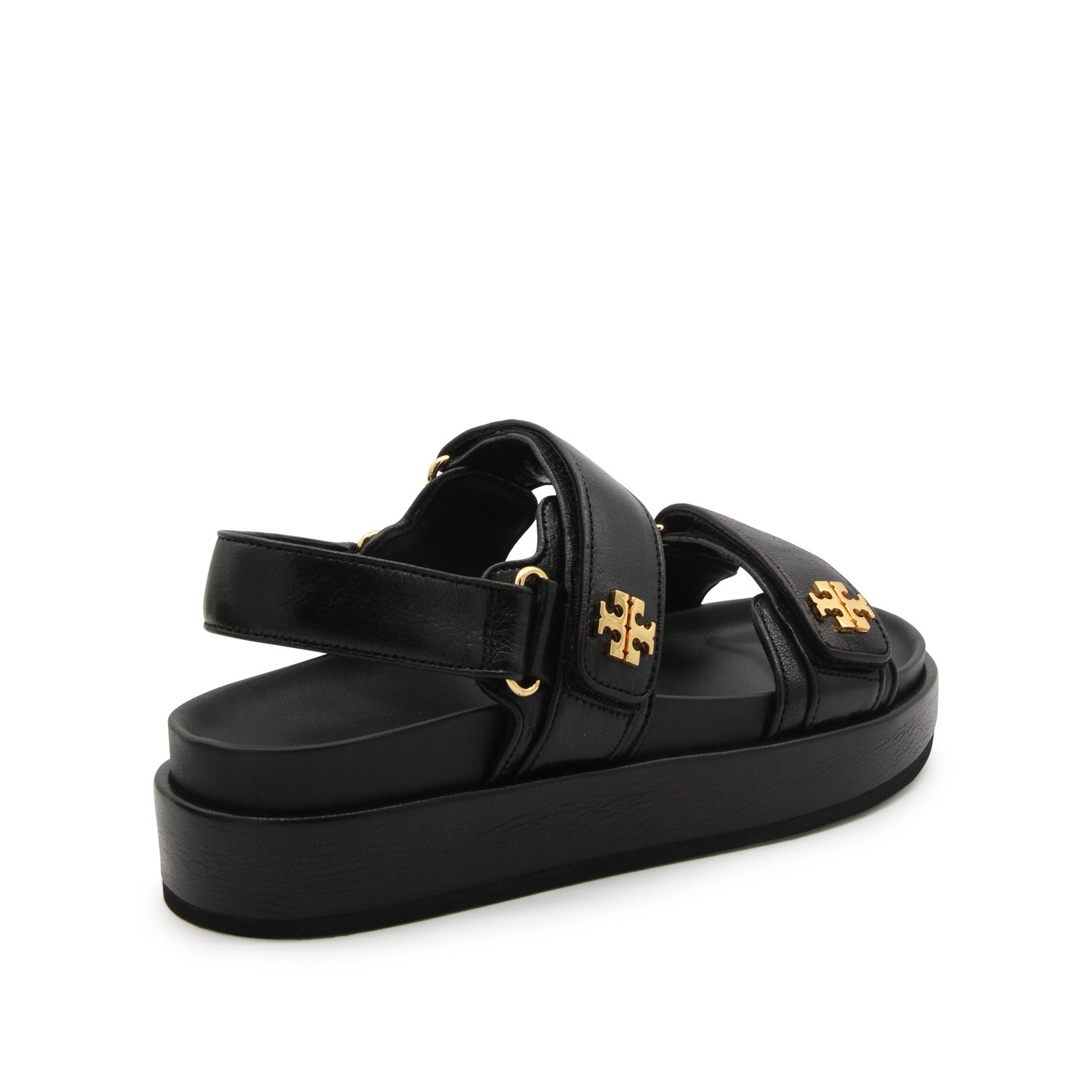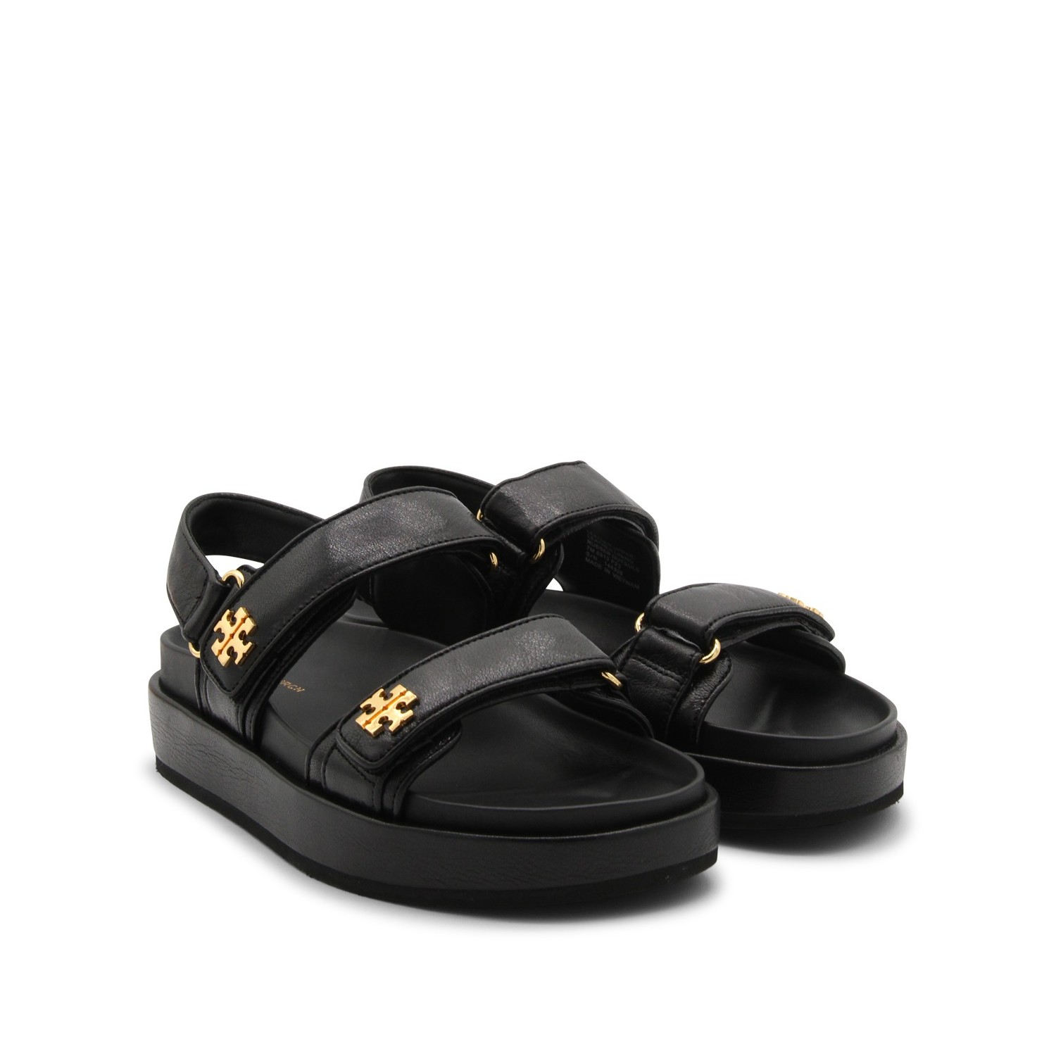 Black leather Kira Sports sandals from Tory Burch featuring open toe, adjustable double Velcro straps, gold tone metal finishes, platform heel and logo details.