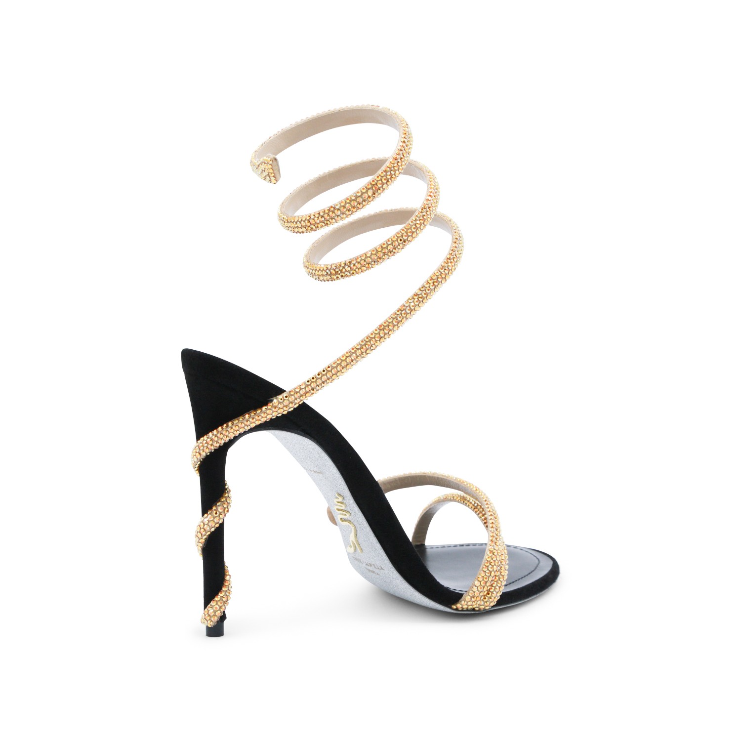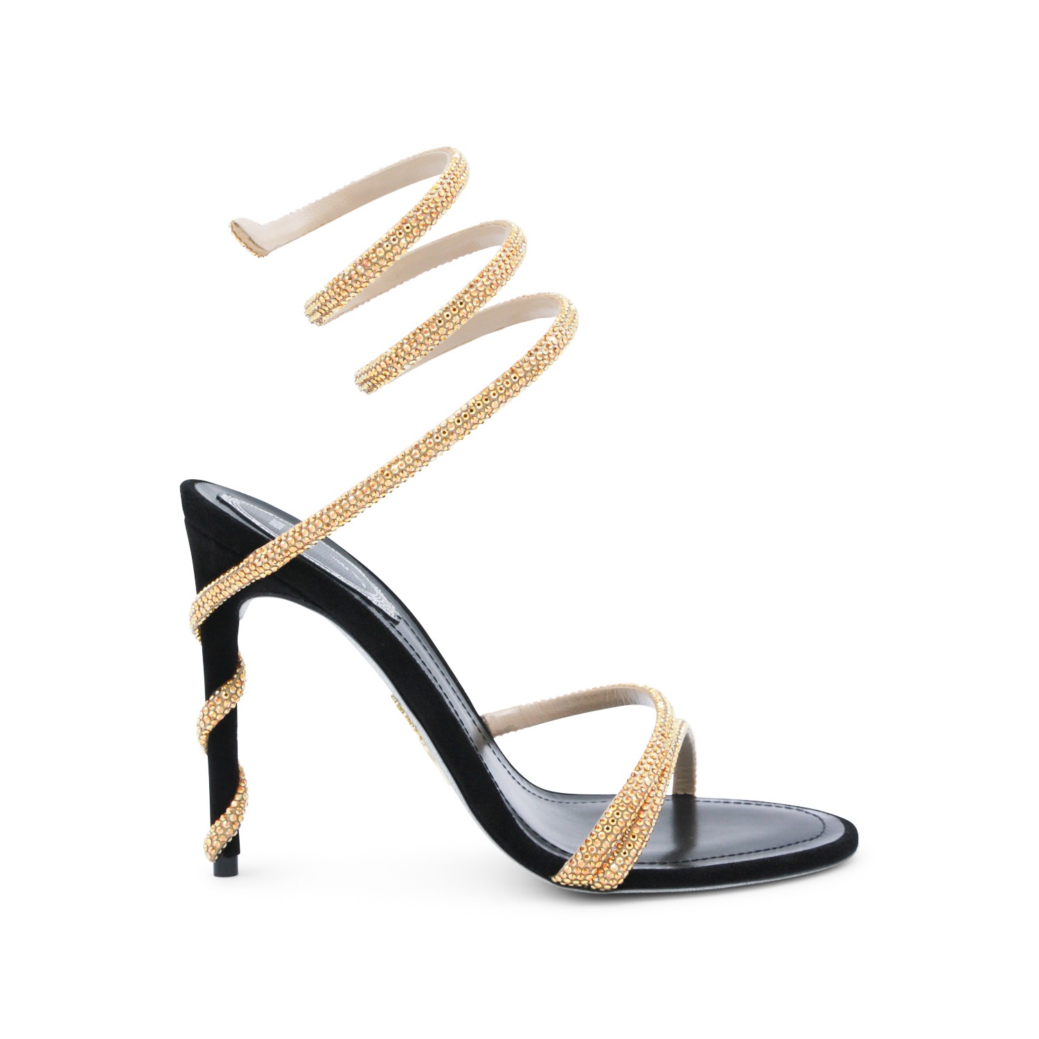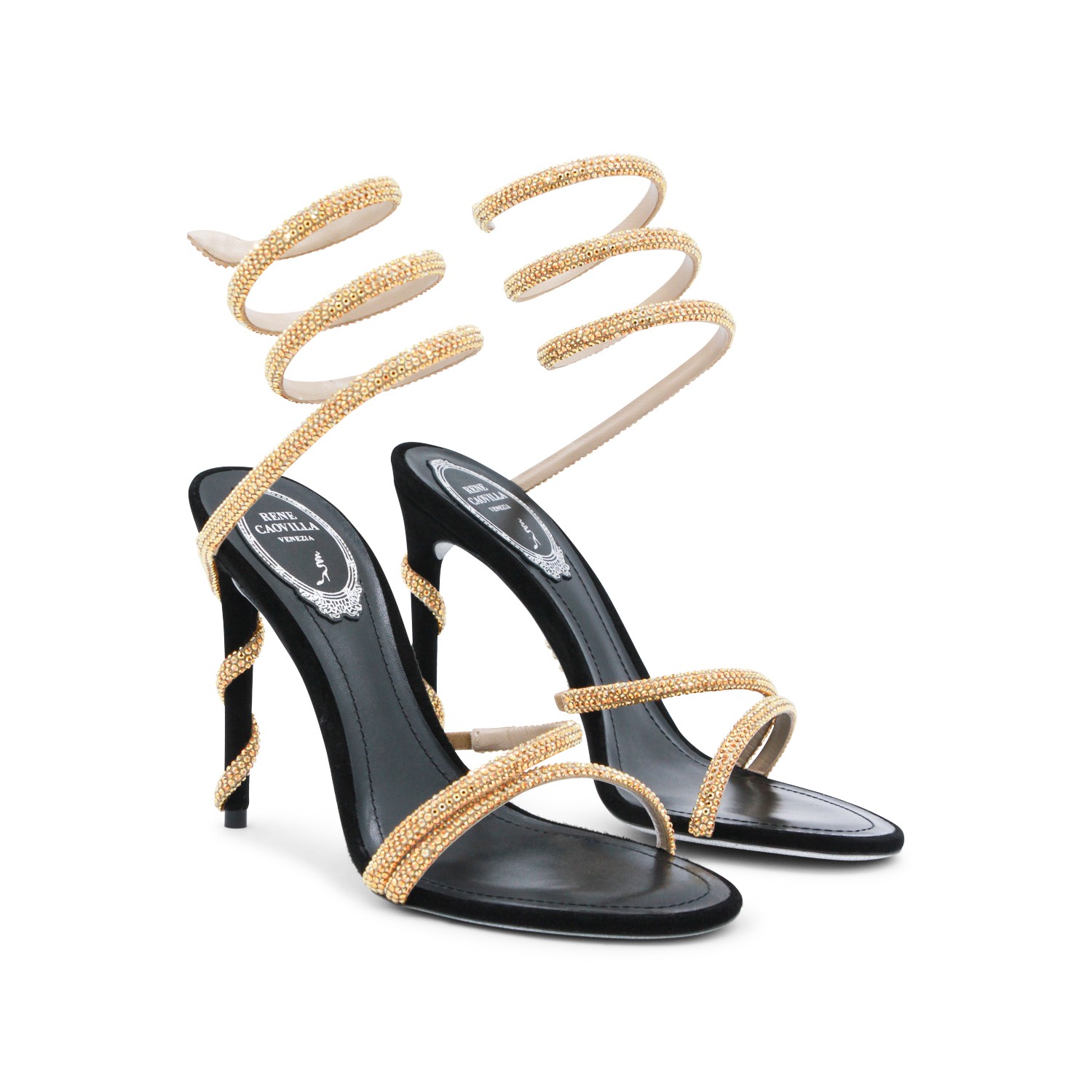 Black and gold leather sandals from Rene Caovilla featuring round toe, open back and lateral, stiletto heel, ankle golden detail and strass.