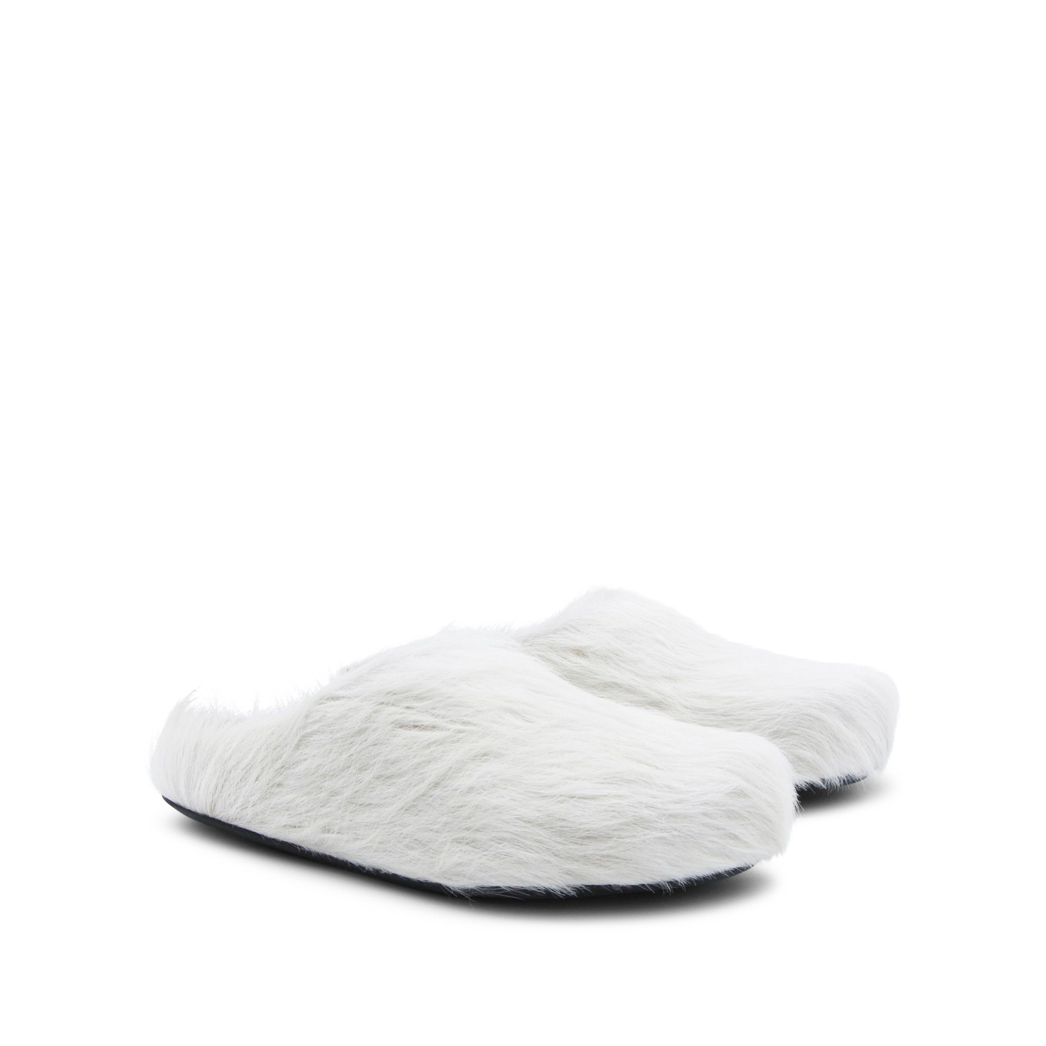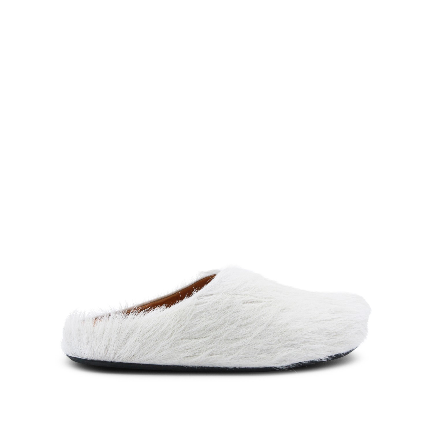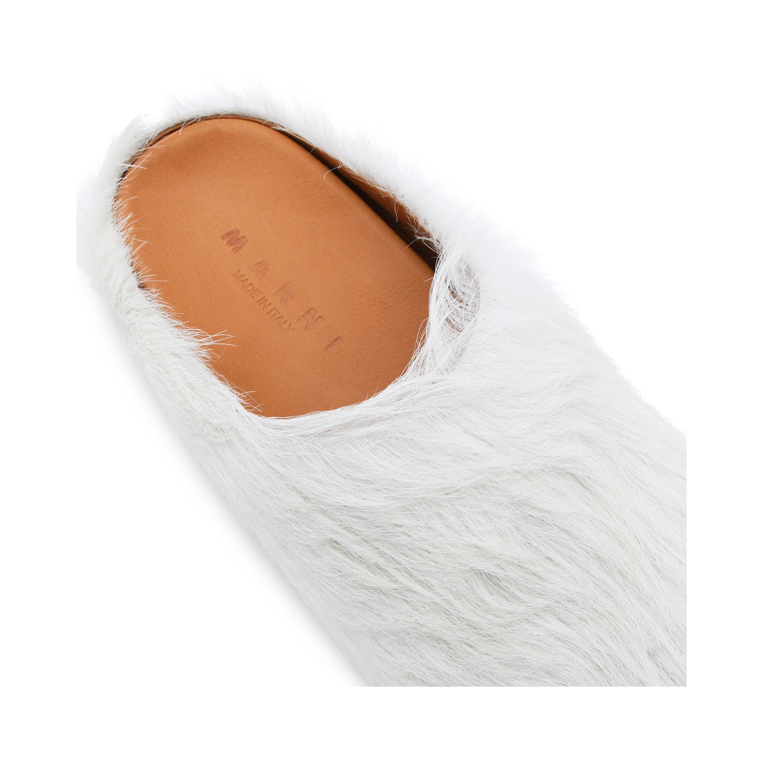 White leather sandals from Marni featuring round toe, open back, slip-on style, calf hair upper and rubber sole.