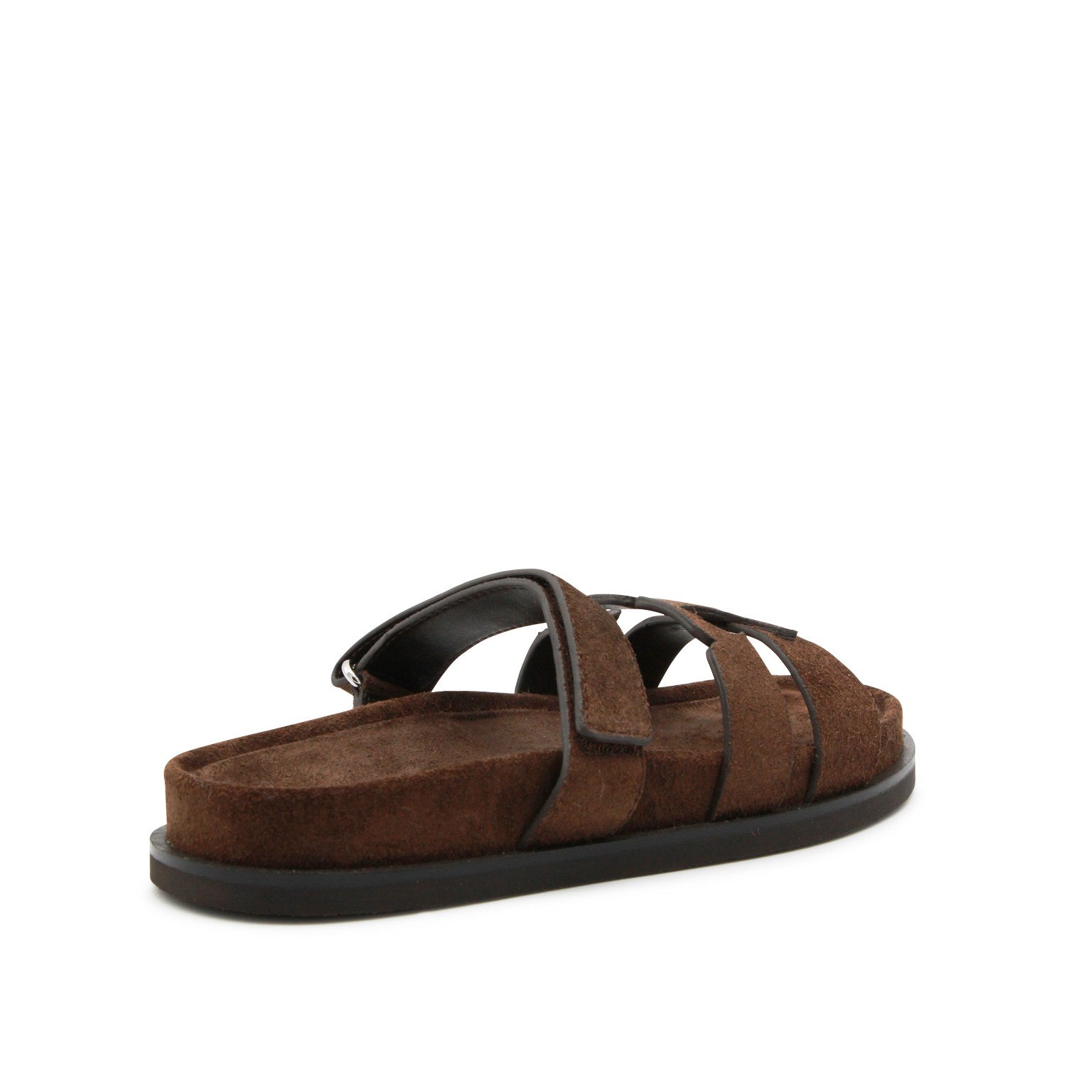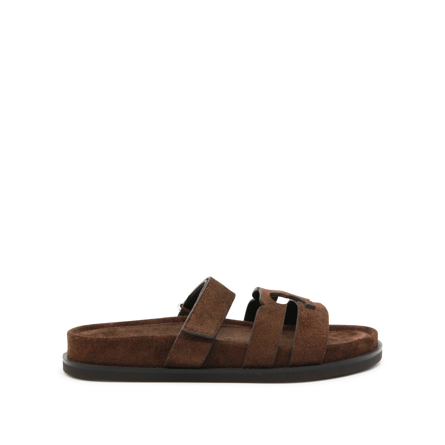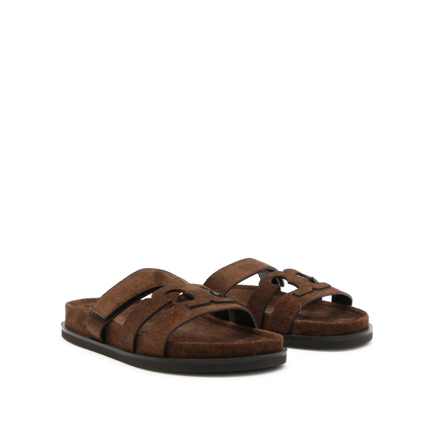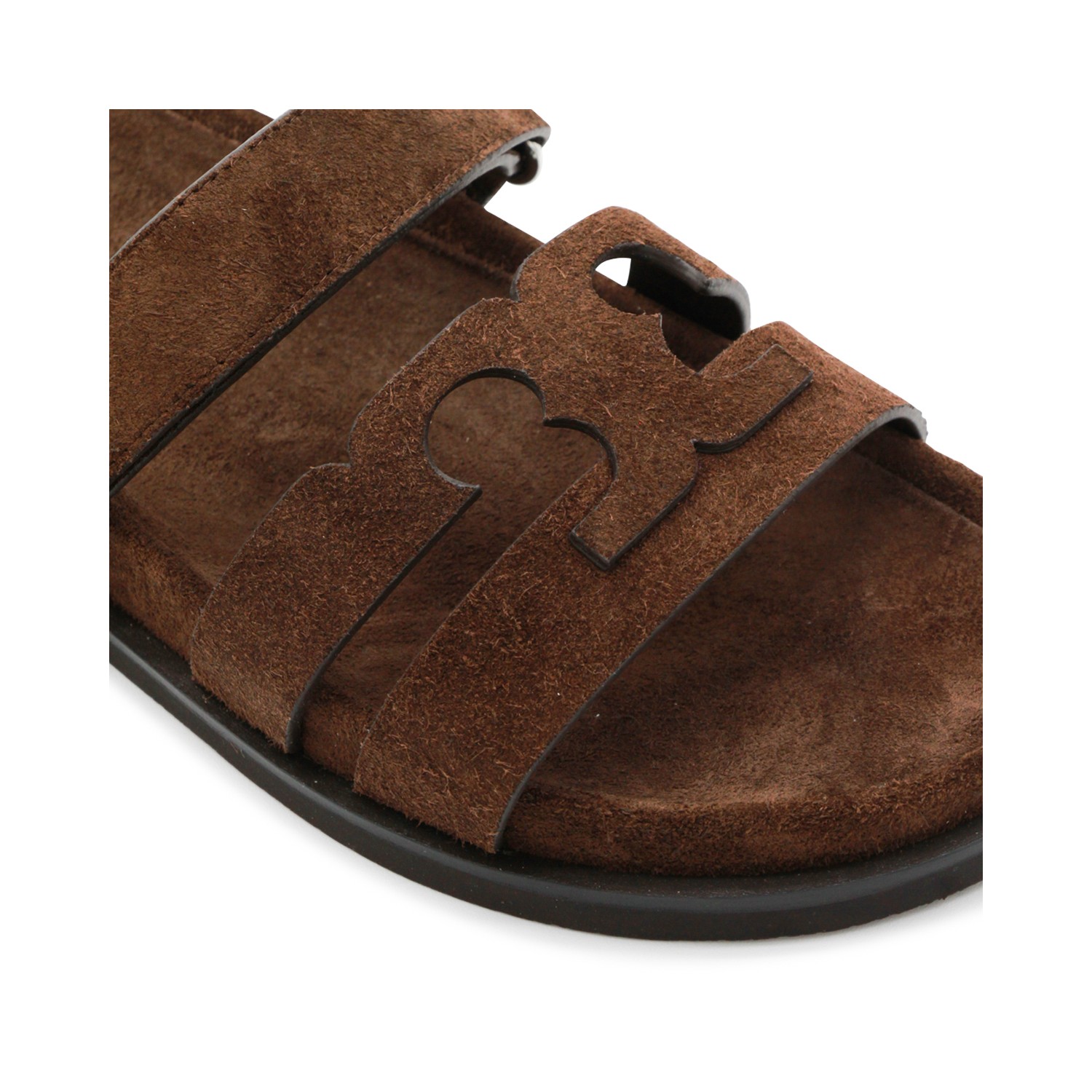 Brown leather sandals from Tory Burch featuring featuring double-strap design, open toe, slip-on style and ridged rubber sole.