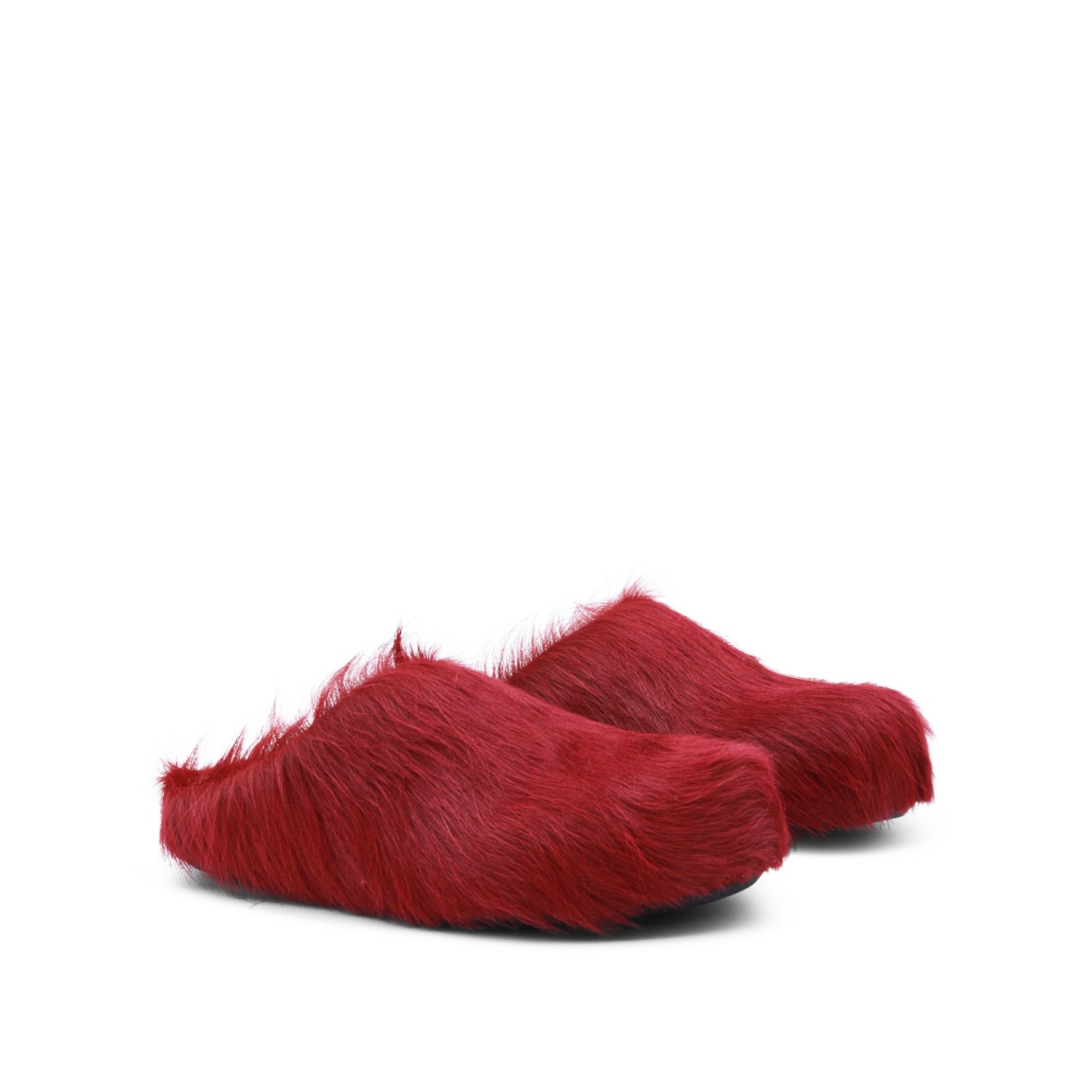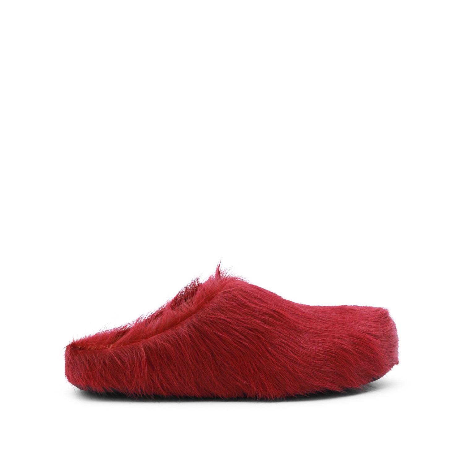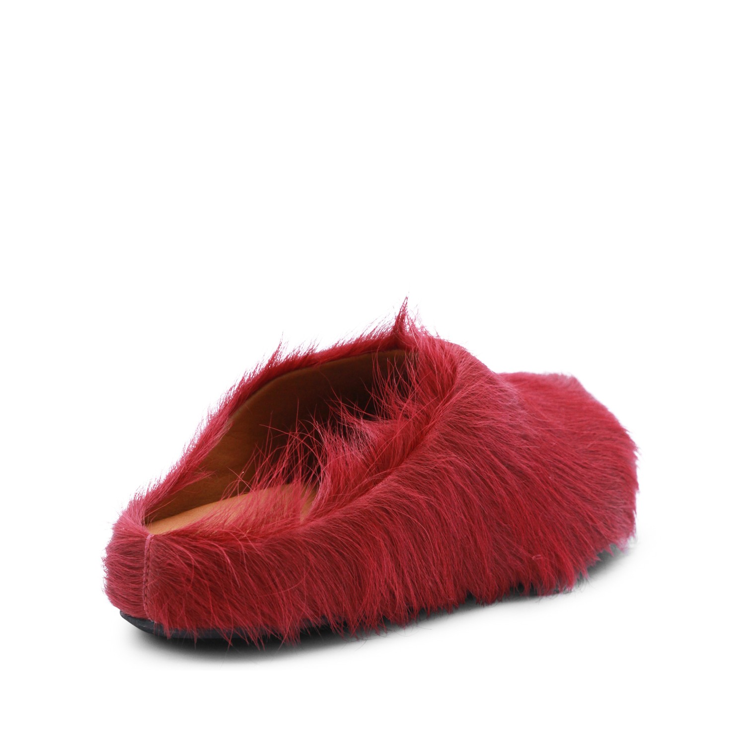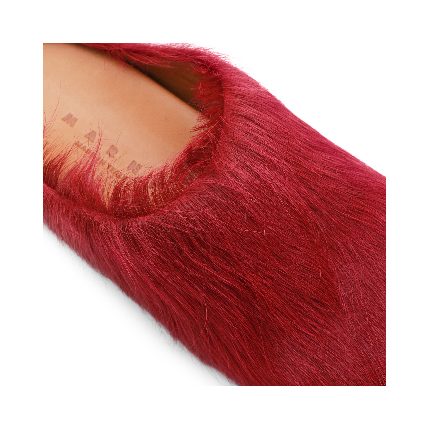 Red leather sandals from Marni featuring round toe, open back, slip-on style, calf hair upper and rubber sole.