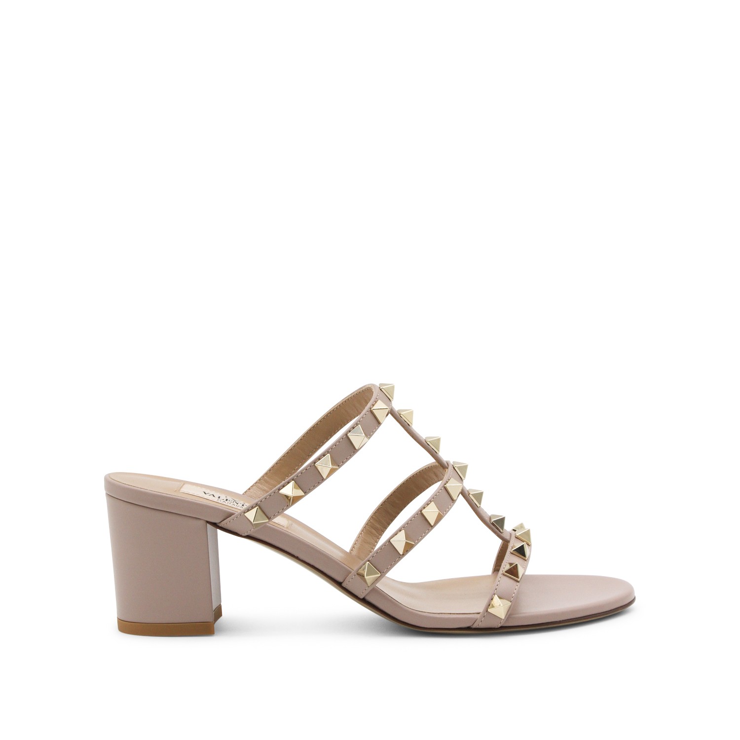Beige leather sandals from Valentino Garavani featuring open round toe, slip-on style, studs, square heel and open back.