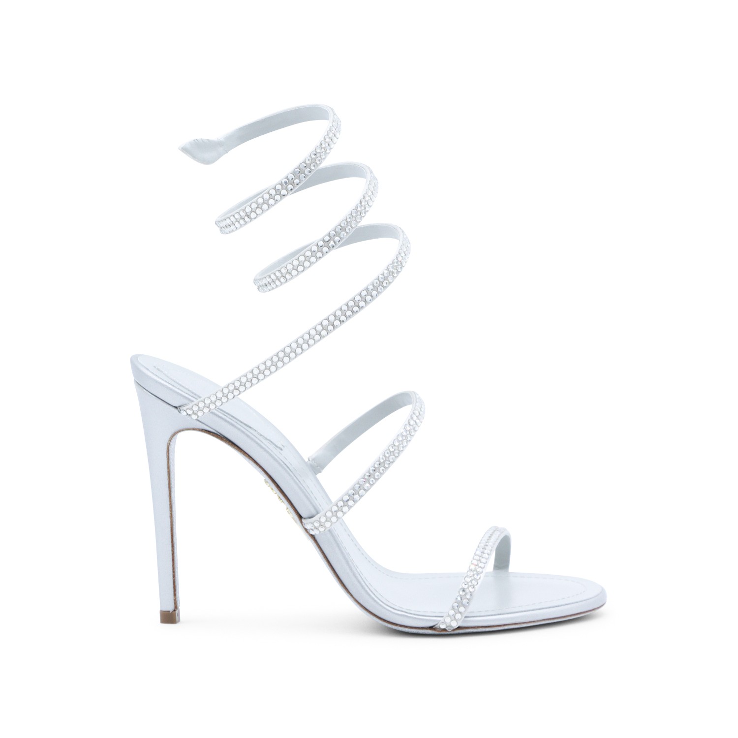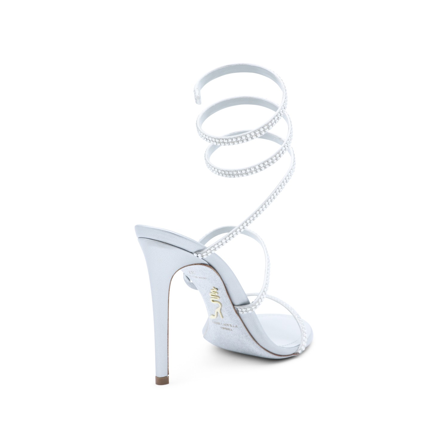 Silver leather Cleo sandals from RenCaovilla featuring round open toe, frontal thin strap, stiletto heel, snake ankle strap, all-over crystals and stardust sole.