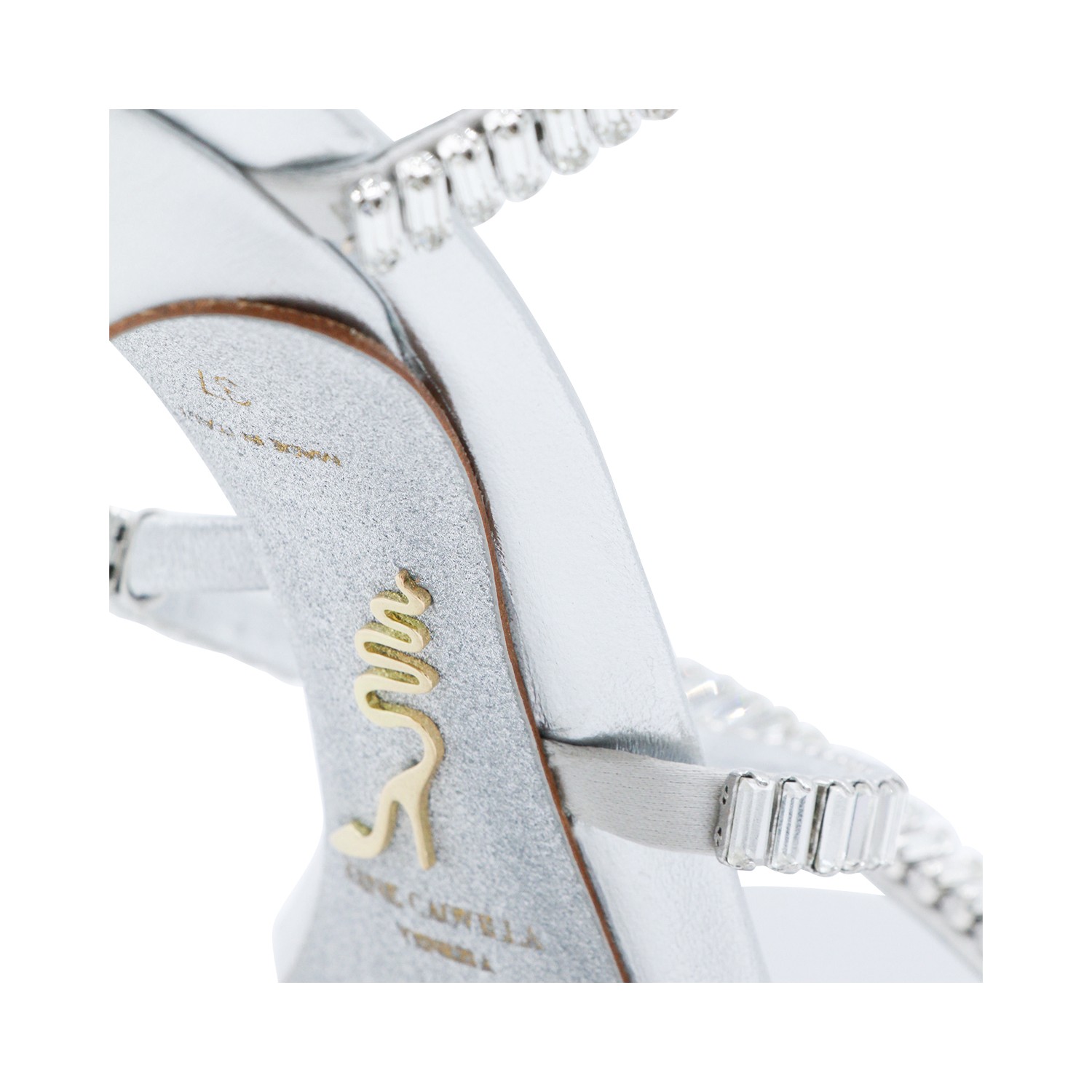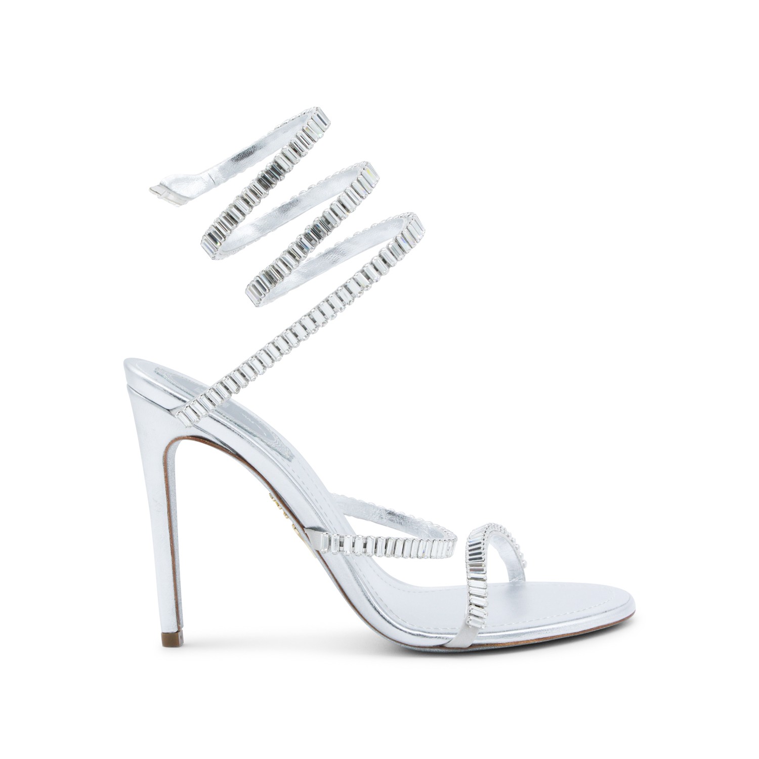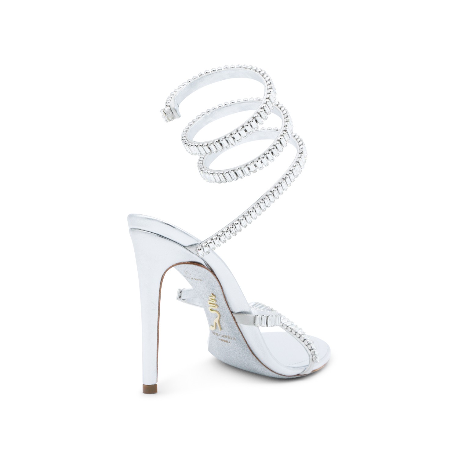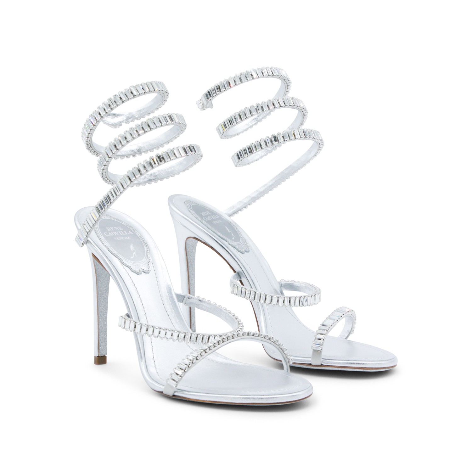 Silver leather sandals from Rene Caovilla featuring round toe, open back and lateral, stiletto heel, ankle detail and strass.