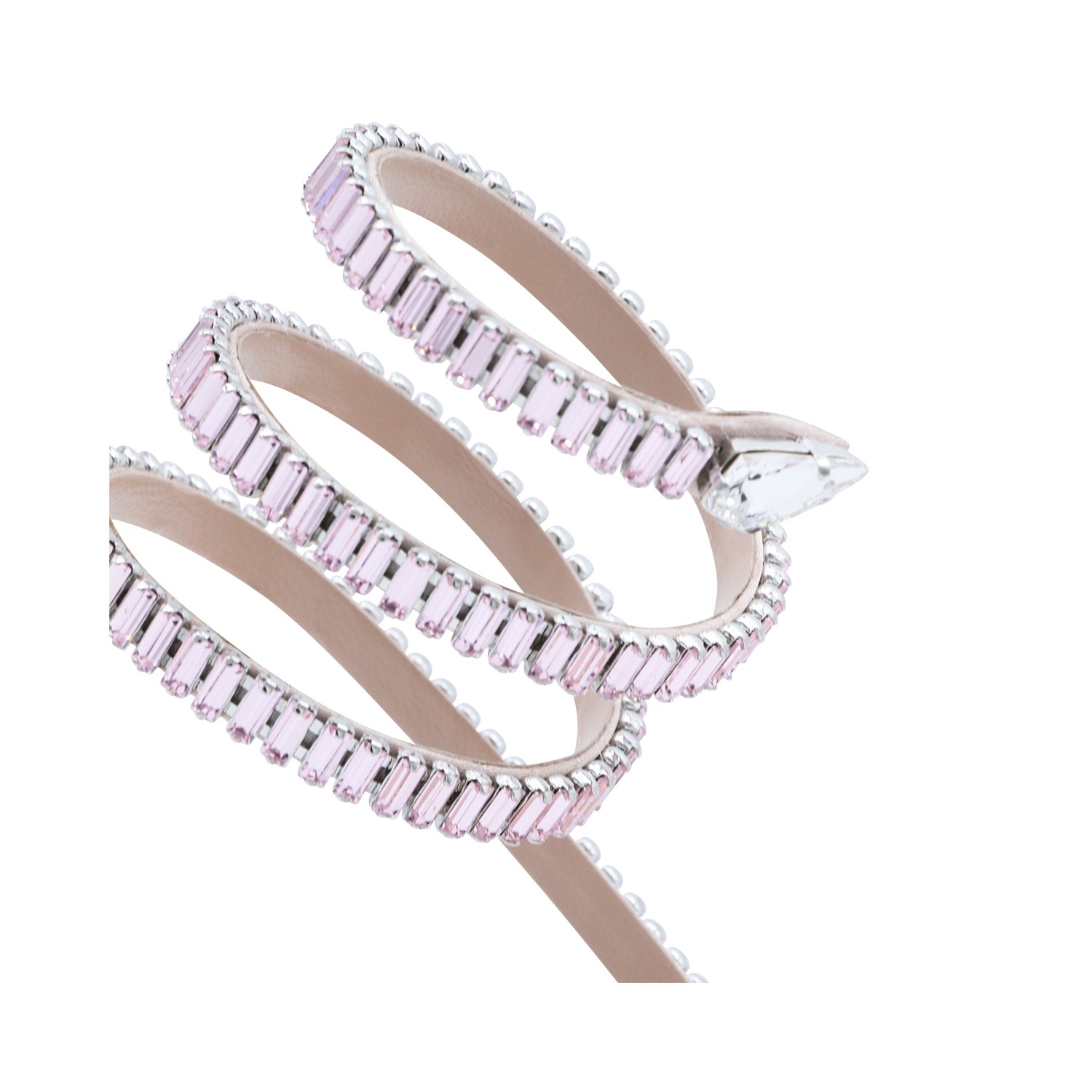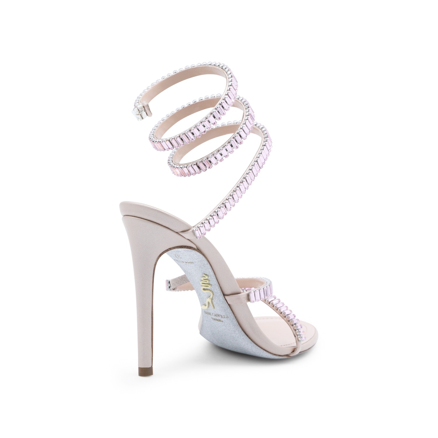 Nude leather sandals from Rene Caovilla featuring open round toe, crystal details, wrapping strap, glitter effect, stiletto heel and leather sole.