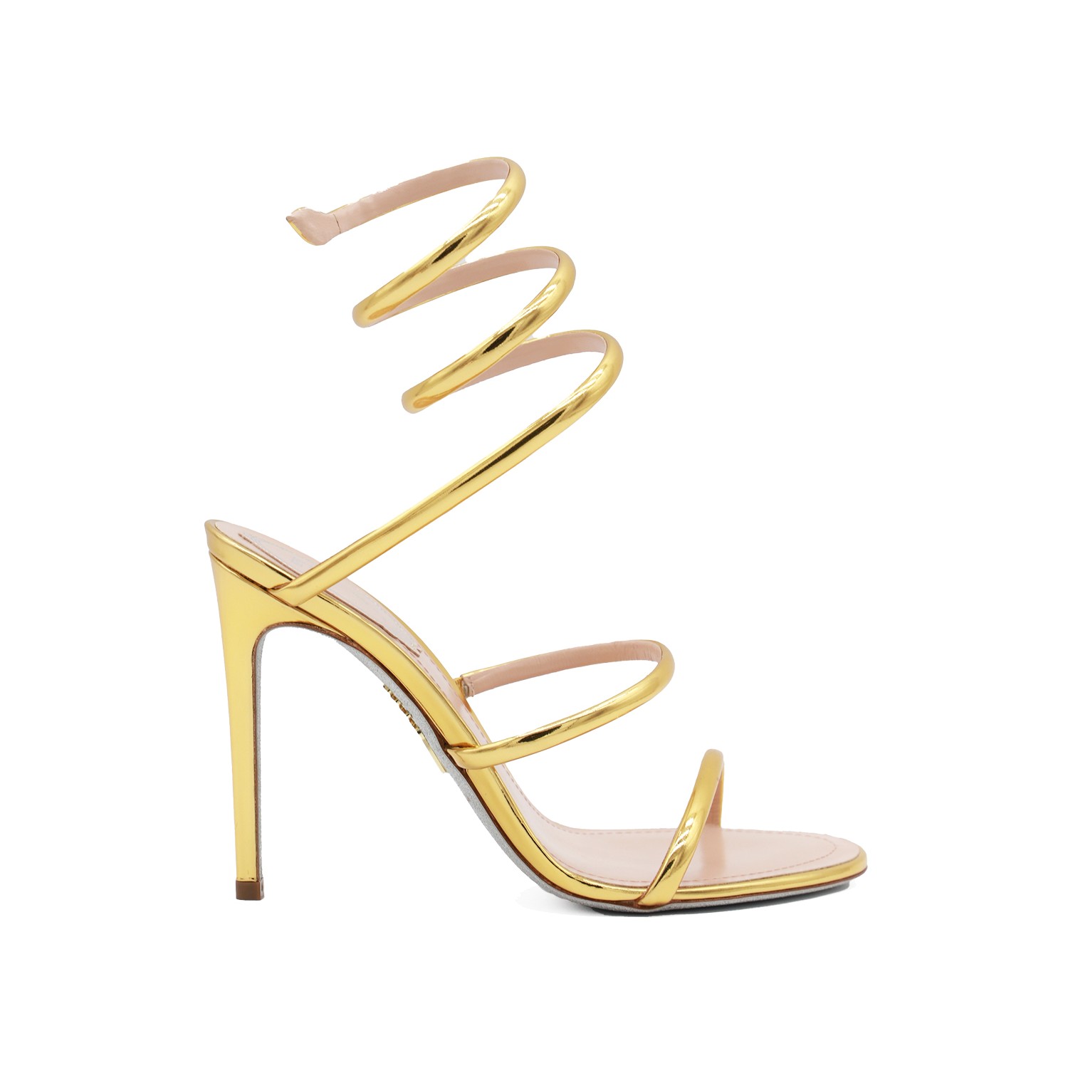 Gold tone leather sandals from Rene Caovilla featuring round toe, ankle detail, stiletto heel and open back.