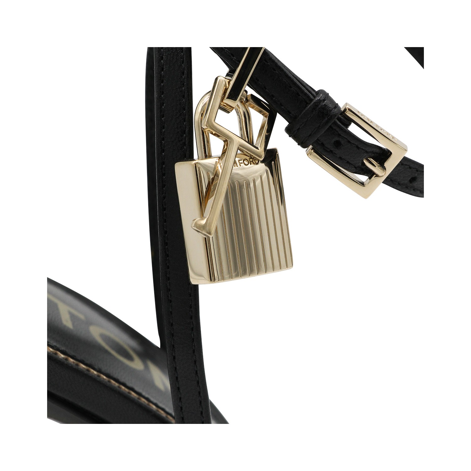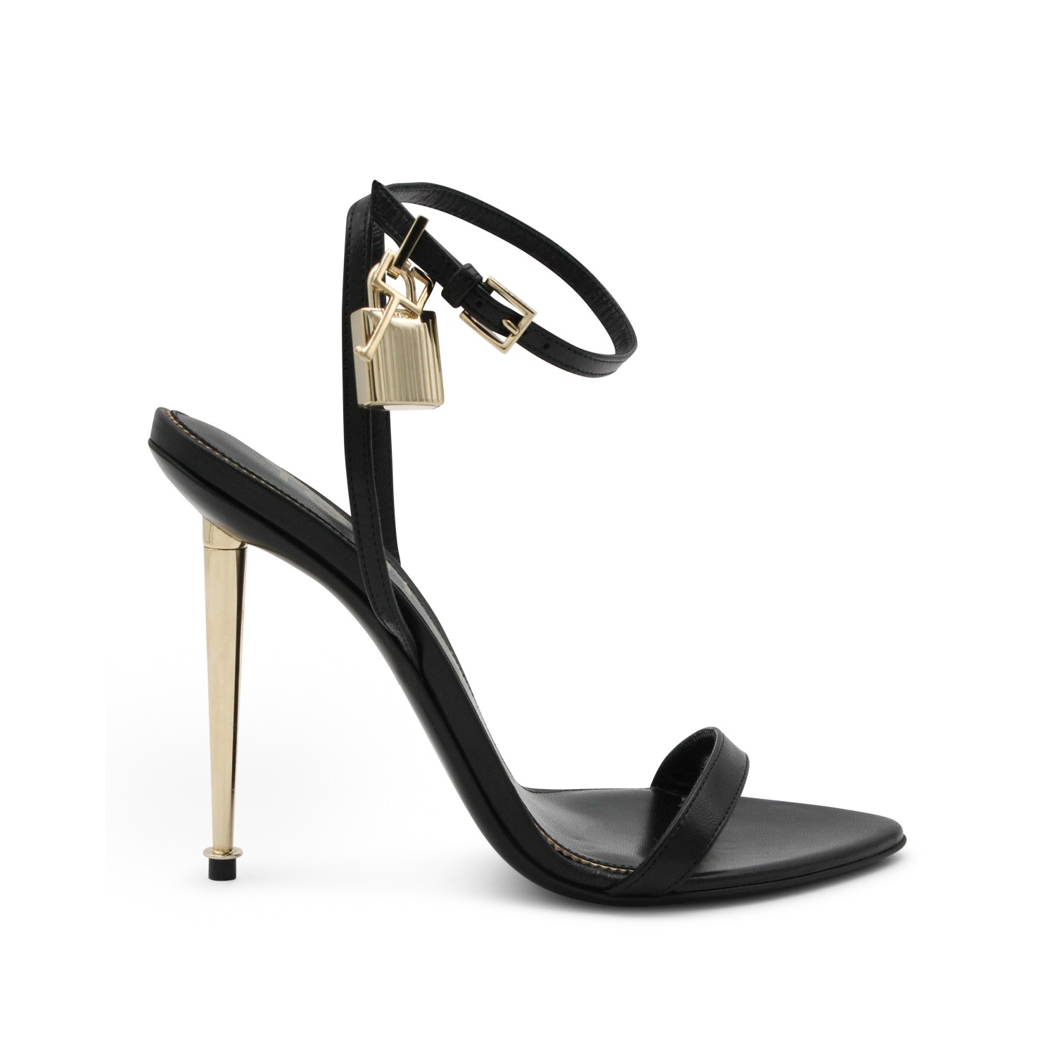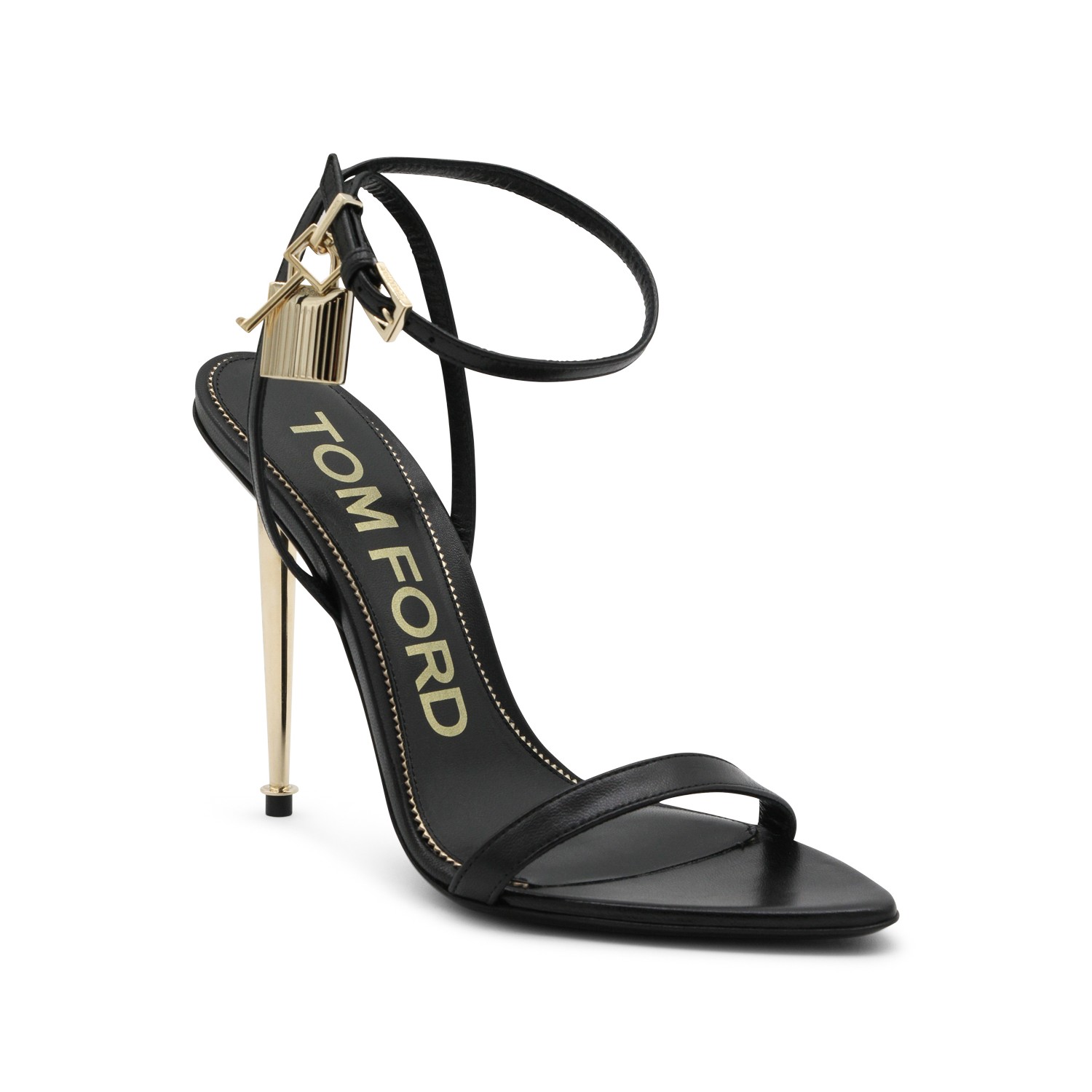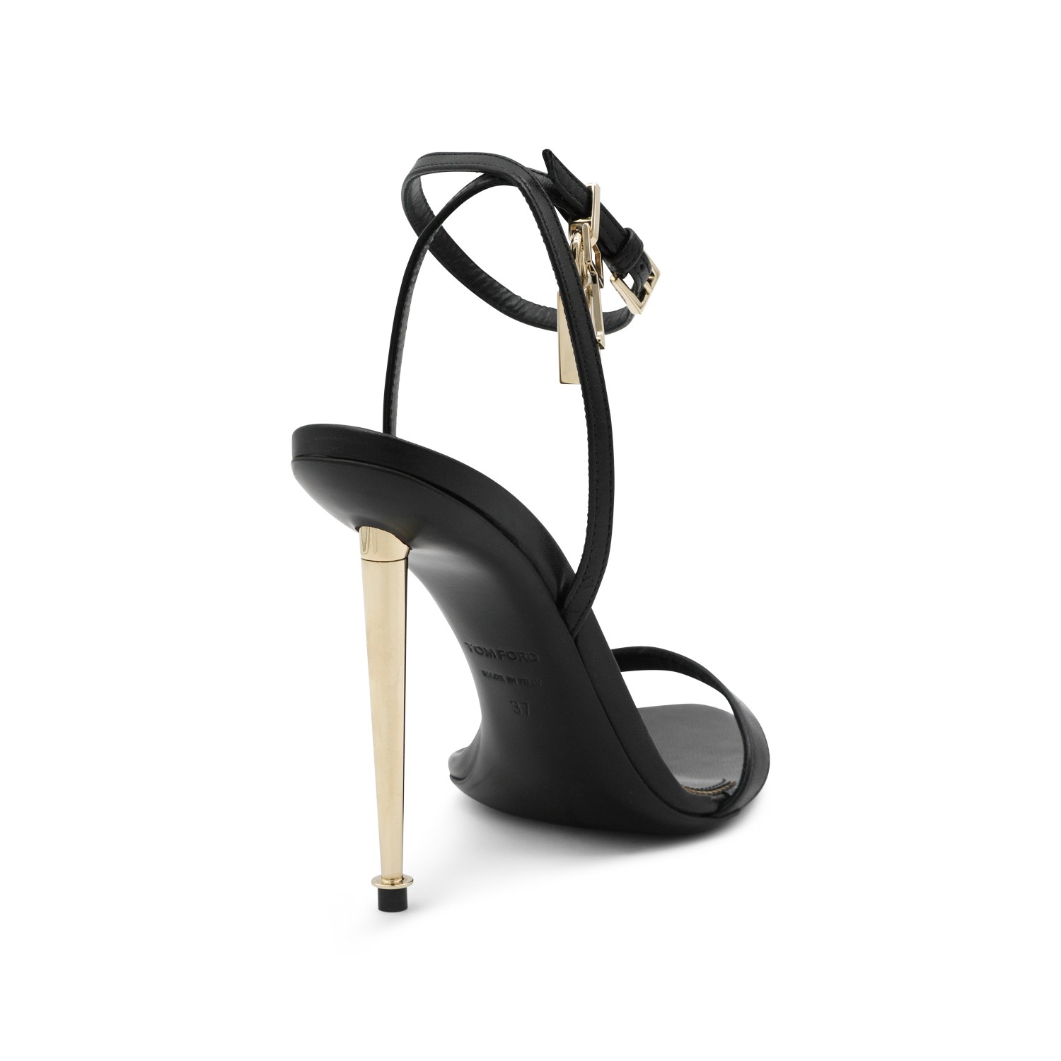 Black leather sandals from Tom Ford featuring open pointed toe, andjustable ankle strap, gold tone stiletto heel and gold tone charms.