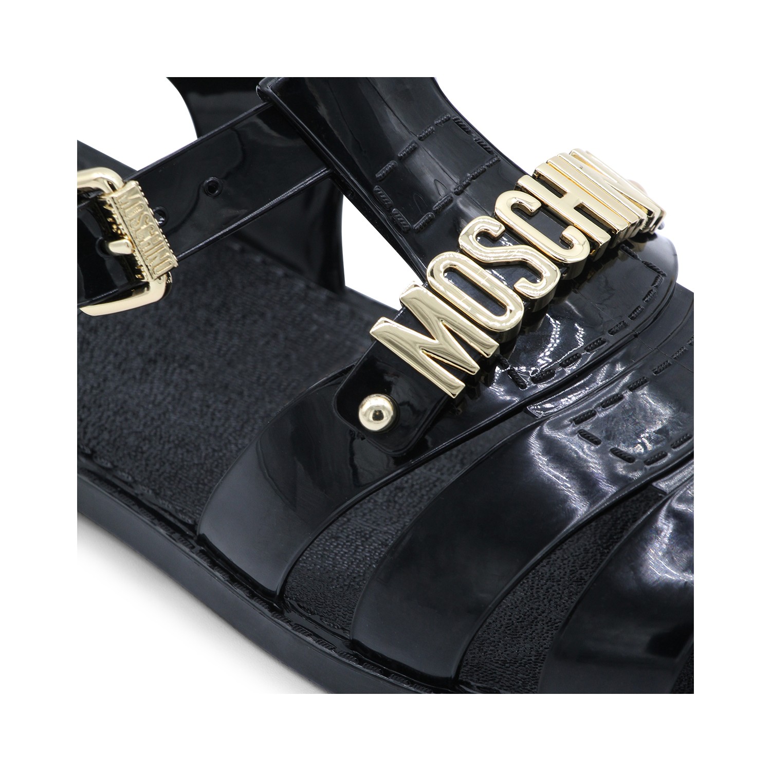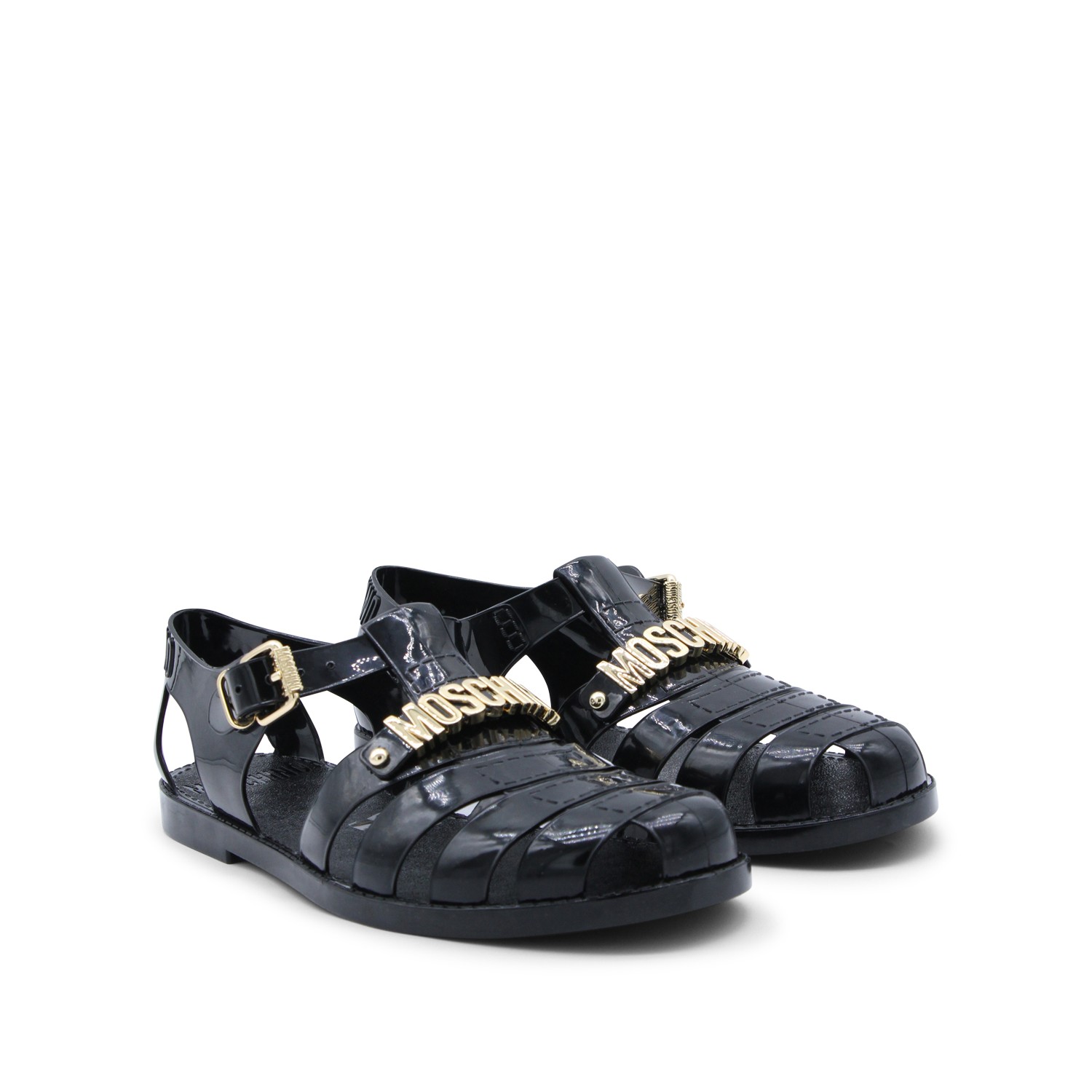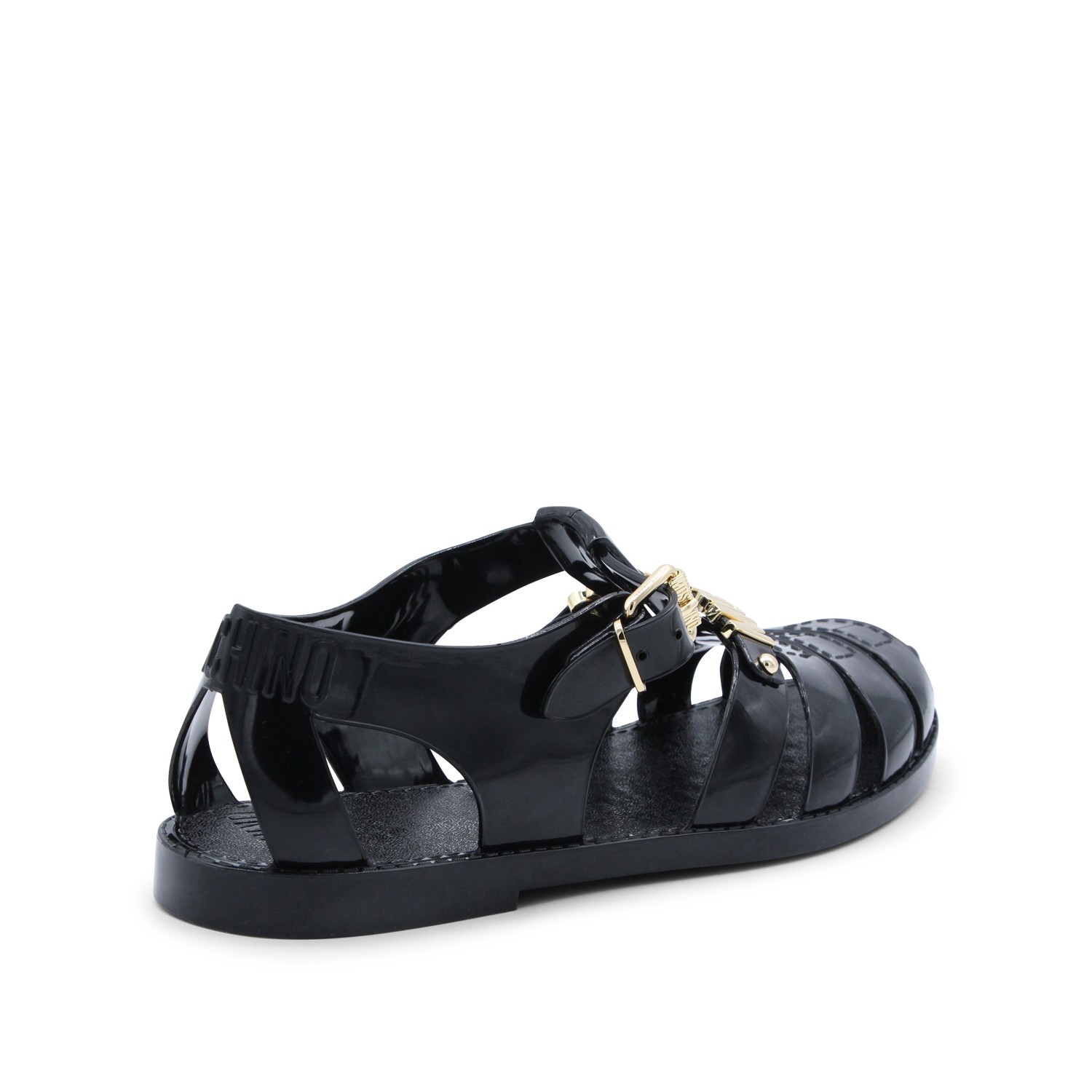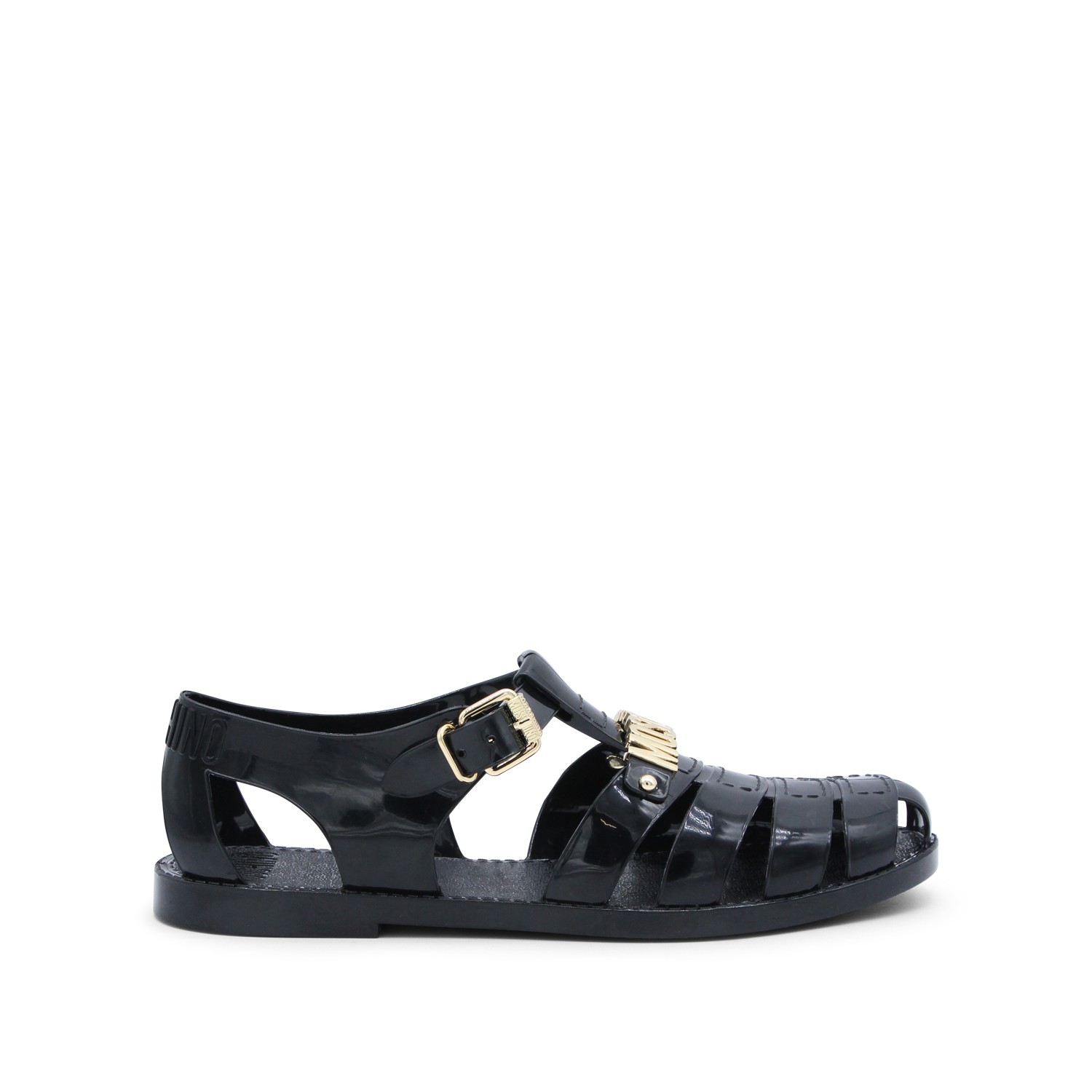 Black rubber sandals from Moschino featuring round open toe, gold metal lettering logo, ankle buckle fastening, branded insole and flat rubber sole.