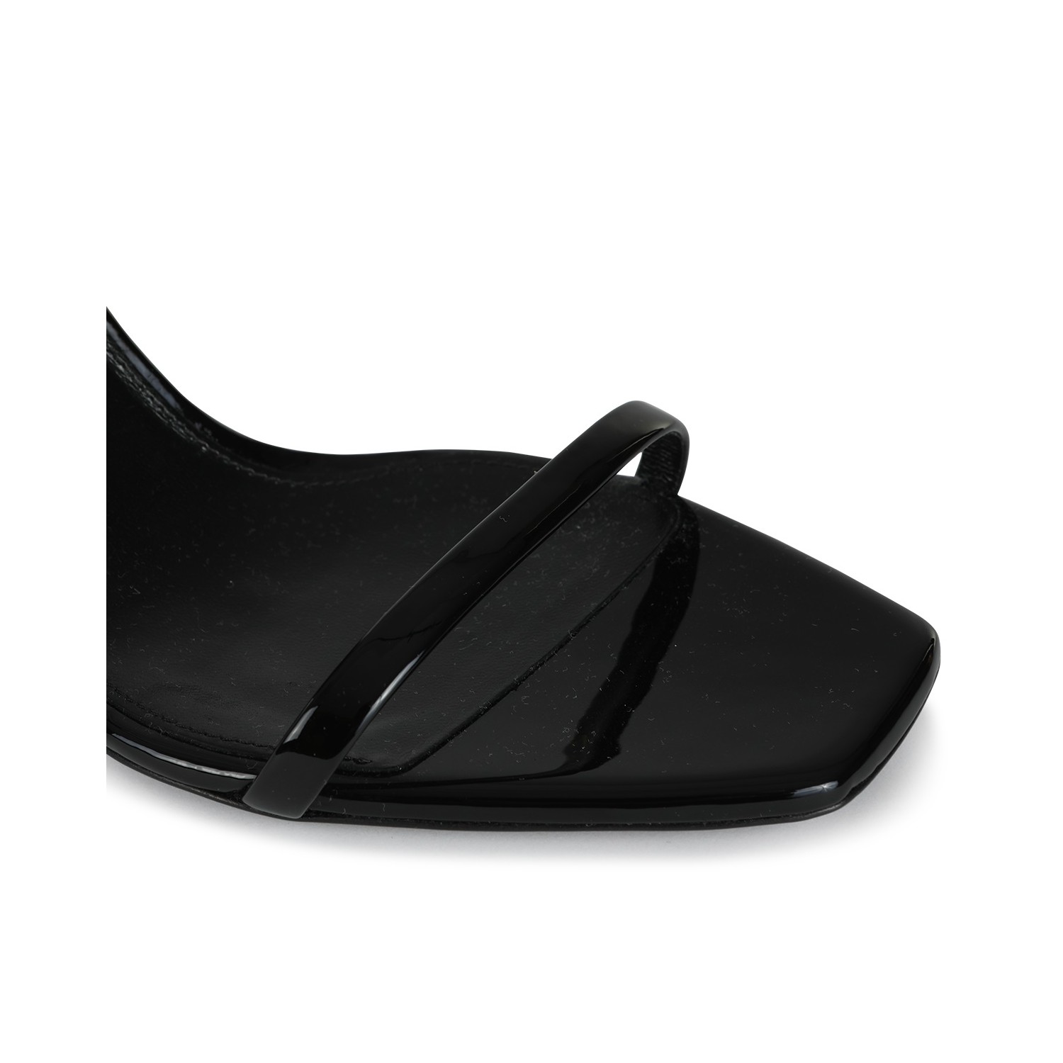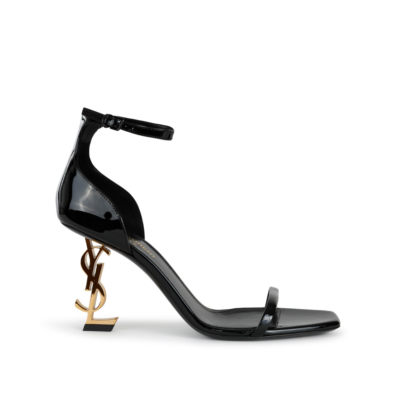 Black leather Opyum sandals from Saint Laurent featuring round open toe, YSL structured heel, ankle adjustable strap and patent finish.