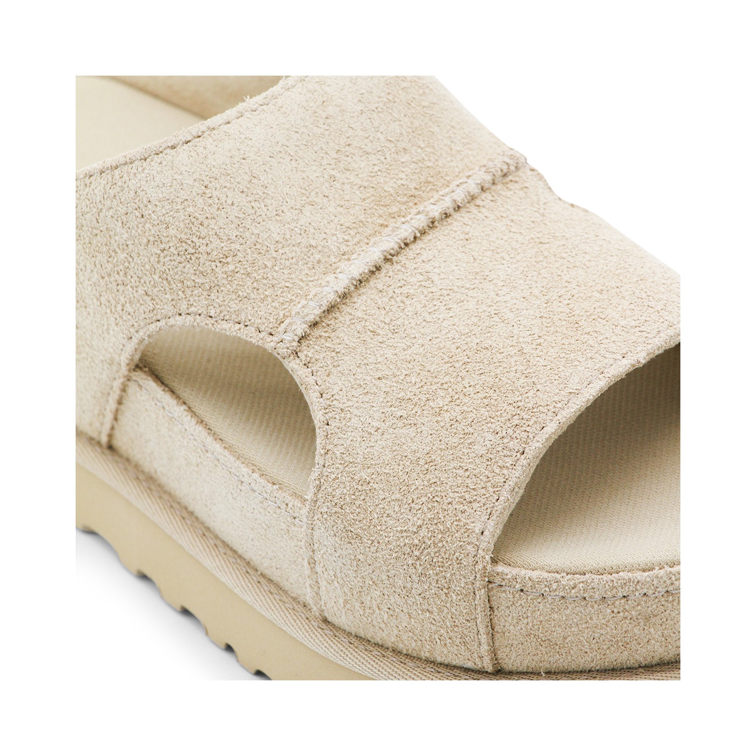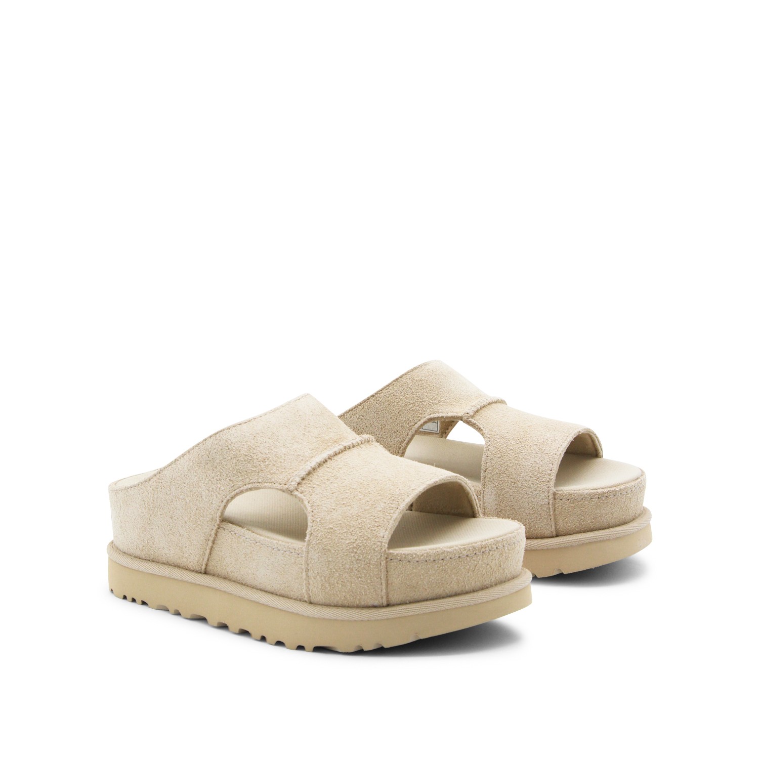 Beige Goldenstar sandals from Ugg featuring round open toe, leather sole, back logo and open back.