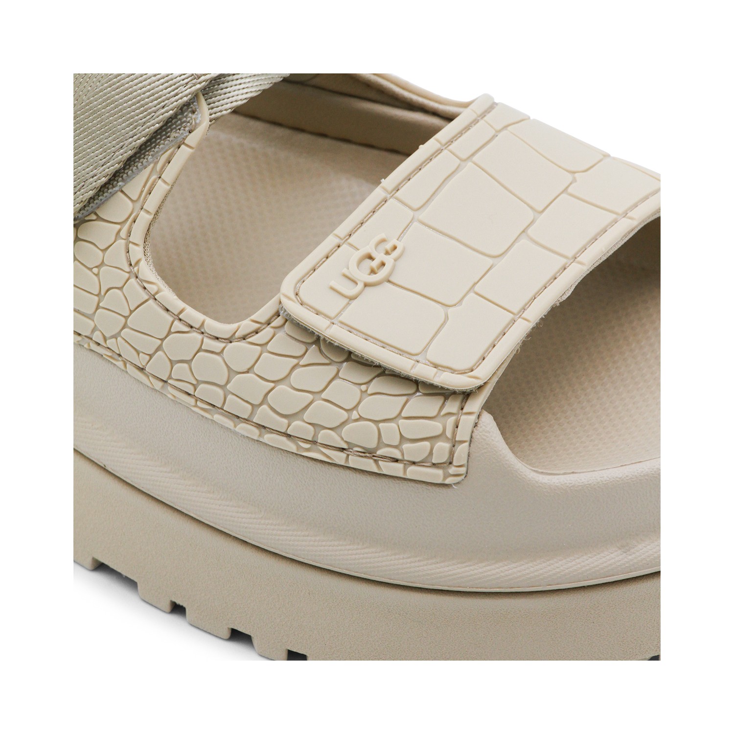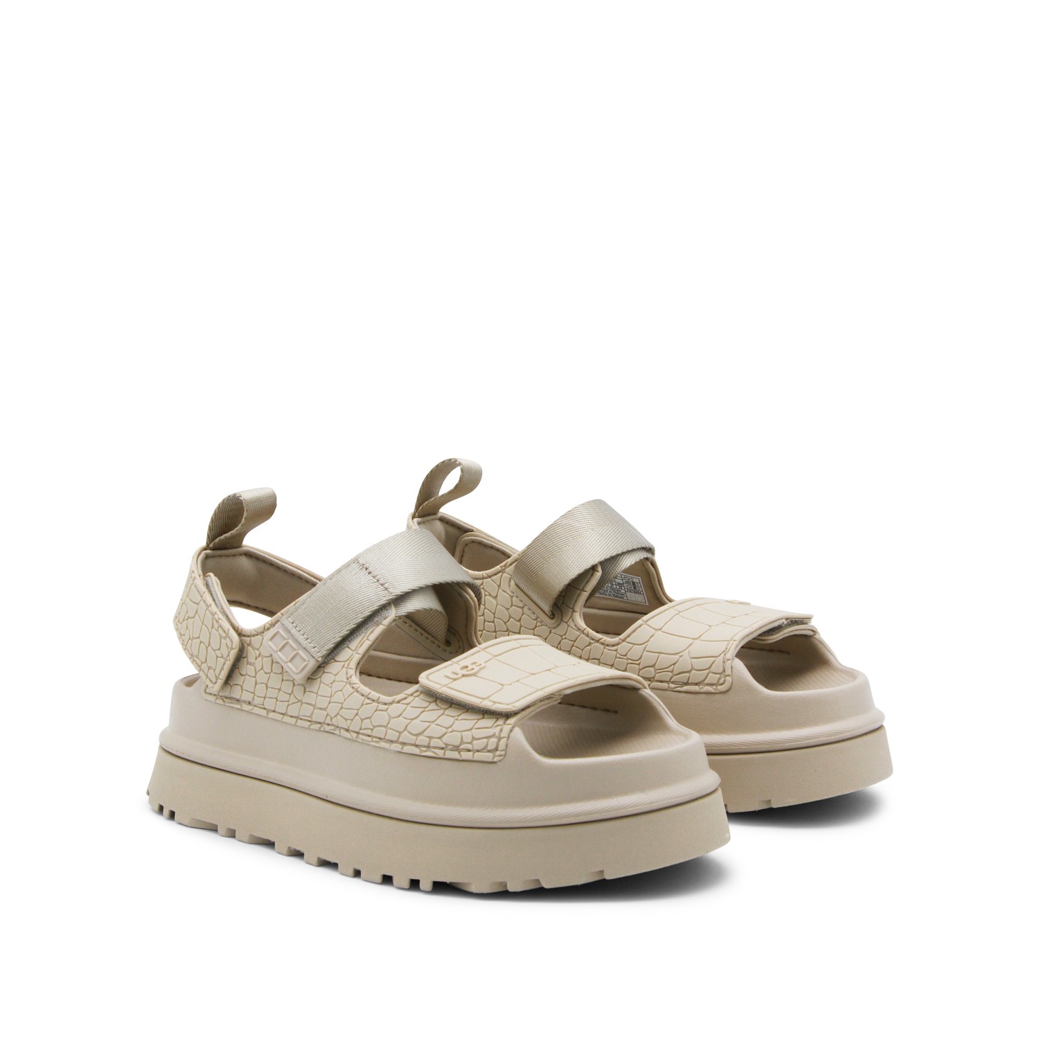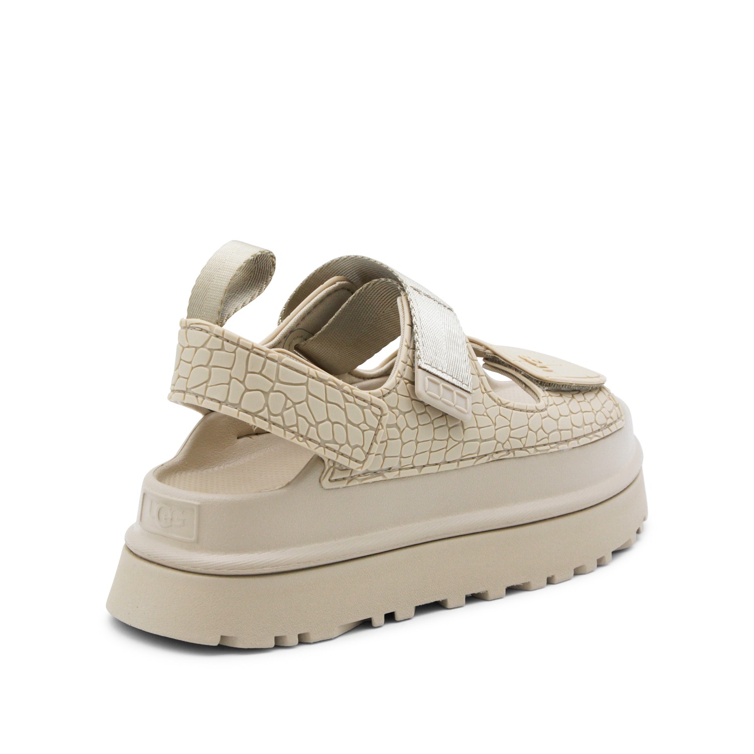 Beige Goldenglow sandals from Ugg featuring round open toe, oversize sole, back fastening and logo patch.