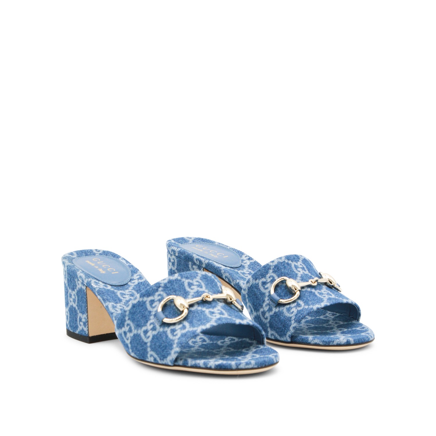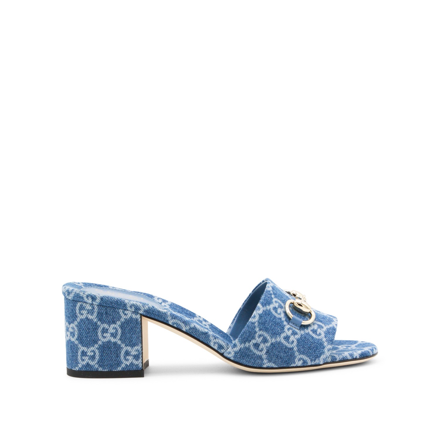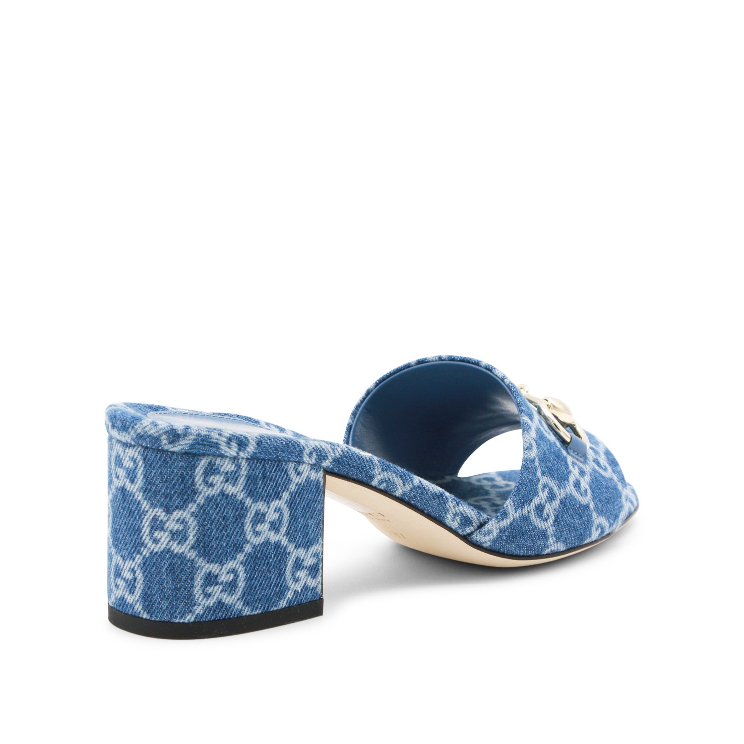 Blue cotton denim sandals from Gucci featuring round open toe, hardware detail, all over logo pattern, open back and square heel.