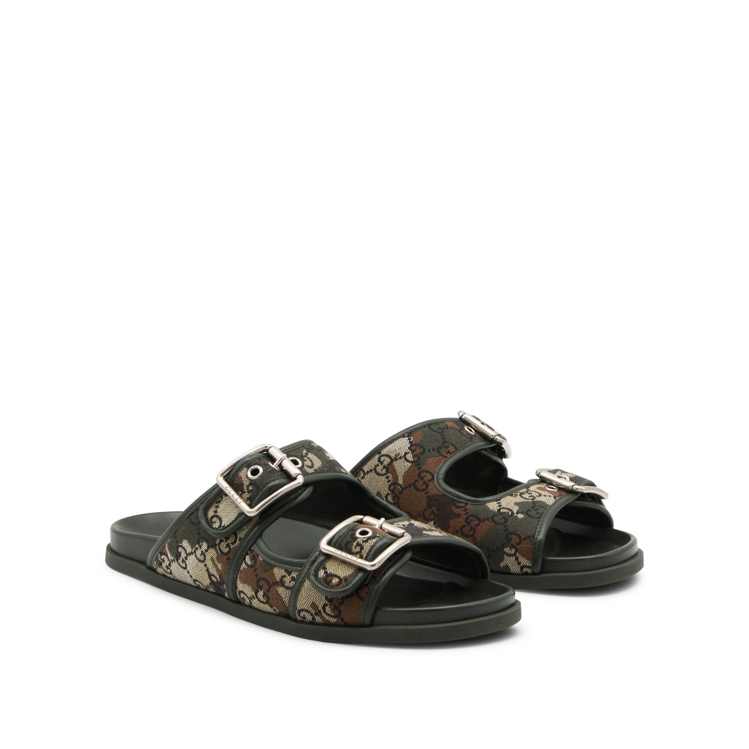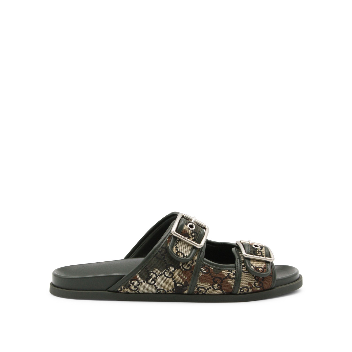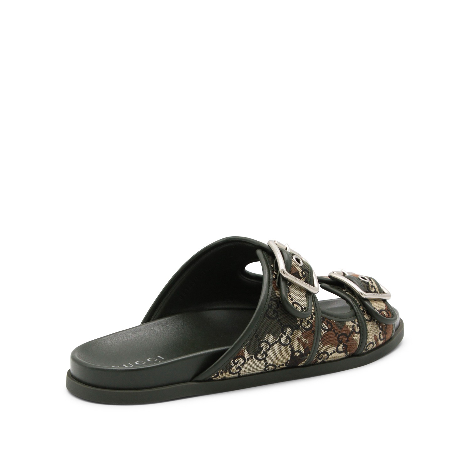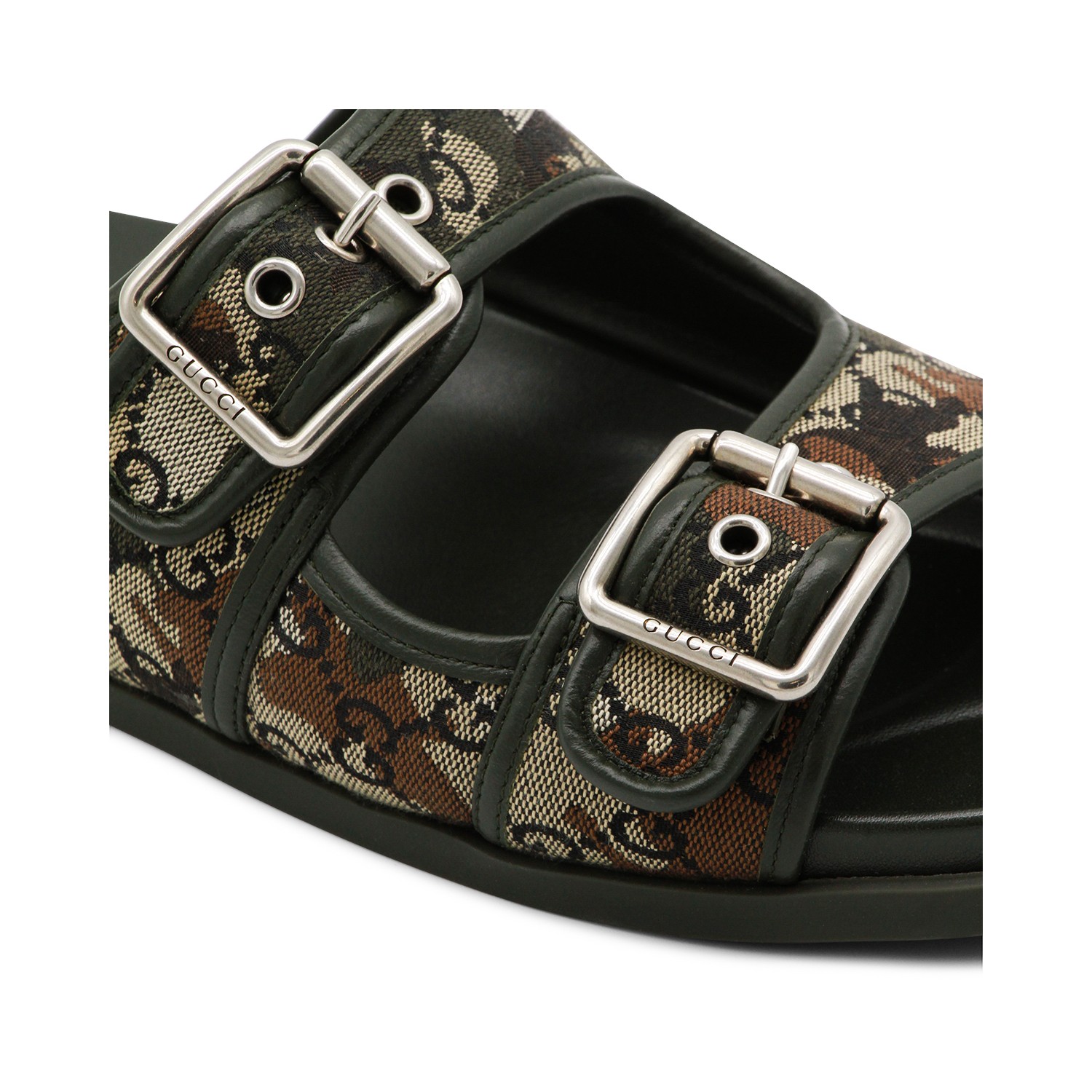 Black and beige leather sandals from Gucci featuring open round toe, double adjustable buckles, all-over GG texture, leather trims, slip-on style, open back, branded insole and flat rubber sole.